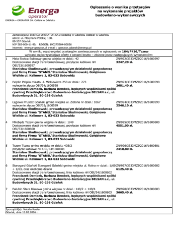 Ogłoszenie o wyniku przetargów na wykonanie projektów budowlano-wykonawczych ENERGA – OPERATOR SA. Oddział w Gdańsku Zamawiający: ENERGA-OPERATOR SA z siedzibą w Gdańsku Oddział w Gdańsku adres: ul. Marynarki Polskiej 130, 80-557 Gdańsk NIP 583-000-11-90; REGON: 190275904-00036 internet: energa-operator.pl e-mail : [email protected] 1 W wyniku rozstrzygnięć przetargów zamieszczonych w ogłoszeniu nr 164/P/16/Tczew wybrano najkorzystniejsze oferty z cenami brutto – złożone przez następujących Wykonawców: Mała Słońca Subkowy gmina wiejska nr dział.: 42 ZN/922/3333MZI/2016/1600597 Dostosowanie stacji transformatorowej, przyłącze kablowe nN 3247,20 zł. OBI/33/1600597 Stanisław Skulimowski, prowadzącą/ym działalność gospodarczą pod firmą Firma "STANEL"Stanisław Skulimowski, Gołębiewo Wielkie ul. Kalinowa 1, 83-033 Sobowidz 2 ZN/923/3333MZI/2016/1600598 Pelplin Pelplin miasto ul. Mickiewicza 25B nr dział.: 273 2681,40 zł. wplecenie złącza OBI/34/1600598 Franciszek Dembek, Barbara Dembek, będących wspólnikami spółki cywilnej Przedsiębiorstwo Budowlano-Instalacyjne BELSAN s.c., ul. Budowlanych 31, 80-298 Gdańsk 3 Łęgowo Pruszcz Gdański gmina wiejska ul. Zielona nr dział.: 1067 wplecenie złącza OBI/33/1600599 Stanisław Skulimowski, prowadzącą/ym działalność gospodarczą pod firmą Firma "STANEL"Stanisław Skulimowski, Gołębiewo Wielkie ul. Kalinowa 1, 83-033 Sobowidz ZN/924/3333MZI/2016/1600599 2546,10 zł. 4 Miłobądz Tczew gmina wiejska nr dział.: 1/49 Dostosowanie stacji transformatorowej, przyłącze kablowe nN OBI/33/1600600 Stanisław Skulimowski, prowadzącą/ym działalność gospodarczą pod firmą Firma "STANEL"Stanisław Skulimowski, Gołębiewo Wielkie ul. Kalinowa 1, 83-033 Sobowidz ZN/925/3333MZI/2016/1600600 4551,00 zł. 5 Tczew Tczew gmina miejska nr dział.: 405/2 przyłącze kablowe nN OBI/33/1600601 Stanisław Skulimowski, prowadzącą/ym działalność gospodarczą pod firmą Firma "STANEL"Stanisław Skulimowski, Gołębiewo Wielkie ul. Kalinowa 1, 83-033 Sobowidz ZN/926/3333MZI/2016/1600601 2410,80 zł. 6 Starogard Gdański Starogard Gdański gmina miejska ul. Rolna nr dział.: 1/60 ZN/927/3333MZI/2016/1600602 ÷ 1/63, oraz okoliczne działki 6125,40 zł. Dostosowanie stacji transformatorowej, linia kablowa nN OBI/34/1600602 Franciszek Dembek, Barbara Dembek, będących wspólnikami spółki cywilnej Przedsiębiorstwo Budowlano-Instalacyjne BELSAN s.c., ul. Budowlanych 31, 80-298 Gdańsk 7 Pałubin Stara Kiszewa gmina wiejska nr dział.: 149/2 ÷ 149/4 ZN/928/3333MZI/2016/1600603 Dostosowanie stacji transformatorowej, linia kablowa nN OBI/34/1600603 3665,40 zł. Franciszek Dembek, Barbara Dembek, będących wspólnikami spółki cywilnej Przedsiębiorstwo Budowlano-Instalacyjne BELSAN s.c., ul. Budowlanych 31, 80-298 Gdańsk Sporządził(a): Natalia Kosiła Gdańsk, dnia 18.03.2016 r. Ogłoszenie o wyniku przetargów na wykonanie projektów budowlano-wykonawczych ENERGA – OPERATOR SA. Oddział w Gdańsku .............................................................. /podpis/