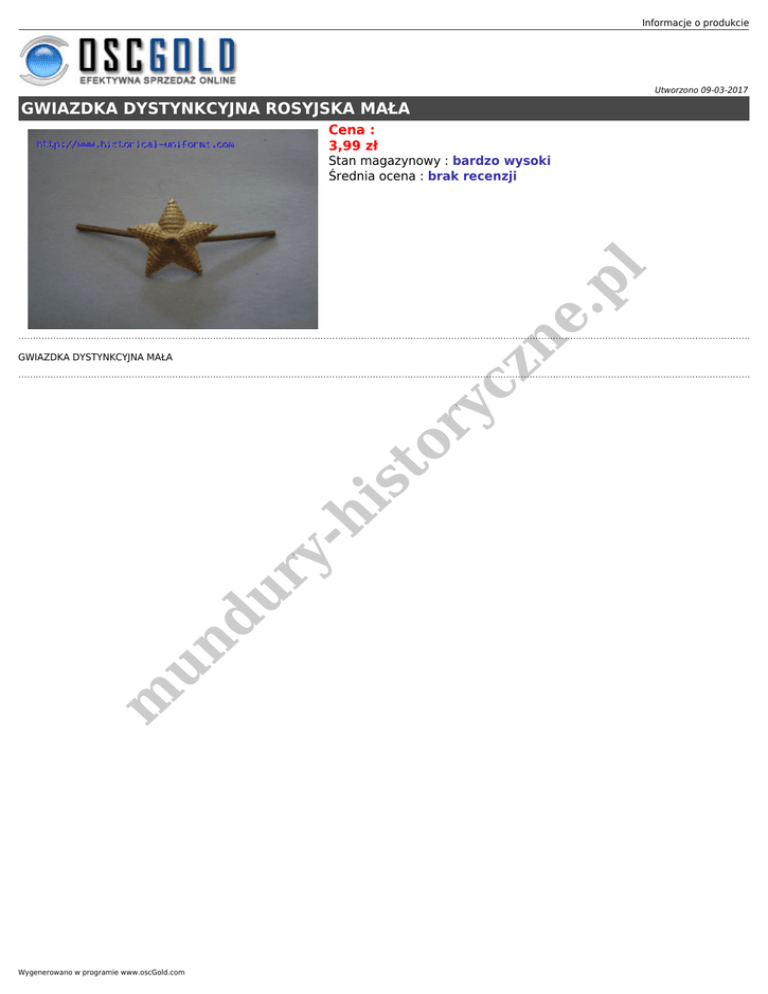 Informacje o produkcie Utworzono 09-03-2017 GWIAZDKA DYSTYNKCYJNA ROSYJSKA MAŁA Cena : 3,99 zł zn e .p l Stan magazynowy : bardzo wysoki Średnia ocena : brak recenzji m un du ry -h is to ry c GWIAZDKA DYSTYNKCYJNA MAŁA Wygenerowano w programie www.oscGold.com
