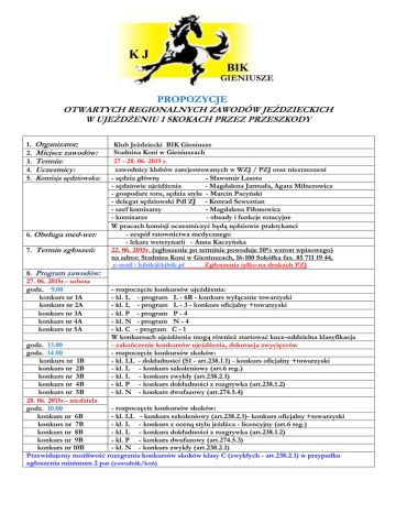 KJ BIK GIENIUSZE PROPOZYCJE OTWARTYCH REGIONALNYCH ZAWODÓW JEŹDZIECKICH W UJEśDśENIU I SKOKACH PRZEZ PRZESZKODY 1. 2. 3. 4. 5. Organizator: Miejsce zawodów: Termin: Uczestnicy: Komisja sędziowska: 6. Obsługa med-wet: 7. Termin zgłoszeń: 8. Program zawodów: 27. 06. 2015r.- sobota godz. 9.00 konkurs nr 1A konkurs nr 2A konkurs nr 3A konkurs nr 4A konkurs nr 5A Klub Jeździecki BIK Gieniusze Stadnina Koni w Gieniuszach 27 - 28. 06. 2015 r. zawodnicy klubów zarejestrowanych w WZJ / PZJ oraz niezrzeszeni - sędzia główny - Sławomir Lasota - sędziowie ujeŜdŜenia - Magdalena Jarmuła, Agata Milnerowicz - gospodarz toru, sędzia stylu - Marcin Pacyński - delegat sędziowski Pdl ZJ - Konrad Sewestian - szef komisarzy - Magdalena Fiłonowicz - komisarze - obsady i funkcje rotacyjne W pracach komisji uczestniczyć będą sędziowie praktykanci - zespół ratownictwa medycznego - lekarz weterynarii - Anna Kaczyńska 22. 06. 2015r. (zgłoszenie po terminie powoduje 50% wzrost wpisowego) na adres: Stadnina Koni w Gieniuszach, 16-100 Sokółka fax. 85 711 19 44, e-mail : [email protected] Zgłoszenia tylko na drukach PZJ - rozpoczęcie konkursów ujeŜdŜenia: - kl. L - program L - 6R - konkurs wyłącznie towarzyski - kl. L - program L - 3 - konkurs oficjalny +towarzyski - kl. P - program P - 4 - kl. N - program N - 4 - kl. C - program C - 1 W konkursach ujeŜdŜenia mogą równieŜ startować kuce-oddzielna klasyfikacja - zakończenie konkursów ujeŜdŜenia, dekoracja zwycięzców - rozpoczęcie konkursów skoków: - kl. LL - dokładności (S1 - art.238.1.1) - konkurs oficjalny +towarzyski - kl. L - konkurs szkoleniowy (art.6 reg.) - kl. L - konkurs zwykły (art.238.2.1) - kl. P - konkurs dokładności z rozgrywka (art.238.1.2) - kl. N - konkurs dwufazowy (art.274.5.4) godz. 13.00 godz. 14.00 konkurs nr 1B konkurs nr 2B konkurs nr 3B konkurs nr 4B konkurs nr 5B 28. 06. 2015r.- niedziela - rozpoczęcie konkursów skoków: godz. 10.00 konkurs nr 6B - kl. LL - konkurs szkoleniowy (art.238.2.1)- konkurs oficjalny +towarzyski konkurs nr 7B - kl. L - konkurs z oceną stylu jeźdźca - licencyjny (art.6 reg.) konkurs nr 8B - kl. L - konkurs dokładności z rozgrywka (art.238.1.2) konkurs nr 9B - kl. P - konkurs dwufazowy (art.274.5.3) konkurs nr 10B - kl. N - konkurs zwykły (art.238.2.1) Przewidujemy moŜliwość rozegrania konkursów skoków klasy C (zwykłych - art.238.2.1) w przypadku zgłoszenia minimum 2 par (zawodnik/koń) Konkursy rozgrywane będą przy minimum 2 zgłoszonych parach (koń/zawodnik). W konkursach skoków nr: 1B, 6B mogą równieŜ startować kuce(przeszkody będą obniŜone). Równolegle do konkursów nr: 2A, 1B, 6B na tych samych torach rozegrane zostaną konkursy towarzyskie, w których mogą startować zawodnicy nie posiadający licencji. Wyniki wszystkich konkursów ujeŜdŜenia i skoków zaliczone będą do rankingu Jeździeckiej Ligi Podlasia 2015. godz. 15.00 - uroczyste zakończenie konkursów skoków, dekoracja zwycięzców PATRONAT ZAWODÓW - STAROSTA POWIATU SOKÓLSKIEGO 9. Nagrody : Puchary i upominki zwycięzcom konkursów, medale, flot’s. 10. Plac konkursowy - parkur - podłoŜe piaszczyste (70x70), czworobok - podłoŜę piaszczyste RozpręŜalnia - podłoŜe trawiaste Parkur wyposaŜony w kłódki atestowane. 11. Sprawy organizacyjne: wysokość wpisowego - 50 zł od konia za kaŜdy dzień zawodów opłata za boks - 60 zł za całe zawody, 30 zł za 1 dzień wysokość startowego: - konkursy ujeŜdŜenia: w kl.L - 15zł, w kl. P - 20zł, w kl. N - 25 zł, w kl. C - 30 zł - konkursy skoków: w kl. LL - 10zł, w kl. L - 15zł, w kl. P - 20zł, w kl. N - 25zł, w kl.C - 30zł ( startowe w całości przeznaczone na nagrody ) Zgłoszenie na zawody jest równoznaczne z przyjęciem obowiązku wniesienia w/w opłat. Z obowiązku tego zwalnia tylko waŜna przyczyna losowa uniemoŜliwiająca przybycie na zawody zgłoszonych koni i zawodników. Wszelkie zmiany w zgłoszeniach po wyznaczonym terminie powodujące konieczność poprawek na listach startowych mogą być dokonane po uzgodnieniu z organizatorem oraz sędzią głównym zawodów i wniesieniu dodatkowej opłaty w wysokości 20 zł za kaŜdą zmianę. 12. Dokumenty, sprawy róŜne: - Zawodników i konie obowiązuje dokumentacja wg Regulaminów i Przepisów PZJ. W przypadku braku dokumentów zawodnika lub konia para nie będzie dopuszczona do startu w zawodach. - Wymagane są aktualne dokumenty identyfikacyjne oraz waŜne szczepienia przeciw grypie koni. - Organizator nie ponosi odpowiedzialności za kradzieŜe, wypadki i inne szkody mogące powstać w czasie trwania zawodów oraz transportu przed i po zawodach. - Zawody odbywają się zgodnie z Przepisami i Regulaminami PZJ. - Zawodnicy startujący w konkursach ujeŜdŜenia i skoków towarzyskich (1A, 2A, 1B, 6B) muszą posiadać aktualne badania lekarskie oraz ubezpieczenie NNW, a zawodnicy niepełnoletni - pisemną zgodę rodziców lub opiekunów prawnych na start w zawodach. Propozycje zgodne z kalendarzem imprez i zawodów Pdl ZJ. ZAPRASZAMY NA ZAWODY... ORGANIZATOR KLUB JEŹDZIECKI BIK GIENIUSZE Propozycje zatwierdzone przez Kolegium Sędziów PdlZJ WSZYSTKICH UCZESTNIKÓW ZAWODÓW OBOWIĄZUJE PRZESTRZEGANIE ZASAD DOBRZE ZNANEGO KODEKSU POSTĘPOWANIA Z KONIEM I. Na wszystkich etapach treningu i przygotowań z konia do startu w zawodach, dobro konia musi stać ponad wszelkimi innymi wymaganiami. Dotyczy to stałej opieki, metod treningu, starannego obrządku, kucia i transportu. II. Konie i jeźdźcy muszą być wytrenowani, kompetentni i zdrowi zanim wezmą udział w zawodach. Odnosi się to także do podawania leków i środków medycznych, zabiegów chirurgicznych zagrażających dobru konia lub ciąży klaczy, oraz do przypadków nadużywania pomocy. III. Zawody nie mogą zagrażać dobru konia. Wymaga to zwrócenia szczególnej uwagi na teren zawodów, powierzchnię podłoża, pogodę, warunki stajenne, kondycję koni i ich bezpieczeństwo t
