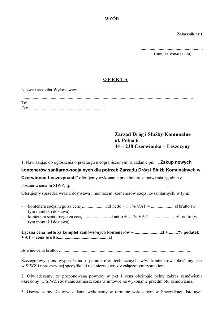 WZÓR Załącznik nr 1 ......................................................... (miejscowość i data) OFERTA Nazwa i siedziba Wykonawcy: ..................................................................................................... ........................................................................................................................................................ Tel .................................................................... Fax ................................................................... Zarząd Dróg i Służby Komunalne ul. Polna 6 44 – 238 Czerwionka – Leszczyny 1. Nawiązując do ogłoszenia o przetargu nieograniczonym na zadanie pn.: „Zakup nowych kontenerów sanitarno-socjalnych dla potrzeb Zarządu Dróg i Służb Komunalnych w Czerwionce-Leszczynach” oferujemy wykonanie przedmiotu zamówienia zgodnie z postanowieniami SIWZ, tj. Oferujemy sprzedaż wraz z dostwawą i montażem kontenerów socjalno-sanitarnych, w tym: kontenera socjalnego za cenę ...................... zł netto + .... % VAT = .................... zł brutto (w tym montaż i dostawa) kontenera sanitarnego za cenę ...................... zł netto + .... % VAT = .................... zł brutto (w tym montaż i dostawa) Łączna cena netto za komplet zamówionych kontenerów = .......................zł + ........% podatek VAT = cena brutto............................................ zł słownie cena brutto: .................................................................................................................... Szczegółowy opis wyposażenia i parametrów technicznych w/w kontenerów określony jest w SIWZ i uproszczonej specyfikacji technicznej wraz z załączonym rysunkiem 2. Oświadczamy, że proponowana powyżej w pkt 1 cena obejmuje pełny zakres zamówienia określony w SIWZ i zostanie zamieszczona w umowie na wykonanie przedmiotu zamówienia. 3. Oświadczamy, że w/w zadanie wykonamy w terminie wskazanym w Specyfikacji Istotnych Warunków Zamówienia tj.w terminie do 23 grudnia 2008r. od dnia podpisania umowy. 4. Oświadczamy, że na przedmiot zamówienia udzielamy .................................* miesięcy gwarancji od daty sprzedaży, (minimum 12 miesięcy) 5. Oświadczamy, że zapewnimy wykonanie obsługi serwisowej oraz obsługi i napraw gwarancyjnych a także usuwanie wad na terytorium RP, w promieniu do 100 km od siedziby Zarządu Dróg i Służb Komunalnych, ul. Polna 6, 44-238 Czerwionka-Leszczyny tj. : ..........................................................................................................................................................* ( podać adres serwisu i odległość w km –( maximum 60km) - od siedziby Zarządu Dróg i Służb Komunalnych ) 6. Oświadczamy, że zapoznaliśmy się ze Specyfikacją Istotnych Warunków Zamówienia i nie wnosimy do niej zastrzeżeń oraz, że zdobyliśmy konieczne informacje do przygotowania oferty. 7. Zakres zadania objętego zamówieniem zamierzamy wykonać sami (**)/ zamierzamy zlecić podwykonawcom (**) Następujące części zamówienia zamierzamy powierzyć podwykonawcom: Lp. Nazwa części zamówienia 8. Oświadczamy, że uważamy się za związanych niniejszą ofertą przez czas wskazany w Specyfikacji Istotnych Warunków Zamówienia. 9. Oświadczamy, że zawarte w Specyfikacji Istotnych Warunków Zamówienia postanowienia oraz wzór umowy zostały przez nas zaakceptowane i zobowiązujemy się w przypadku wyboru naszej oferty do zawarcia umowy na wyżej wymienionych warunkach w miejscu i terminie wyznaczonym przez Zamawiającego. 10. Osobami upoważnionymi do udzielania wszelkich wyjaśnień dotyczących złożonej oferty są : .................................................................................... 14.Załącznikami do niniejszej oferty są : 1) zestawienie porównawcze wymaganych warunków technicznych i minimalnego wyposażenia z wyposażeniem i parametrami technicznymi oferowanych kontenerów – wg wzoru załącznik Nr 1 do oferty, 2) parafowany wzór umowy – wg wzoru – załącznik Nr 2, 3) oświadczenie o nie podleganiu wykluczeniu i spełnianiu warunków wynikających z art. 22 ust. 1 i art. 24 ust. 1 i 2 ustawy – Prawo zamówień publicznych z dnia 29 stycznia 2004 r. (tekst jednolity Dz. U. z 2007 r. nr 223 poz.1655 ) - wg wzoru – załącznik Nr 3, 4) aktualne zaświadczenie właściwego naczelnika urzędu skarbowego potwierdzające odpowiednio, że Wykonawca nie zalega z opłacaniem podatków i opłat lub zaświadczenie, że uzyskał przewidziane prawem zwolnienie, odroczenie lub rozłożenie na raty zaległych płatności lub wstrzymanie w całości wykonania decyzji właściwego organu - wystawione nie wcześniej niż 3 miesiące przed upływem terminu składania ofert, 5) aktualne zaświadczenie właściwego oddziału ZUS lub KRUS potwierdzające odpowiednio, że Wykonawca nie zalega z opłacaniem składek na ubezpieczenie zdrowotne i społeczne lub zaświadczenie, że uzyskał przewidziane prawem zwolnienie, odroczenie lub rozłożenie na raty zaległych płatności lub wstrzymanie w całości wykonania decyzji właściwego organu wystawione nie wcześniej niż 3 miesiące przed upływem terminu składania ofert, 6) Aktualny odpis z właściwego rejestru**, zaświadczenie o wpisie do ewidencji działalności gospodarczej**, inny dokument ........................................ (wpisać jaki)** potwierdzający prawo do występowania w obrocie prawnym - wystawione nie wcześniej niż 6 m-cy przed upływem terminu składania ofert, 7) pełnomocnictwo do występowania przez podmioty wspólne ** 8) inne ..........................................................................................* .......................................................... podpis upoważnionego przedstawiciela Wykonawcy * - uzupełnić ** - niepotrzebne skreślić Nazwa i siedziba Wykonawcy: ....................................................................