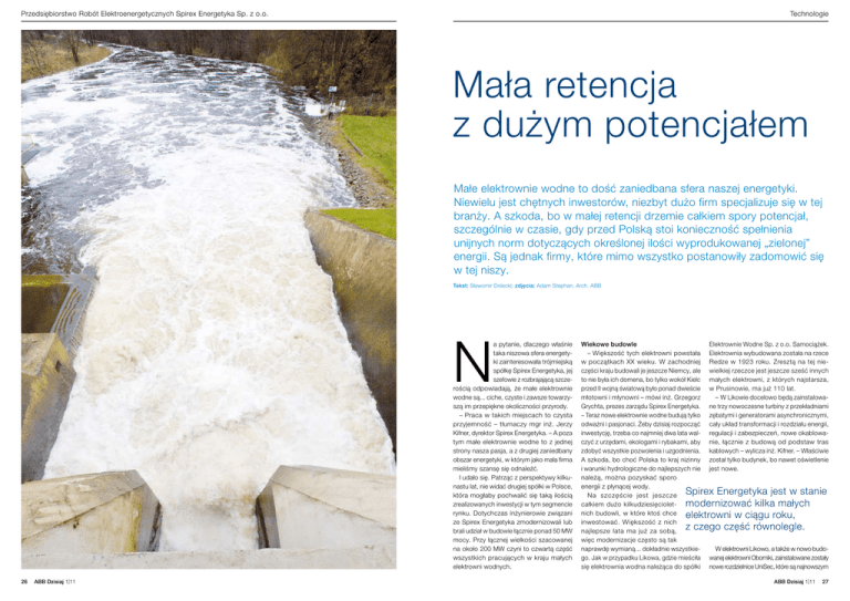 Przedsiębiorstwo Robót Elektroenergetycznych Spirex Energetyka Sp. z o.o. Technologie Mała retencja z dużym potencjałem Małe elektrownie wodne to dość zaniedbana sfera naszej energetyki. Niewielu jest chętnych inwestorów, niezbyt dużo firm specjalizuje się w tej branży. A szkoda, bo w małej retencji drzemie całkiem spory potencjał, szczególnie w czasie, gdy przed Polską stoi konieczność spełnienia unijnych norm dotyczących określonej ilości wyprodukowanej „zielonej” energii. Są jednak firmy, które mimo wszystko postanowiły zadomowić się w tej niszy. Tekst: Sławomir Dolecki; zdjęcia: Adam Stephan, Arch. ABB N a pytanie, dlaczego właśnie taka niszowa sfera energetyki zainteresowała trójmiejską spółkę Spirex Energetyka, jej szefowie z rozbrajającą szczerością odpowiadają, że małe elektrownie wodne są... ciche, czyste i zawsze towarzyszą im przepiękne okoliczności przyrody. – Praca w takich miejscach to czysta przyjemność – tłumaczy mgr inż. Jerzy Kifner, dyrektor Spirex Energetyka. – A poza tym małe elektrownie wodne to z jednej strony nasza pasja, a z drugiej zaniedbany obszar energetyki, w którym jako mała firma mieliśmy szansę się odnaleźć. I udało się. Patrząc z perspektywy kilkunastu lat, nie widać drugiej spółki w Polsce, która mogłaby pochwalić się taką ilością zrealizowanych inwestycji w tym segmencie rynku. Dotychczas inżynierowie związani ze Spirex Energetyka zmodernizowali lub brali udział w budowie łącznie ponad 50 MW mocy. Przy łącznej wielkości szacowanej na około 200 MW czyni to czwartą część wszystkich pracujących w kraju małych elektrowni wodnych. 26 ABB Dzisiaj 1|11 Wiekowe budowle Elektrownie Wodne Sp. z o.o. Samociążek. – Większość tych elektrowni powstała Elektrownia wybudowana została na rzece w początkach XX wieku. W zachodniej Redze w 1923 roku. Zresztą na tej nieczęści kraju budowali je jeszcze Niemcy, ale wielkiej rzeczce jest jeszcze sześć innych to nie była ich domena, bo tylko wokół Kielc małych elektrowni, z których najstarsza, przed II wojną światową było ponad dwieście w Prusinowie, ma już 110 lat. młotowni i młynowni – mówi inż. Grzegorz – W Likowie docelowo będą zainstalowaGrychta, prezes zarządu Spirex Energetyka. ne trzy nowoczesne turbiny z przekładniami – Teraz nowe elektrownie wodne budują tylko zębatymi i generatorami asynchronicznymi, odważni i pasjonaci. Żeby dzisiaj rozpocząć cały układ transformacji i rozdziału energii, inwestycję, trzeba co najmniej dwa lata wal- regulacji i zabezpieczeń, nowe okablowaczyć z urzędami, ekologami i rybakami, aby nie, łącznie z budową od podstaw tras zdobyć wszystkie pozwolenia i uzgodnienia. kablowych – wylicza inż. Kifner. – Właściwie A szkoda, bo choć Polska to kraj nizinny został tylko budynek, bo nawet oświetlenie i warunki hydrologiczne do najlepszych nie jest nowe. należą, można pozyskać sporo energii z płynącej wody. Na szczęście jest jeszcze Spirex Energetyka jest w stanie całkiem dużo kilkudziesięciolet- modernizować kilka małych nich budowli, w które ktoś chce elektrowni w ciągu roku, inwestować. Większość z nich z czego część równolegle. najlepsze lata ma już za sobą, więc modernizacje często są tak naprawdę wymianą... dokładnie wszystkieW elektrowni Likowo, a także w nowo budogo. Jak w przypadku Likowa, gdzie mieściła wanej elektrowni Oborniki, zainstalowane zostały się elektrownia wodna należąca do spółki nowe rozdzielnice UniSec, które są najnowszym ABB Dzisiaj 1|11 27