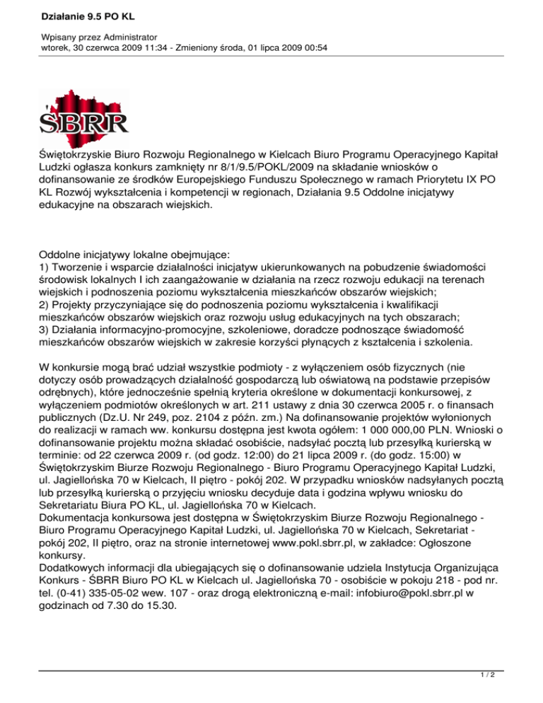 Działanie 9.5 PO KL Wpisany przez Administrator wtorek, 30 czerwca 2009 11:34 - Zmieniony środa, 01 lipca 2009 00:54 Świętokrzyskie Biuro Rozwoju Regionalnego w Kielcach Biuro Programu Operacyjnego Kapitał Ludzki ogłasza konkurs zamknięty nr 8/1/9.5/POKL/2009 na składanie wniosków o dofinansowanie ze środków Europejskiego Funduszu Społecznego w ramach Priorytetu IX PO KL Rozwój wykształcenia i kompetencji w regionach, Działania 9.5 Oddolne inicjatywy edukacyjne na obszarach wiejskich. Oddolne inicjatywy lokalne obejmujące: 1) Tworzenie i wsparcie działalności inicjatyw ukierunkowanych na pobudzenie świadomości środowisk lokalnych I ich zaangażowanie w działania na rzecz rozwoju edukacji na terenach wiejskich i podnoszenia poziomu wykształcenia mieszkańców obszarów wiejskich; 2) Projekty przyczyniające się do podnoszenia poziomu wykształcenia i kwalifikacji mieszkańców obszarów wiejskich oraz rozwoju usług edukacyjnych na tych obszarach; 3) Działania informacyjno-promocyjne, szkoleniowe, doradcze podnoszące świadomość mieszkańców obszarów wiejskich w zakresie korzyści płynących z kształcenia i szkolenia. W konkursie mogą brać udział wszystkie podmioty - z wyłączeniem osób fizycznych (nie dotyczy osób prowadzących działalność gospodarczą lub oświatową na podstawie przepisów odrębnych), które jednocześnie spełnią kryteria określone w dokumentacji konkursowej, z wyłączeniem podmiotów określonych w art. 211 ustawy z dnia 30 czerwca 2005 r. o finansach publicznych (Dz.U. Nr 249, poz. 2104 z późn. zm.) Na dofinansowanie projektów wyłonionych do realizacji w ramach ww. konkursu dostępna jest kwota ogółem: 1 000 000,00 PLN. Wnioski o dofinansowanie projektu można składać osobiście, nadsyłać pocztą lub przesyłką kurierską w terminie: od 22 czerwca 2009 r. (od godz. 12:00) do 21 lipca 2009 r. (do godz. 15:00) w Świętokrzyskim Biurze Rozwoju Regionalnego - Biuro Programu Operacyjnego Kapitał Ludzki, ul. Jagiellońska 70 w Kielcach, II piętro - pokój 202. W przypadku wniosków nadsyłanych pocztą lub przesyłką kurierską o przyjęciu wniosku decyduje data i godzina wpływu wniosku do Sekretariatu Biura PO KL, ul. Jagiellońska 70 w Kielcach. Dokumentacja konkursowa jest dostępna w Świętokrzyskim Biurze Rozwoju Regionalnego Biuro Programu Operacyjnego Kapitał Ludzki, ul. Jagiellońska 70 w Kielcach, Sekretariat pokój 202, II piętro, oraz na stronie internetowej www.pokl.sbrr.pl, w zakładce: Ogłoszone konkursy. Dodatkowych informacji dla ubiegających się o dofinansowanie udziela Instytucja Organizująca Konkurs - ŚBRR Biuro PO KL w Kielcach ul. Jagiellońska 70 - osobiście w pokoju 218 - pod nr. tel. (0-41) 335-05-02 wew. 107 - oraz drogą elektroniczną e-mail: [email protected] w godzinach od 7.30 do 15.30. 1/2 Działanie 9.5 PO KL Wpisany przez Administrator wtorek, 30 czerwca 2009 11:34 - Zmieniony środa, 01 lipca 2009 00:54 Dokumentacja konkursowa 9.5 Załączniki 2/2