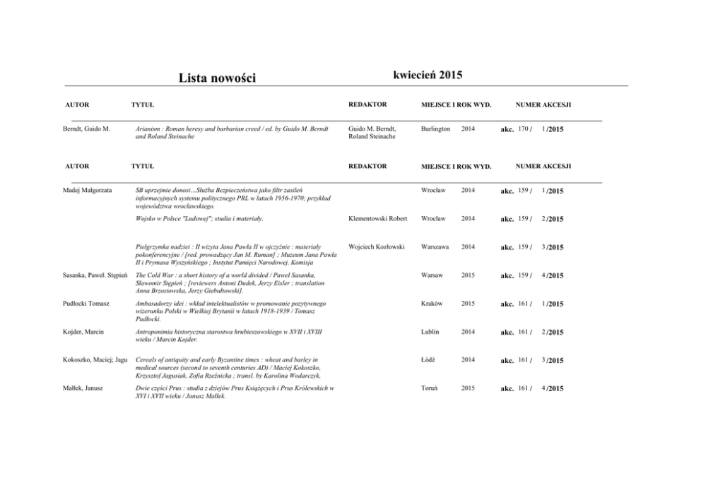 kwiecień 2015 Lista nowości AUTOR Berndt, Guido M. AUTOR Madej Małgorzata TYTUŁ Arianism : Roman heresy and barbarian creed / ed. by Guido M. Berndt and Roland Steinache TYTUŁ REDAKTOR MIEJSCE I ROK WYD. Guido M. Berndt, Roland Steinache Burlington REDAKTOR MIEJSCE I ROK WYD. SB uprzejmie donosi…Służba Bezpieczeństwa jako filtr zasileń informacyjnych systemu politycznego PRL w latach 1956-1970; przykład województwa wrocławskiego. 2014 NUMER AKCESJI akc. 170 / 1 /2015 NUMER AKCESJI Wrocław 2014 akc. 159 / 1 /2015 Wojsko w Polsce "Ludowej"; studia i materiały. Klementowski Robert Wrocław 2014 akc. 159 / 2 /2015 Pielgrzymka nadziei : II wizyta Jana Pawła II w ojczyźnie : materiały pokonferencyjne / [red. prowadzący Jan M. Ruman] ; Muzeum Jana Pawła II i Prymasa Wyszyńskiego ; Instytut Pamięci Narodowej. Komisja Wojciech Kozłowski Warszawa 2014 akc. 159 / 3 /2015 Sasanka, Paweł. Stępień The Cold War : a short history of a world divided / Paweł Sasanka, Sławomir Stępień ; [reviewers Antoni Dudek, Jerzy Eisler ; translation Anna Brzostowska, Jerzy Giebułtowski]. Warsaw 2015 akc. 159 / 4 /2015 Pudłocki Tomasz Ambasadorzy idei : wkład intelektualistów w promowanie pozytywnego wizerunku Polski w Wielkiej Brytanii w latach 1918-1939 / Tomasz Pudłocki. Kraków 2015 akc. 161 / 1 /2015 Kojder, Marcin Antroponimia historyczna starostwa hrubieszowskiego w XVII i XVIII wieku / Marcin Kojder. Lublin 2014 akc. 161 / 2 /2015 Kokoszko, Maciej; Jagu Cereals of antiquity and early Byzantine times : wheat and barley in medical sources (second to seventh centuries AD) / Maciej Kokoszko, Krzysztof Jagusiak, Zofia Rzeźnicka ; transl. by Karolina Wodarczyk, Łódź 2014 akc. 161 / 3 /2015 Małłek, Janusz Dwie części Prus : studia z dziejów Prus Książęcych i Prus Królewskich w XVI i XVII wieku / Janusz Małłek. Toruń 2015 akc. 161 / 4 /2015 AUTOR TYTUŁ REDAKTOR MIEJSCE I ROK WYD. NUMER AKCESJI Świątek Adam Gente Rutheni, natione Poloni : z dziejów Rusinów narodowości polskiej w Galicji / Adam Świątek. Kraków 2014 akc. 161 / 5 /2015 Zielonka, Zbigniew Henryk Prawy / Zbigniew Zielonka ; [ilustracje Piotr Namiota oraz zbiory własne Wydawnictwa]. Poznań 2015 akc. 161 / 6 /2015 Warszawa 2014 akc. 161 / 8 /2015 Oświęcim 2015 akc. 161 / 9 /2015 Kampania polska 1939 r. : polityka, społeczeństwo, kultura : praca zbiorowa. T. 2, Polityka i społeczeństwo : imponderabilia, pamięć, kultura / pod red. Marka Piotra Deszczyńskiego i Tymoteusza Pawłowskiego ; Baczkowski, Krzysztof Mark Piotr Deszczyński Kongres wiedeński 1515 roku / Krzysztof Baczkowski. Różnymi drogami do niepodległości : studia z historii najnowszej / pod red. Barbary Świtalskiej i Małgorzaty Żuławnik. Barbara Świtalska, Małgorzata Żuławnik Warszawa 2014 akc. 161 / 10 /2015 Stanisław Orzechowski : pisarz polityczny : materiały z konferencji naukowej w pięćsetlecie urodzin renesansowego humanisty : Przemyśl Żurawica 17-18 października 2013 / pod red. Jana Musiała. Jan Musiał Przemyśl 2014 akc. 161 / 11 /2015 Büthner-Zawadzka, Mał Warszawa w oczach pisarek : obraz i doświadczenie miasta w polskiej prozie kobiecej 1864-1939 / Małgorzata Büthner-Zawadzka. Warszawa 2014 akc. 161 / 12 /2015 Halsall, Guy Wojna a społeczeństwo w barbarzyńskiej Europie Zachodniej 450-900 / Guy Halsall ; [tłumaczenie i redakcja Konrad Ziółkowski]. Oświęcim 2015 akc. 161 / 13 /2015 Kopciowski Adam Wos hert zich in der prowinc? : prasa żydowska na Lubelszczyźnie i jej największy dziennik "Lubliner Tugblat" / Adam Kopciowski. Lublin 2015 akc. 161 / 14 /2015 Potocka Joanna Wszystko, co kochałam : Dziennik z lat 1914-1919 / Joanna Potocka ; wprowadzenie i opracowanie Grażyna Rolak. Wrocław 2014 akc. 161 / 15 /2015 Małecki, Marian Wydział Krajowy Sejmu Galicyjskiego : geneza, struktura i zakres kompetencji, następstwo prawne / Marian Małecki. Kraków 2014 akc. 161 / 16 /2015 Bondyra, Wiesław Własność ziemska w województwie bełskim w czasach saskich / Wiesław Bondyra ; [recenzent Jacek Pielas ; redakcja Barbara Paprocka ; redakcja techniczna Roman Fiut]. Lublin 2015 akc. 161 / 17 /2015 AUTOR TYTUŁ REDAKTOR MIEJSCE I ROK WYD. NUMER AKCESJI Pruszak, Tomasz Adam Ziemiańskie święta i zabawy : tradycje karnawałowe, ślubne, dożynkowe i inne / aut. Tomasz Adam Pruszak ; wybór zdjęć Barbara Chmielarska-Łoś ; projekt graficzny Zbigniew Karaszewski. Warszawa 2012 akc. 161 / 18 /2015 Heuclin Jean Hommes de Dieu et fonctionnaires du Roi en Gaule du Nord du Ve au IXe siècle / Jean Heuclin A 1998 akc. 162 / 1 /2015 Moreira Isabel Heaven's purge : purgatory in late antiquity / Isabel Moreira. Oxford 2010 akc. 163 / 2 /2015 Wickham Chris Framing the early middle ages : Europe and the Mediterranean 400-800 / Chris Wickham. Oxford 2006 akc. 163 / 3 /2015 Burns, J. Patout Jr.; Jens Christianity in Roman Africa; the development of its practices and beliefs Cambridge 2014 akc. 164 / 1 /2015 Wallace-Hadrill, J.M. The fourth book of the Chronicle of Fredegar with its continuations = Fredegarii chronicorum liber quartus cum continuationibus Westport 1981 akc. 165 / 1 /2015 Warszawa 2015 akc. 166 / 1 /2015 Unia w Horodle na tle stosunków polsko-litewskich : od Krewa do Zaręczenia wzajemnego Obojga Narodów / pod redakcją Sławomira Górzyńskiego ; Stowarzyszenie Potomków Sejmu Wielkiego, Muzeum Sławomir Górski Starzyński, Marcin Das mittelalterliche Krakau : Der Stadtrat im Herrschaftsgefüge der polnischen Metropole / Marcin Starzyński. Aus dem Poln. übers. von Christian Prüfer Köln 2015 akc. 166 / 2 /2015 Dziubiński Andrzej Ostatnia krucjata : El-Ksar el-Kebir 1578 / Andrzej Dziubiński. Warszawa 2014 akc. 167 / 1 /2015 Rutkowska Grażyna Itinerarium króla Kazimierza Jagiellończyka 1440-1492 / Grażyna Rutkowska. Warszawa 2014 akc. 167 / 2 /2015 Warszawa 2014 akc. 167 / 3 /2015 Warszawa 2014 akc. 168 / 1 /2015 Drogi odrębne, drogi wspólne : problem specyfiki rozwoju hi
