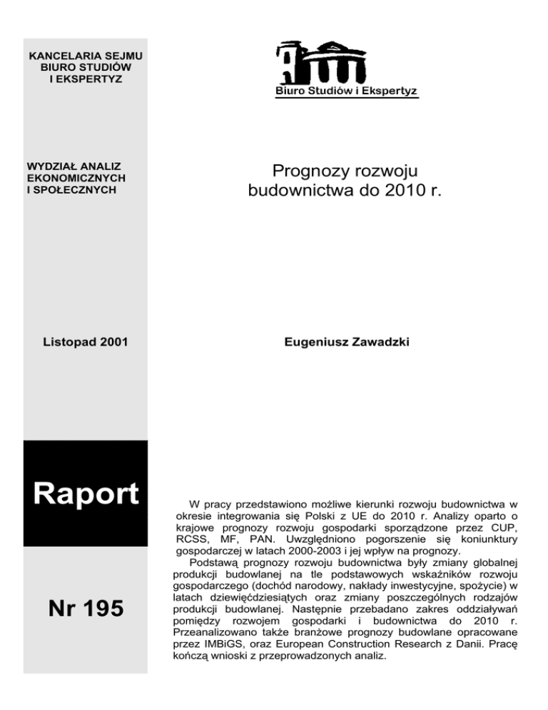 KANCELARIA SEJMU BIURO STUDIÓW I EKSPERTYZ WYDZIAŁ ANALIZ EKONOMICZNYCH I SPOŁECZNYCH Listopad 2001 Raport Nr 195 Prognozy rozwoju budownictwa do 2010 r. Eugeniusz Zawadzki W pracy przedstawiono możliwe kierunki rozwoju budownictwa w okresie integrowania się Polski z UE do 2010 r. Analizy oparto o krajowe prognozy rozwoju gospodarki sporządzone przez CUP, RCSS, MF, PAN. Uwzględniono pogorszenie się koniunktury gospodarczej w latach 2000-2003 i jej wpływ na prognozy. Podstawą prognozy rozwoju budownictwa były zmiany globalnej produkcji budowlanej na tle podstawowych wskaźników rozwoju gospodarczego (dochód narodowy, nakłady inwestycyjne, spożycie) w latach dziewięćdziesiątych oraz zmiany poszczególnych rodzajów produkcji budowlanej. Następnie przebadano zakres oddziaływań pomiędzy rozwojem gospodarki i budownictwa do 2010 r. Przeanalizowano także branżowe prognozy budowlane opracowane przez IMBiGS, oraz European Construction Research z Danii. Pracę kończą wnioski z przeprowadzonych analiz. BSiE 1 Spis treści Uwagi wprowadzające 3 I. Prognoza rozwoju budownictwa do 2010 r. opracowana przez Instytut Mechanizacji Budownictwa i Górnictwa Skalnego 4 1. Wariant szybkiego rozwoju budownictwa 4 2. Wariant umiarkowanego rozwoju budownictwa 4 3. Analiza wariantów 5 II. Możliwości rozwoju budownictwa wynikające ze strategii rozwoju społecznogospodarczego Polski do 2010 r. przygotowanej przez Centralny Urząd Planowania 8 1. Wariant „Hiszpania” 8 2. Wariant „Grecja” 9 3. Wariant kontynuacji 9 4. Porównanie wariantów rozwoju budownictwa z prognozy CUP 10 III. Podstawowe warianty rozwoju budownictwa do 2010 r. wynikające ze strategii finansów publicznych i rozwoju gospodarczego Polski w latach 2000-2010 wynikające z prognozy Ministerstwa Finansów 12 1. Wariant aktywny 12 2. Wariant ostrzegawczy 13 3. Wariant pasywny 13 4. Porównanie wariantów rozwoju budownictwa do 2010 r. 14 IV. Budownictwo w Polsce w latach 1998-2010 w świetle badań European Construction Research z Danii 17 1. Budownictwo mieszkaniowe 17 2. Budownictwo biurowe 17 3. Budownictwo hotelowe 18 4. Budownictwo handlowe 18 5. Budownictwo przemysłowe 18 6. Ocena wartości merytorycznej i przydatności prognozy ECR 18 2 BSiE V. Przekształcenia struktury budownictwa wynikające ze zmian struktury gospodarki w Polsce do 2010 r. opracowanej przez Komitet Prognoz "Polska w XXI wieku przy Prezydium PAN 20 1. Zakładane wskaźniki makroekonomiczne 20 2. Zmiany w poziomie i strukturze produkcji budowlano-montażowej 20 3. Zmiany w poziomie i strukturze zatrudnienia w budownictwie 21 4. Zmiany w poziomie i strukturze majątku trwałego w budownictwie 22 5. Zmiany w poziomie wydajności pracy i produktywności majątku w budownictwie 23 6. Ocena wartości merytorycznej prognoz 23 VI. Budownictwo w świetle strategii rozwoju Polski do roku 2020 przedstawionej przez Komitet Prognoz „Polska 2000 Plus” przy Prezydium PAN 24 1. Miejsce budownictwa w podstawowych makroproporcjach 24 2. Wielkość i struktura produkcji budowlanej na tle popytu inwestycyjnego i proporcji jego podziału 24 3. Rozwój budownictwa mieszkaniowego 25 VII. Porównanie podstawowych wskaźników rozwoju gospodarki i budownictwa do 2010 r. 28 VIII. Możliwy rozwój budownictwa do 2010 r. w świetle dotychczasowych badań prognostycznych 30 1. Krótkookresowe uwarunkowania rozwoju budownictwa 30 2. Wpływ bieżących uwarunkowań krótkookresowych na podstawowe proporcje rozwoju gospodarczego do 2010 r. 31 3. Możliwe kierunki rozwoju budownictwa do 2010 r. 32 4. Wnioski 33 Źródła wykorzystane 34 BSiE 3 Uwagi wprowadzające Występuje wyraźny związek pomiędzy aktywnością całej gospodarki Polski (wyrażoną w zmianach poziomu PKB, nakładów inwestycyjnych itp.) a wahaniami podstawowych wskaźników rozwoju budownictwa (produkcja budowlana, nakłady inwestycyjne w budownictwie, techniczne uzbrojenie pracy w przedsiębiorstwach budowlanych itp.). Współzależności te posiadają kluczowe znaczenie nie tylko w sensie poznawczym (analizy trendów), ale też z punktu widzenia prognozowania przyszłego rozwoju tego sektora w warunkach zmieniających się kierunków i dynamiki rozwoju całej gospodarki. Budownictwo, stanowiące jeden z podstawowych elementów rzeczowej struktury ekonomicznej kraju, nie może rozwijać się w oderwaniu od pozostałych sektorów gospodarki. Problemów budownictwa nie można zatem rozwiązywać bez uwzględniania zmian dokonujących się w jego bezpośrednim otoczeniu gospodarczym. Dowodzi tego analiza trendów rozwojowych, i to niezależnie od istniejących systemów społeczno-ekonomicznych (gospodarka centralnie kierowana, gospodarka rynkowa). Nic nie wskazuje na to by wspomniane współzależności między budownictwem a pozostałymi działami gospodarki narodowej miały ulec ograniczeniu w przyszłości. Ewentualnych zmian można byłoby się natomiast spodziewać w intensywności i charakterze tych związków będących rezultatem prowadzonej polityki gospodarczej. Celem niniejszego opracowania jest analiza prognoz rozwoju budownictwa do 2010 r.: a) opracowanych przez wyspecjalizowane ośrodki branżowe (IMBiGS oraz ECR); b) przez instytucje centralne (RCSS, MF, PAN); c) przedstawienie możliwych kierunków rozwoju budownictwa do 2010 r. w świetle powyższych prognoz oraz występujących uwarunkowań, w tym także z lat 20002002. Mimo, że w prognozach tych nie uwzględniono spadku aktywności polskiej gospodarki w latach 2000-2002 (sporządzane były w latach 1995-1999), to ich wartość merytoryczna polega na egzemplifikacji barier rozwoju gospodarki i budownictwa, stanowiąc jednocześnie obecnie wskazówkę jak rozwoju budownictwa nie można prognozować poprzez prostą ekstrapolację. 4 BSiE I. Prognoza rozwoju budownictwa do 2010 r. opracowana przez Instytut Mechanizacji i Górnictwa Skalnego1 Celem prognozy rozwoju budownictwa do 2010 r. opracowanej przez Instytut Mechanizacji 