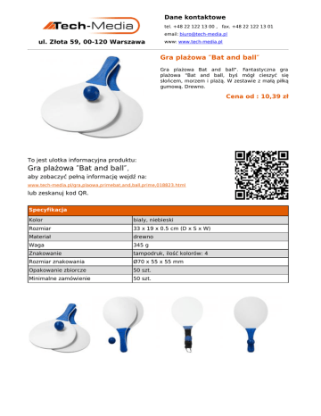 Dane kontaktowe tel. +48 22 122 13 00 , fax. +48 22 122 13 01 email: [email protected] ul. Złota 59, 00-120 Warszawa www: www.tech-media.pl Gra plażowa ″Bat and ball″ Gra plażowa Bat and ball". Fantastyczna gra plażowa "Bat and ball, byś mógł cieszyć się słońcem, morzem i plażą. W zestawie z małą piłką gumową. Drewno. Cena od : 10,39 zł To jest ulotka informacyjna produktu: Gra plażowa ″Bat and ball″ , aby zobaczyć pełną informację wejdź na: www.tech-media.pl/gra,plaowa,primebat,and,ball,prime,018823.html lub zeskanuj kod QR. Specyfikacja Kolor bialy, niebieski Rozmiar 33 x 19 x 0.5 cm (D x S x W) Materiał drewno Waga 345 g Znakowanie tampodruk, ilość kolorów: 4 Rozmiar znakowania Ø70 x 55 x 55 mm Opakowanie zbiorcze 50 szt. Minimalne zamówienie 50 szt.