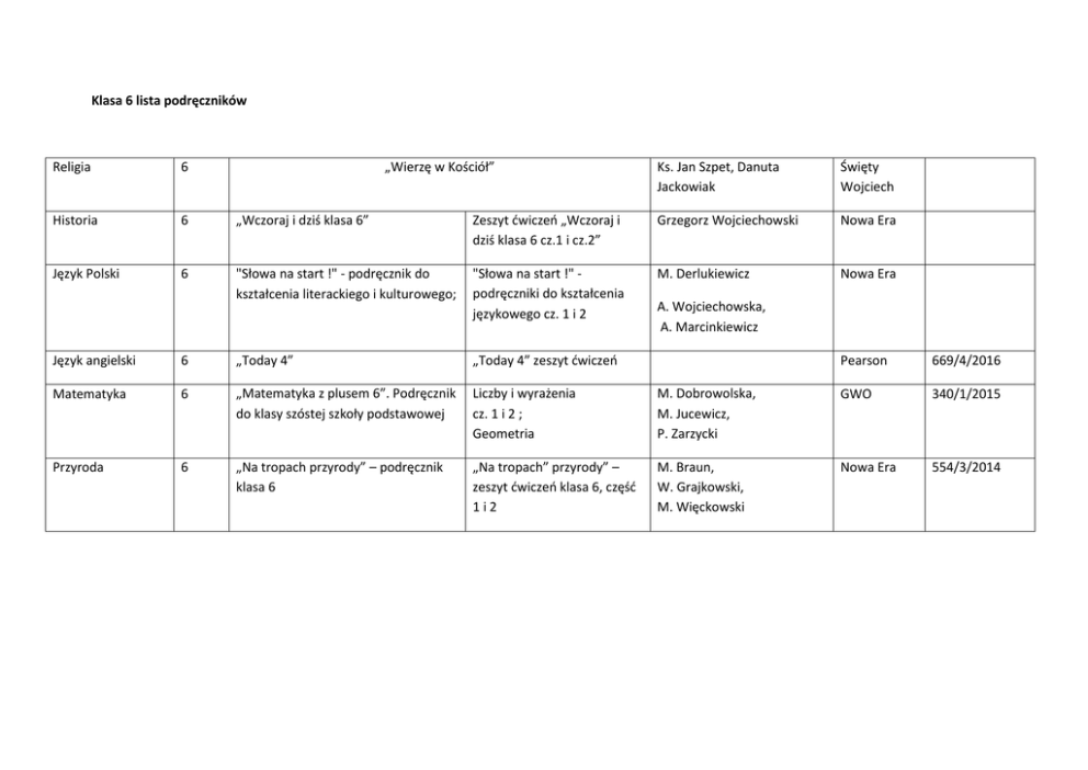 Klasa 6 lista podręczników Ks. Jan Szpet, Danuta Jackowiak Święty Wojciech Zeszyt ćwiczeń „Wczoraj i dziś klasa 6 cz.1 i cz.2” Grzegorz Wojciechowski Nowa Era "Słowa na start !" - podręcznik do kształcenia literackiego i kulturowego; "Słowa na start !" podręczniki do kształcenia językowego cz. 1 i 2 M. Derlukiewicz Nowa Era Religia 6 „Wierzę w Kościół” Historia 6 „Wczoraj i dziś klasa 6” Język Polski 6 Język angielski 6 „Today 4” „Today 4” zeszyt ćwiczeń Matematyka 6 „Matematyka z plusem 6”. Podręcznik do klasy szóstej szkoły podstawowej Liczby i wyrażenia cz. 1 i 2 ; Geometria Przyroda 6 „Na tropach przyrody” – podręcznik klasa 6 „Na tropach” przyrody” – zeszyt ćwiczeń klasa 6, część 1i2 A. Wojciechowska, A. Marcinkiewicz Pearson 669/4/2016 M. Dobrowolska, M. Jucewicz, P. Zarzycki GWO 340/1/2015 M. Braun, W. Grajkowski, M. Więckowski Nowa Era 554/3/2014