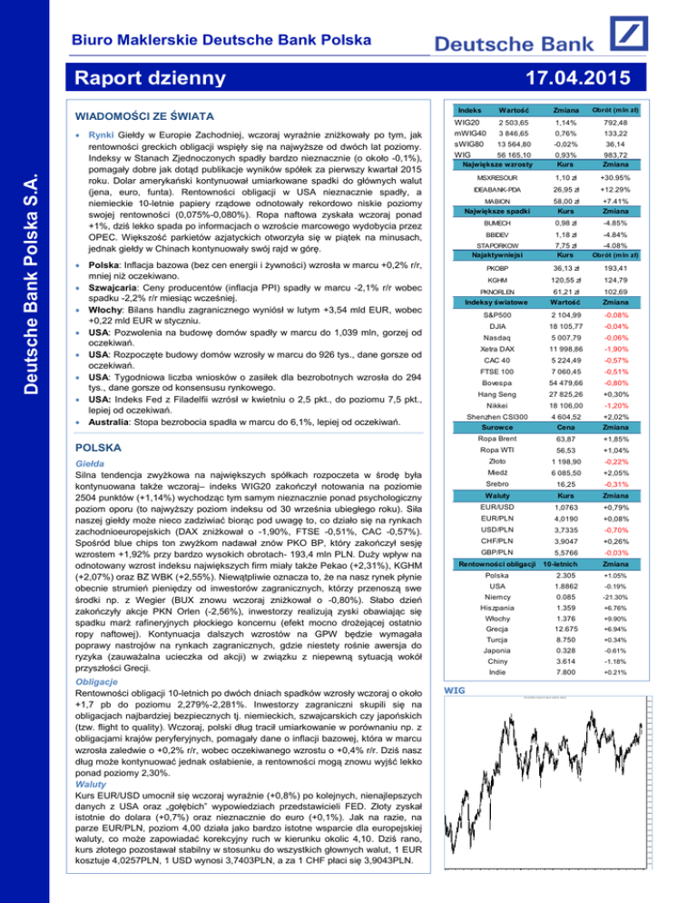 Biuro Maklerskie Deutsche Bank Polska Raport dzienny 17.04.2015 Deutsche Bank Polska S.A. WIADOMOŚCI ZE ŚWIATA Rynki Giełdy w Europie Zachodniej, wczoraj wyraźnie zniżkowały po tym, jak rentowności greckich obligacji wspięły się na najwyższe od dwóch lat poziomy. Indeksy w Stanach Zjednoczonych spadły bardzo nieznacznie (o około -0,1%), pomagały dobre jak dotąd publikacje wyników spółek za pierwszy kwartał 2015 roku. Dolar amerykański kontynuował umiarkowane spadki do głównych walut (jena, euro, funta). Rentowności obligacji w USA nieznacznie spadły, a niemieckie 10-letnie papiery rządowe odnotowały rekordowo niskie poziomy swojej rentowności (0,075%-0,080%). Ropa naftowa zyskała wczoraj ponad +1%, dziś lekko spada po informacjach o wzroście marcowego wydobycia przez OPEC. Większość parkietów azjatyckich otworzyła się w piątek na minusach, jednak giełdy w Chinach kontynuowały swój rajd w górę. Indeks Wartość Zmiana Obrót (m ln zł) WIG20 mWIG40 sWIG80 WIG 2 503,65 1,14% 792,48 3 846,65 0,76% 133,22 13 564,80 -0,02% 36,14 56 165,10 Największe wzrosty 0,93% Kurs 983,72 Zmiana MSXRESOUR 1,10 zł +30.95% IDEABANK-PDA 26,95 zł +12.29% MABION Największe spadki 58,00 zł Kurs +7.41% Zmiana BUMECH 0,98 zł -4.85% BBIDEV 1,18 zł -4.84% STAPORKOW 7,75 zł Kurs Obrót (m ln zł) PKOBP 36,13 zł 193,41 KGHM 120,55 zł 124,79 PKNORLEN 61,21 zł Wartość 102,69 Zmiana S&P500 2 104,99 -0,08% DJIA 18 105,77 -0,04% Nasdaq 5 007,79 -0,06% Xetra DAX 11 998,86 -1,90% CAC 40 5 224,49 -0,57% FTSE 100 7 060,45 -0,51% Bovespa 54 479,66 -0,80% Hang Seng 27 825,26 +0,30% Nikkei 18 106,00 -1,20% Shenzhen CSI300 4 604,52 +2,02% Najaktywniejsi Polska: Inflacja bazowa (bez cen energii i żywności) wzrosła w marcu +0,2% r/r, mniej niż oczekiwano. Szwajcaria: Ceny producentów (inflacja PPI) spadły w marcu -2,1% r/r wobec spadku -2,2% r/r miesiąc wcześniej. Włochy: Bilans handlu zagranicznego wyniósł w lutym +3,54 mld EUR, wobec +0,22 mld EUR w styczniu. USA: Pozwolenia na budowę domów spadły w marcu do 1,039 mln, gorzej od oczekiwań. USA: Rozpoczęte budowy domów wzrosły w marcu do 926 tys., dane gorsze od oczekiwań. USA: Tygodniowa liczba wniosków o zasiłek dla bezrobotnych wzrosła do 294 tys., dane gorsze od konsensusu rynkowego. USA: Indeks Fed z Filadelfii wzrósł w kwietniu o 2,5 pkt., do poziomu 7,5 pkt., lepiej od oczekiwań. a Australia: Stopa bezrobocia spadła w marcu do 6,1%, lepiej od oczekiwań. Indeksy światowe POLSKA Giełda Silna tendencja zwyżkowa na największych spółkach rozpoczeta w środę była kontynuowana także wczoraj– indeks WIG20 zakończył notowania na poziomie 2504 punktów (+1,14%) wychodząc tym samym nieznacznie ponad psychologiczny poziom oporu (to najwyższy poziom indeksu od 30 września ubiegłego roku). Siła naszej giełdy może nieco zadziwiać biorąc pod uwagę to, co działo się na rynkach zachodnioeuropejskich (DAX zniżkował o -1,90%, FTSE -0,51%, CAC -0,57%). Spośród blue chips ton zwyżkom nadawał znów PKO BP, który zakończył sesję wzrostem +1,92% przy bardzo wysokich obrotach- 193,4 mln PLN. Duży wpływ na odnotowany wzrost indeksu największych firm miały także Pekao (+2,31%), KGHM (+2,07%) oraz BZ WBK (+2,55%). Niewątpliwie oznacza to, że na nasz rynek płynie obecnie strumień pieniędzy od inwestorów zagranicznych, którzy przenoszą swe środki np. z Wegier (BUX znowu wczoraj zniżkował o -0,80%). Słabo dzień zakończyły akcje PKN Orlen (-2,56%), inwestorzy realizują zyski obawiając się spadku marż rafineryjnych płockiego koncernu (efekt mocno drożejącej ostatnio ropy naftowej). Kontynuacja dalszych wzrostów na GPW będzie wymagała poprawy nastrojów na rynkach zagranicznych, gdzie niestety rośnie awersja do ryzyka (zauważalna ucieczka od akcji) w związku z niepewną sytuacją wokół przyszłości Grecji. Obligacje Rentowności obligacji 10-letnich po dwóch dniach spadków wzrosły wczoraj o około +1,7 pb do poziomu 2,279%-2,281%. Inwestorzy zagraniczni skupili się na obligacjach najbardziej bezpiecznych tj. niemieckich, szwajcarskich czy japońskich (tzw. flight to quality). Wczoraj, polski dług tracił umiarkowanie w porównaniu np. z obligacjami krajów peryferyjnych, pomagały dane o inflacji bazowej, która w marcu wzrosła zaledwie o +0,2% r/r, wobec oczekiwanego wzrostu o +0,4% r/r. Dziś nasz dług może kontynuować jednak osłabienie, a rentowności mogą znowu wyjść lekko ponad poziomy 2,30%. Waluty Kurs EUR/USD umocnił się wczoraj wyraźnie (+0,8%) po kolejnych, nienajlepszych danych z USA oraz „gołębich” wypowiedziach przedstawicieli FED. Złoty zyskał istotnie do dolara (+0,7%) oraz nieznacznie do euro (+0,1%). Jak na razie, na parze EUR/PLN, poziom 4,00 działa jako bardzo istotne wsparcie dla europejskiej waluty, co może zapowiadać korekcyjny ruch w kierunku okolic 4,10. Dziś rano, kurs złotego pozostawał stabilny w stosunku do wszystkich głownych walut, 1 EUR kosztuje 4,0257PLN, 1 USD wynosi 3,7403PLN, a za 1 CHF płaci się 3,9043PLN. -4.08% Surowce Cena Zmiana Ropa Brent 63,87 +1,85% Ropa WTI 56,53 +1,04% Złoto 1 198,90 -0,22% Miedź 6 085,50 +2,05% Srebro 16,25 -0,31% Waluty Kurs Zmiana EUR/USD 1,0763 +0,79% EUR/PLN 4,0190 +0,08% USD/PLN 3,7335 -0,70% CHF/PLN 3,9047 +0,26% GBP/PLN 5,5766 -0,03% Rentowności obligacji 10-letnich Zmiana Polska 2.305 USA 1.8862 -0.19% Niemcy 0.085 -21.30% Hiszpania 1.359 +6.76% Włochy 1.376 +9.90% Grecja 12.675 +6.94% Turcja 8.750 +0.34% Japonia 0.328 -0.61% Chiny 3.614 -1.18% Indie 7.800 +0.21% +1.05% WIG W IG (53,885.92, 53,948.38, 53, 546. 29, 53,649.90, -488.441) 56500 56000 55500 55000 54500 54000 53500 53000 52500 52000 51500 51000 50500 50000 49500 49000 48500 48000 47500 47000 46500 46000 45500 45000 44500 44000 43500 43000 42500 42000 2013 May June July August September October Nov ember December2014 February March April May June July August September October Nov emberDecemb