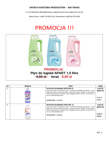OFERTA HURTOWA PRODUKTÓW - AM-TRANS 37-732 MEDYKA 405A/60Tel/fax.(+48)16 672 87 30,(+48)16 671 50 70, Marcin kom. (+48) 724 043 241, Paweł kom.(+48) 603 522 965 PROMOCJA !!! LP. 1 ZDJĘCIE OPIS PŁYN DO PŁUKANIA SOFTLAN 1L Koncentrat płynu do płukania tkanin z formułą ułatwiającą prasowanie , przez długi czas ubrania utrzymują świeży i przyjemny zapach. Nadaje się do płukania tkanin kolorowych jak i białych. Dba i pielęgnuje prane tkaniny, nie niszcząc ich oraz nie pozostawiając plam OPAKOWANIE – 12 SZTUK 2 PŁYN DO PŁUKANIA SOFTLAN 1L Koncentrat płynu do płukania tkanin z formułą ułatwiającą prasowanie , przez długi czas ubrania utrzymują świeży i przyjemny zapach. Nadaje się do płukania tkanin kolorowych jak i białych. Dba i pielęgnuje prane tkaniny, nie niszcząc ich oraz nie pozostawiając plam OPAKOWANIE – 12 SZTUK CENA 6,65 ZŁ BRUTTO 5,43 zł netto 6,65 ZŁ BRUTTO 5,43 zł netto str. 1 3 PŁYN DO PŁUKANIA SOFTLAN 1L Koncentrat płynu do płukania tkanin z formułą ułatwiającą prasowanie , przez długi czas ubrania utrzymują świeży i przyjemny zapach. Nadaje się do płukania tkanin kolorowych jak i białych. Dba i pielęgnuje prane tkaniny, nie niszcząc ich oraz nie pozostawiając plam OPAKOWANIE – 12 SZTUK 4 PŁYN DO PŁUKANIA SOFTLAN 1L Koncentrat płynu do płukania tkanin z formułą ułatwiającą prasowanie , przez długi czas ubrania utrzymują świeży i przyjemny zapach. Nadaje się do płukania tkanin kolorowych jak i białych. Dba i pielęgnuje prane tkaniny, nie niszcząc ich oraz nie pozostawiając plam OPAKOWANIE – 12 SZTUK 5 PŁYN DO PŁUKANIA SOFTLAN 1L Koncentrat płynu do płukania tkanin z formułą ułatwiającą prasowanie , przez długi czas ubrania utrzymują świeży i przyjemny zapach. Nadaje się do płukania tkanin kolorowych jak i białych. Dba i pielęgnuje prane tkaniny, nie niszcząc ich oraz nie pozostawiając plam OPAKOWANIE – 12 SZTUK 6 PŁYN DO PŁUKANIA SOFTLAN 1L Koncentrat płynu do płukania tkanin z formułą ułatwiającą prasowanie , przez długi czas ubrania utrzymują świeży i przyjemny zapach. Nadaje się do płukania tkanin kolorowych jak i białych. Dba i pielęgnuje prane tkaniny, nie niszcząc ich oraz nie pozostawiając plam OPAKOWANIE – 12 SZTUK 7 PŁYN DO MYCIA NACZYŃ FAIRY 1L - SENSITIVE 6,65 ZŁ BRUTTO 5,43 zł netto 6,65 ZŁ BRUTTO 5,43 zł netto 6,65 ZŁ BRUTTO 5,43 zł netto 6,65 ZŁ BRUTTO 5,43 zł netto 5,60 ZŁ BRUTTO OPAKOWANIE – 10 SZTUK 4,55 zł netto 8 PŁYN DO MYCIA NACZYŃ FAIRY 1L - CYTRYNOWY 5,60 ZŁ BRUTTO OPAKOWANIE – 10 SZTUK 4,55 zł netto 9 PŁYN DO MYCIA NACZYŃ FAIRY 1L - GRANAT 5,60 ZŁ BRUTTO OPAKOWANIE – 10 SZTUK 4,55 zł netto str. 2 10 PŁYN DO WC – 1 L Dzięki zawartym składnikom i konsystencji: dezynfekuje, działa bakteriobójczo, usuwa kamień i rdzę. Odświeża całą toaletę. 11 OPAKOWANIE – 10 SZTUK 3,25 zł netto PŁYN DO MYCIA WSTĘPNEGO FLACKEN VORWASCH 1 L ODPLAMIACZ 11,00 ZŁ BRUTTO Odplamiacz. Doskonale usuwa plamy różnego pochodzenia tłuszcz). Przeznaczony zarówno do tkanin białych i kolorowych (krew, OPAKOWANIE – 10 SZTUK 12 PŁYN DO CZYSZCZENIA ŁAZIENKI – 1L Doskonały środek do czyszczenia kafelek oraz armatury łazienkowej. Usuwa trudne zabrudzenia, pozostałości z mydła ,zacieki oraz inne zanieczyszczenia, powstałe podczas codziennego użytkowania. OPAKOWANIE – 10 SZTUK 13 4 ZŁ BRUTTO KROCHMAL W SPRAYU – 500 ML 8,94 zł netto 5,50 ZŁ BRUTTO 4,47 zł netto 5,50 ZŁ BRUTTO 4,47 zł netto 14 KRET DO RUR – 600 G. Środek do udrożniania rur. Skutecznie rozpuszcza organiczne zanieczyszczenia stałe w rurach. Udrażnia zatory w rurach i odpływach. Zabija bakterie, dzięki czemu rozwiązuje problem nieprzyjemnego zapachu .Nie uszkadza uszczelek.Do rur różnego rodzaju. Zawiera wodorotlenek sodu (Chronić przed dziećmi, środek silnie żrący) 15 6 ZŁ BRUTTO 4,88 ZŁ NETTO TABLETKI DO CZYSZCZENIA WC – W OPAKOWANIU 16 TABLETEK 6 ZŁ BRUTTO Musujące tabletki do wc o działaniu czyszczącym. Tabletki dezynfekują i odświeżają .Działają bakteriobójczo i grzybobójczo, usuwają kamień pozostawiając muszlę lśniąco czystą i pachnącą cytrynową świeżością. 4,88 zł netto OPAKOWANIE – 7 SZTUK 16 ZAWIESZKI DO WC – W OPAKOWANIU 4 SZT, 4x 40G. Dezynfekują i nadają cytrynowy zapach. OPAKOWANIE – 7 SZTUK 6,20 ZŁ BRUTTO 5,04 zł netto str. 3 17 18 TABLETKI DO ZMYWARKI – 60 TAB.60x 18 G.G&G 10,98 zł netto TABLETKI DO PRALKI – ODKAMIENIACZ – W OPAKOWANIU 51 SZT. 51x 15G. 13,50 ZŁ BRUTTO Pomagają zmiękczać wodę, oraz zapobiegają osadzaniu się kamienia. Posiadają formułę Effektiv- Formel, która zmiękcza wodę. Działają już od pierwszego użycia i nawet w 30 stopniachOPAKOWANIE – 5 SZTUK 19 PŁYN DO CZYSZCZENIA ZMYWAREK – 250 ML Skutecznie likwiduje tłuszcz, kamień i inne zabrudzenia. Dzięki niemu, zwiększa się żywotność zmywarki. Dociera do trudno dostępnych miejsc OPAKOWANIE – 12 SZTUK 20 MYDŁO W KOSTCE – 150 G. Kremowe mydło z olejkiem migdałowym delikatnie i łagodnie myje i pielęgnuje skórę. Zawiera naturalne składniki pielęgnujące i sprawia, że skóra jest zawsze odpowiednio nawilżona. OPAKOWANIE – 24 SZTUK 21 13,50 ZŁ BRUTTO PowerTabletki do zmywarki.Tabletki czyszczące do zmywarek, które posiadają dodatkowe funkcje: czyszczą,nabłyszczają,posiadają funkcję, soli, chronią szkło,nabłyszczają stal szlachetną i srebro ,zawierają substancję wzmacniającą czyszczenie posiadają formułę szybkiego schnięcia ,neutralizują nieprzyjemne zapachy ,czyszczą już w niskiej temperaturze (od 40°C) Należy stosować 1 tabletkę przy wszystkich stopniach zabrudzenia. Uwaga: Jeśli woda jest w stopniu twardości > 21°dH , należy dodatkowo stosować sól do zmywarek. OPAKOWANIE – 4 SZTUK KREM DO RĄK – RUMIANKOWY 125 ml Krem do rąk z rumiankiem. Te dodatki sprawiają, że przesuszona skóra jest nawilżona a dłonie 
