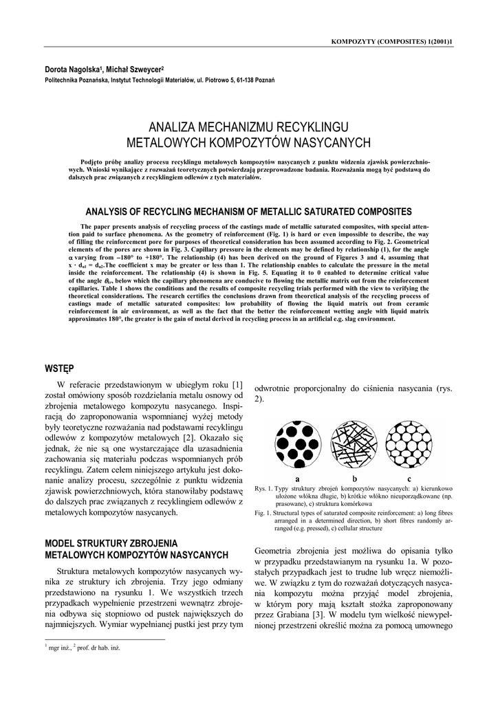 KOMPOZYTY (COMPOSITES) 1(2001)1 Dorota Nagolska1, Michał Szweycer2 Politechnika Poznańska, Instytut Technologii Materiałów, ul. Piotrowo 5, 61-138 Poznań ANALIZA MECHANIZMU RECYKLINGU METALOWYCH KOMPOZYTÓW NASYCANYCH Podjęto próbę analizy procesu recyklingu metalowych kompozytów nasycanych z punktu widzenia zjawisk powierzchniowych. Wnioski wynikające z rozważań teoretycznych potwierdzają przeprowadzone badania. Rozważania mogą być podstawą do dalszych prac związanych z recyklingiem odlewów z tych materiałów. ANALYSIS OF RECYCLING MECHANISM OF METALLIC SATURATED COMPOSITES The paper presents analysis of recycling process of the castings made of metallic saturated composites, with special attention paid to surface phenomena. As the geometry of reinforcement (Fig. 1) is hard or even impossible to describe, the way of filling the reinforcement pore for purposes of theoretical consideration has been assumed according to Fig. 2. Geometrical elements of the pores are shown in Fig. 3. Capillary pressure in the elements may be defined by relationship (1), for the angle α varying from −180° to +180°. The relationship (4) has been derived on the ground of Figures 3 and 4, assuming that x · du1 = du2.The coefficient x may be greater or less than 1. The relationship enables to calculate the pressure in the metal inside the reinforcement. The relationship (4) is shown in Fig. 5. Equating it to 0 enabled to determine critical value of the angle θkr, below which the capillary phenomena are conducive to flowing the metallic matrix out from the reinforcement capillaries. Table 1 shows the conditions and the results of composite recycling trials performed with the view to verifying the theoretical considerations. The research certifies the conclusions drawn from theoretical analysis of the recycling process of castings made of metallic saturated composites: low probability of flowing the liquid matrix out from ceramic reinforcement in air environment, as well as the fact that the better the reinforcement wetting angle with liquid matrix approximates 180°, the greater is the gain of metal derived in recycling process in an artificial e.g. slag environment. WSTĘP W referacie przedstawionym w ubiegłym roku [1] został omówiony sposób rozdzielania metalu osnowy od zbrojenia metalowego kompozytu nasycanego. Inspiracją do zaproponowania wspomnianej wyżej metody były teoretyczne rozważania nad podstawami recyklingu odlewów z kompozytów metalowych [2]. Okazało się jednak, że nie są one wystarczające dla uzasadnienia zachowania się materiału podczas wspomnianych prób recyklingu. Zatem celem niniejszego artykułu jest dokonanie analizy procesu, szczególnie z punktu widzenia zjawisk powierzchniowych, która stanowiłaby podstawę do dalszych prac związanych z recyklingiem odlewów z metalowych kompozytów nasycanych. MODEL STRUKTURY ZBROJENIA METALOWYCH KOMPOZYTÓW NASYCANYCH Struktura metalowych kompozytów nasycanych wynika ze struktury ich zbrojenia. Trzy jego odmiany przedstawiono na rysunku 1. We wszystkich trzech przypadkach wypełnienie przestrzeni wewnątrz zbrojenia odbywa się stopniowo od pustek największych do najmniejszych. Wymiar wypełnianej pustki jest przy tym 1 mgr inż., 2 prof. dr hab. inż. odwrotnie proporcjonalny do ciśnienia nasycania (rys. 2). Rys. 1. Typy struktury zbrojeń kompozytów nasycanych: a) kierunkowo ułożone włókna długie, b) krótkie włókno nieuporządkowane (np. prasowane), c) struktura komórkowa Fig. 1. Structural types of saturated composite reinforcement: a) long fibres arranged in a determined direction, b) short fibres randomly arranged (e.g. pressed), c) cellular structure Geometria zbrojenia jest możliwa do opisania tylko w przypadku przedstawianym na rysunku 1a. W pozostałych przypadkach jest to trudne lub wręcz niemożliwe. W związku z tym do rozważań dotyczących nasycania kompozytu można przyjąć model zbrojenia, w którym pory mają kształt stożka zaproponowany przez Grabiana [3]. W modelu tym wielkość niewypełnionej przestrzeni określić można za pomocą umownego 36 D. Nagolska, M. Szweycer wymiaru zależnego od ciśnienia nasycania zgodnie z równaniem Younga-Laplace’a pk = σ ⎛ α⎞ ⋅ ⎜ cosθ − ⎟ 2⎠ du ⎝ (1) Model ten nie jest wystarczający do rozważań dotyczących wypływania metalu osnowy z porów zbrojenia, ponieważ, jak widać z rysunku 2, nie musi się ono dokonywać w kolejności od szczelin najmniejszych do największych, jak to ma miejsce podczas nasycania, zatem element struktury zbrojenia może mieć kształty przedstawione na rysunku 3. WYPŁYWANIE OSNOWY Z PRZESTRZENI WEWNĄTRZ ZBROJENIA Przyjmując przedstawione powyżej założenia, mechanizm wypływania osnowy z przestrzeni zbrojenia można przedstawić jak na rysunku 4. Teoretycznie można przyjąć, że środowiska wewnątrz i na zewnątrz zbrojenia mogą być różne. Praktycznie byłoby to bardzo trudne do zrealizowania. Przyjmując zatem, że w obu przestrzeniach istnieje to samo środowisko można obliczyć ciśnienia: p1 = σ α⎞ ⎛ cos⎜θ − ⎟ d u1 2⎠ ⎝ p2 = σ du 2 sin θ (2) (3) Rys. 2. Stopniowe nasycanie zbrojenia Fig. 2. Gradual saturation of the reinforcement Rys. 4. Wypływanie osnowy kompozytu z przestrzeni wewnątrz zbrojenia Fig. 4. Flowing the composite matrix out from intrareinforcement space Rys. 3. Uproszczone kapilary pustek zbrojenia kompozytu nasycanego Fig. 3. Simplified capillaries of the voids in saturated composite reinforcement Wartość kąta α w zależności (1) określającej ciśnienie w stożkowej kapilarze [4] może wahać się w granicach od –180° do +180°, a umowna średnica kapilary, przez którą wypływa metal, może być zarówno większa, jak i mniejsza od wartości średniej umownej kapilary, której odpowiada chwilowe położenie powierzchni metalu wewnątrz zbrojenia. Zatem nie jest możliwe określenie stosunku du2/du1 od kąta α i długoś
