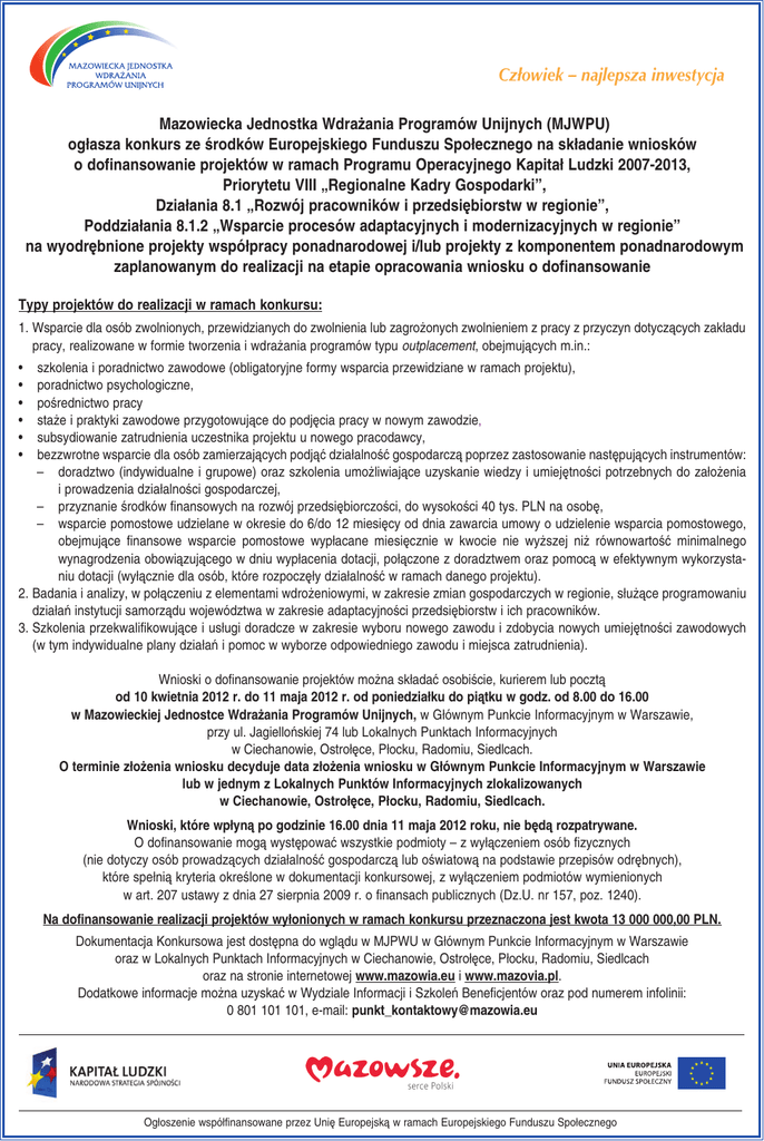 Człowiek – najlepsza inwestycja Mazowiecka Jednostka Wdrażania Programów Unijnych (MJWPU) ogłasza konkurs ze środków Europejskiego Funduszu Społecznego na składanie wniosków o dofinansowanie projektów w ramach Programu Operacyjnego Kapitał Ludzki 2007-2013, Priorytetu VIII „Regionalne Kadry Gospodarki”, Działania 8.1 „Rozwój pracowników i przedsiębiorstw w regionie”, Poddziałania 8.1.2 „Wsparcie procesów adaptacyjnych i modernizacyjnych w regionie” na wyodrębnione projekty współpracy ponadnarodowej i/lub projekty z komponentem ponadnarodowym zaplanowanym do realizacji na etapie opracowania wniosku o dofinansowanie Typy projektów do realizacji w ramach konkursu: 1. Wsparcie dla osób zwolnionych, przewidzianych do zwolnienia lub zagrożonych zwolnieniem z pracy z przyczyn dotyczących zakładu pracy, realizowane w formie tworzenia i wdrażania programów typu outplacement, obejmujących m.in.: • • • • • • szkolenia i poradnictwo zawodowe (obligatoryjne formy wsparcia przewidziane w ramach projektu), poradnictwo psychologiczne, pośrednictwo pracy staże i praktyki zawodowe przygotowujące do podjęcia pracy w nowym zawodzie, subsydiowanie zatrudnienia uczestnika projektu u nowego pracodawcy, bezzwrotne wsparcie dla osób zamierzających podjąć działalność gospodarczą poprzez zastosowanie następujących instrumentów: – doradztwo (indywidualne i grupowe) oraz szkolenia umożliwiające uzyskanie wiedzy i umiejętności potrzebnych do założenia i prowadzenia działalności gospodarczej, – przyznanie środków finansowych na rozwój przedsiębiorczości, do wysokości 40 tys. PLN na osobę, – wsparcie pomostowe udzielane w okresie do 6/do 12 miesięcy od dnia zawarcia umowy o udzielenie wsparcia pomostowego, obejmujące finansowe wsparcie pomostowe wypłacane miesięcznie w kwocie nie wyższej niż równowartość minimalnego wynagrodzenia obowiązującego w dniu wypłacenia dotacji, połączone z doradztwem oraz pomocą w efektywnym wykorzystaniu dotacji (wyłącznie dla osób, które rozpoczęły działalność w ramach danego projektu). 2. Badania i analizy, w połączeniu z elementami wdrożeniowymi, w zakresie zmian gospodarczych w regionie, służące programowaniu działań instytucji samorządu województwa w zakresie adaptacyjności przedsiębiorstw i ich pracowników. 3. Szkolenia przekwalifikowujące i usługi doradcze w zakresie wyboru nowego zawodu i zdobycia nowych umiejętności zawodowych (w tym indywidualne plany działań i pomoc w wyborze odpowiedniego zawodu i miejsca zatrudnienia). Wnioski o dofinansowanie projektów można składać osobiście, kurierem lub pocztą od 10 kwietnia 2012 r. do 11 maja 2012 r. od poniedziałku do piątku w godz. od 8.00 do 16.00 w Mazowieckiej Jednostce Wdrażania Programów Unijnych, w Głównym Punkcie Informacyjnym w Warszawie, przy ul. Jagiellońskiej 74 lub Lokalnych Punktach Informacyjnych w Ciechanowie, Ostrołęce, Płocku, Radomiu, Siedlcach. O terminie złożenia wniosku decyduje data złożenia wniosku w Głównym Punkcie Informacyjnym w Warszawie lub w jednym z Lokalnych Punktów Informacyjnych zlokalizowanych w Ciechanowie, Ostrołęce, Płocku, Radomiu, Siedlcach. Wnioski, które wpłyną po godzinie 16.00 dnia 11 maja 2012 roku, nie będą rozpatrywane. O dofinansowanie mogą występować wszystkie podmioty – z wyłączeniem osób fizycznych (nie dotyczy osób prowadzących działalność gospodarczą lub oświatową na podstawie przepisów odrębnych), które spełnią kryteria określone w dokumentacji konkursowej, z wyłączeniem podmiotów wymienionych w art. 207 ustawy z dnia 27 sierpnia 2009 r. o finansach publicznych (Dz.U. nr 157, poz. 1240). Na dofinansowanie realizacji projektów wyłonionych w ramach konkursu przeznaczona jest kwota 13 000 000,00 PLN. Dokumentacja Konkursowa jest dostępna do wglądu w MJPWU w Głównym Punkcie Informacyjnym w Warszawie oraz w Lokalnych Punktach Informacyjnych w Ciechanowie, Ostrołęce, Płocku, Radomiu, Siedlcach oraz na stronie internetowej www.mazowia.eu i www.mazovia.pl. Dodatkowe informacje można uzyskać w Wydziale Informacji i Szkoleń Beneficjentów oraz pod numerem infolinii: 0 801 101 101, e-mail: [email protected] Ogłoszenie współfinansowane przez Unię Europejską w ramach Europejskiego Funduszu Społecznego