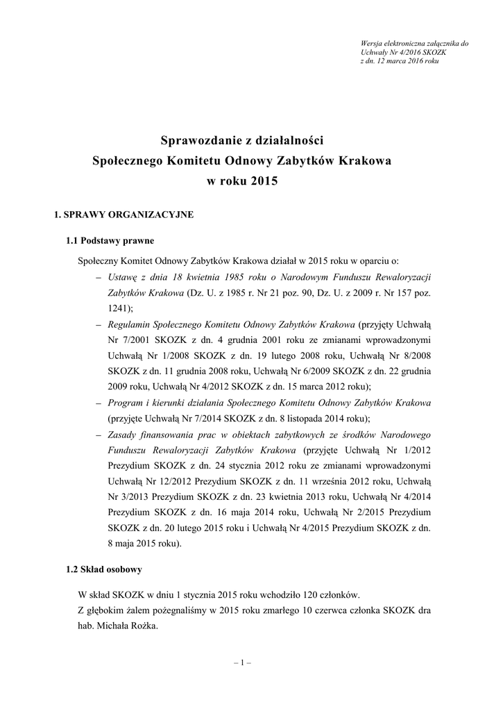 Wersja elektroniczna załącznika do Uchwały Nr 4/2016 SKOZK z dn. 12 marca 2016 roku Sprawozdanie z działalności Społecznego Komitetu Odnowy Zabytków Krakowa w roku 2015 1. SPRAWY ORGANIZACYJNE 1.1 Podstawy prawne Społeczny Komitet Odnowy Zabytków Krakowa działał w 2015 roku w oparciu o: Ustawę z dnia 18 kwietnia 1985 roku o Narodowym Funduszu Rewaloryzacji Zabytków Krakowa (Dz. U. z 1985 r. Nr 21 poz. 90, Dz. U. z 2009 r. Nr 157 poz. 1241); Regulamin Społecznego Komitetu Odnowy Zabytków Krakowa (przyjęty Uchwałą Nr 7/2001 SKOZK z dn. 4 grudnia 2001 roku ze zmianami wprowadzonymi Uchwałą Nr 1/2008 SKOZK z dn. 19 lutego 2008 roku, Uchwałą Nr 8/2008 SKOZK z dn. 11 grudnia 2008 roku, Uchwałą Nr 6/2009 SKOZK z dn. 22 grudnia 2009 roku, Uchwałą Nr 4/2012 SKOZK z dn. 15 marca 2012 roku); Program i kierunki działania Społecznego Komitetu Odnowy Zabytków Krakowa (przyjęte Uchwałą Nr 7/2014 SKOZK z dn. 8 listopada 2014 roku); Zasady finansowania prac w obiektach zabytkowych ze środków Narodowego Funduszu Rewaloryzacji Zabytków Krakowa (przyjęte Uchwałą Nr 1/2012 Prezydium SKOZK z dn. 24 stycznia 2012 roku ze zmianami wprowadzonymi Uchwałą Nr 12/2012 Prezydium SKOZK z dn. 11 września 2012 roku, Uchwałą Nr 3/2013 Prezydium SKOZK z dn. 23 kwietnia 2013 roku, Uchwałą Nr 4/2014 Prezydium SKOZK z dn. 16 maja 2014 roku, Uchwałą Nr 2/2015 Prezydium SKOZK z dn. 20 lutego 2015 roku i Uchwałą Nr 4/2015 Prezydium SKOZK z dn. 8 maja 2015 roku). 1.2 Skład osobowy W skład SKOZK w dniu 1 stycznia 2015 roku wchodziło 120 członków. Z głębokim żalem pożegnaliśmy w 2015 roku zmarłego 10 czerwca członka SKOZK dra hab. Michała Rożka. –1– Sprawozdanie z działalności SKOZK w roku 2015 Stan osobowy Komitetu w dniu 31 grudnia 2015 roku wynosił 119 członków. 1.3 Zebrania Plenarne W 2015 roku odbyło się jedno Zebranie Plenarne SKOZK. 6 marca w Sali Miedzianej Pałacu „Pod Krzysztofory” Komitet podsumował i ocenił działalność w roku poprzednim oraz przyjął plan rzeczowo-finansowy odnowy zabytków Krakowa na 2015 rok ze środków Narodowego Funduszu Rewaloryzacji Zabytków Krakowa (NFRZK). Ponadto SKOZK ustanowił programy szczegółowe NFRZK na rok 2016. Uchwały przyjęte na posiedzeniu w dniu 6 marca 2015 roku: Nr 1/2015 w sprawie sprawozdania z realizacji planu odnowy zabytków Krakowa za rok 2014; Nr 2/2015 w sprawie planu rzeczowo-finansowego odnowy zabytków Krakowa na 2015 rok ze środków Narodowego Funduszu Rewaloryzacji Zabytków Krakowa; Nr 3/2015 w sprawie zatwierdzenia sprawozdania z działalności Społecznego Komitetu Odnowy Zabytków Krakowa w roku 2014 oraz udzielenia absolutorium Prezydium i komisjom problemowym; Nr 4/2015 w sprawie ustanowienia programów szczegółowych Narodowego Funduszu Rewaloryzacji Zabytków Krakowa na rok 2016; Nr 5/2015 w sprawie wniosków i propozycji zgłoszonych podczas Zebrania Plenarnego. 1.4 Prezydium Zgodnie z Regulaminem SKOZK pieczę nad bieżącą działalnością Komitetu sprawowało jego Prezydium. Prezydium SKOZK odbyło w 2015 roku 5 posiedzeń w dniach: 20 lutego, 8 maja, 23 lipca, 29 września i 24 listopada. Podczas większości posiedzeń Prezydium prócz spraw bieżących zajmowało się odrębną tematyką wiodącą. I tak: 20 lutego Prezydium zapoznało się ze sprawozdaniem z wykonania planu odnowy zabytków Krakowa w roku 2014 przedstawionym przez dyrektor Wydziału Rewaloryzacji Zabytków Krakowa i Dziedzictwa Narodowego Małopolskiego Urzędu Wojewódzkiego w Krakowie (WRZKiDN MUW) Joannę Florkiewicz-Kamieniarczyk. Przewodniczący SKOZK prof. dr hab. Franciszek Ziejka przedstawił projekt sprawozdania z działalności SKOZK w roku 2014. Projekt planu rzeczowo-finansowego odnowy zabytków Krakowa na 2015 rok ze środków NFRZK przedstawił zastępca przewodniczącego SKOZK dr hab. –2– Sprawozdanie z działalności SKOZK w roku 2015 Bogusław Krasnowolski, który zaproponował również ustanowienie programów szczegółowych NFRZK na rok 2016. Prezydium SKOZK pozytywnie oceniło wszystkie wymienione wyżej dokumenty i rekomendowało je do przyjęcia przez Zebranie Plenarne. Ponadto Prezydium wprowadziło zmiany w Zasadach finansowania prac w obiektach zabytkowych ze środków Narodowego Funduszu Rewaloryzacji Zabytków Krakowa. 8 maja Prezydium wysłuchało informacji dyrektor WRZKiDN MUW Joanny Florkiewicz-Kamieniarczyk w sprawach bieżących związanych z realizacją planu rzeczowo-finansowego odnowy zabytków Krakowa ze środków NFRZK oraz dokonało korekty planu. Prezydium wprowadziło również kolejne zmiany w Zasadach finansowania prac w obiektach zabytkowych ze środków Narodowego Funduszu Rewaloryzacji Zabytków Krakowa oraz przyjęło wzory formularzy wniosków o przyznanie dofinansowania z NFRZK na rok 2016. Ponadto Prezydium dokonało zmian w składzie osobowym Komisji Finansowej SKOZK. 23 lipca Prezydium zapoznało się z informacją dyrektor WRZKiDN MUW Joanny Florkiewicz-Kamieniarczyk o realizacji planu rzeczowo-finansowego odnowy zabytków Krakowa ze środków NFRZK w pierwszym półroczu 2015 roku oraz przeprowadziło korekty w planie. Prezydium dokonało aktualizacji zapisów Regulaminu działań w zakresie informacji o wykorzystaniu środków z Narodowego Funduszu Rewaloryzacji Zabytków Krakowa. Prezydium przyjęło także wniosek Przewodniczącego SKOZK prof. dr hab. Franciszka Ziejki w sprawie powołania pod przewodnictwem dr hab. Bogusława Krasnowolskiego zespołu do spraw opracowania prognozy potrzeb konserwatorskich Krakowa na lata 2016–2020. 29 września Prezydium przyjęło do wiadomości informację dyrektor WRZKiDN MUW Joanny Florkiewicz-Kamieniarczyk o bieżącej realizacji planu rzeczowo-finansowego odnowy zabytków Krakowa ze środków NFRZK i dokonało kolejnej korekty planu. Ustalono także składy osobowe zespołów sterujących priorytetów operacyjnych NFRZK na rok 2016. 24 listopada Prezydium oceniło realizację planu rzeczowo-