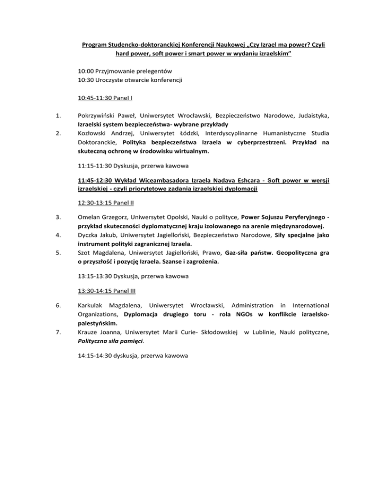 Program Studencko-doktoranckiej Konferencji Naukowej „Czy Izrael ma power? Czyli hard power, soft power i smart power w wydaniu izraelskim” 10:00 Przyjmowanie prelegentów 10:30 Uroczyste otwarcie konferencji 10:45-11:30 PaneI I 1. 2. Pokrzywiński Paweł, Uniwersytet Wrocławski, Bezpieczeństwo Narodowe, Judaistyka, Izraelski system bezpieczeństwa- wybrane przykłady Kozłowski Andrzej, Uniwersytet Łódzki, Interdyscyplinarne Humanistyczne Studia Doktoranckie, Polityka bezpieczeństwa Izraela w cyberprzestrzeni. Przykład na skuteczną ochronę w środowisku wirtualnym. 11:15-11:30 Dyskusja, przerwa kawowa 11:45-12:30 Wykład Wiceambasadora Izraela Nadava Eshcara - Soft power w wersji izraelskiej - czyli priorytetowe zadania izraelskiej dyplomacji 12:30-13:15 Panel II 3. 4. 5. Omelan Grzegorz, Uniwersytet Opolski, Nauki o polityce, Power Sojuszu Peryferyjnego przykład skuteczności dyplomatycznej kraju izolowanego na arenie międzynarodowej. Dyczka Jakub, Uniwersytet Jagielloński, Bezpieczeństwo Narodowe, Siły specjalne jako instrument polityki zagranicznej Izraela. Szot Magdalena, Uniwersytet Jagielloński, Prawo, Gaz-siła państw. Geopolityczna gra o przyszłość i pozycję Izraela. Szanse i zagrożenia. 13:15-13:30 Dyskusja, przerwa kawowa 13:30-14:15 Panel III 6. 7. Karkulak Magdalena, Uniwersytet Wrocławski, Administration in International Organizations, Dyplomacja drugiego toru - rola NGOs w konflikcie izraelskopalestyńskim. Krauze Joanna, Uniwersytet Marii Curie- Skłodowskiej w Lublinie, Nauki polityczne, Polityczna siła pamięci. 14:15-14:30 dyskusja, przerwa kawowa