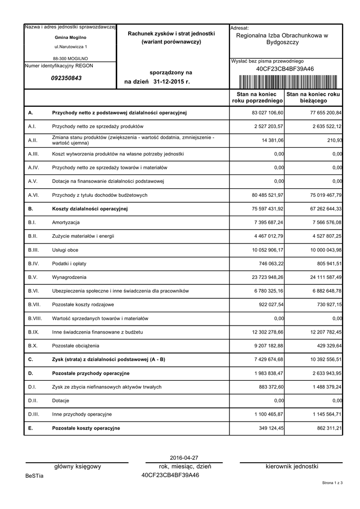 Nazwa i adres jednostki sprawozdawczej Gmina Mogilno ul.Narutowicza 1 Rachunek zysków i strat jednostki (wariant porównawczy) 88-300 MOGILNO Numer identyfikacyjny REGON 092350843 sporządzony na na dzień 31-12-2015 r. A. Przychody netto z podstawowej działalności operacyjnej A.I. Przychody netto ze sprzedaży produktów Adresat: Regionalna Izba Obrachunkowa w Bydgoszczy Wysłać bez pisma przewodniego 40CF23CB4BF39A46 Stan na koniec Stan na koniec roku roku poprzedniego bieżącego 83 027 106,60 77 655 200,84 2 527 203,57 2 635 522,12 14 381,06 210,93 Koszt wytworzenia produktów na własne potrzeby jednostki 0,00 0,00 A.IV. Przychody netto ze sprzedaży towarów i materiałów 0,00 0,00 A.V. Dotacje na finansowanie działalności podstawowej 0,00 0,00 A.VI. Przychody z tytułu dochodów budżetowych 80 485 521,97 75 019 467,79 B. Koszty działalności operacyjnej 75 597 431,92 67 262 644,33 B.I. Amortyzacja 7 395 687,24 7 566 576,08 B.II. Zużycie materiałów i energii 4 467 012,79 4 527 807,25 B.III. Usługi obce 10 052 906,17 10 000 043,98 B.IV. Podatki i opłaty 746 063,22 805 941,51 B.V. Wynagrodzenia 23 723 948,26 24 111 587,49 B.VI. Ubezpieczenia społeczne i inne świadczenia dla pracowników 6 780 325,16 6 882 648,78 B.VII. Pozostałe koszty rodzajowe 922 027,54 730 927,15 B.VIII. Wartość sprzedanych towarów i materiałów 0,00 0,00 B.IX. Inne świadczenia finansowane z budżetu 12 302 278,66 12 207 782,45 B.X. Pozostałe obciążenia 9 207 182,88 429 329,64 C. Zysk (strata) z działalności podstawowej (A - B) 7 429 674,68 10 392 556,51 D. Pozostałe przychody operacyjne 1 983 838,47 2 633 943,95 D.I. Zysk ze zbycia niefinansowych aktywów trwałych 883 372,60 1 488 379,24 D.II. Dotacje 0,00 0,00 D.III. Inne przychody operacyjne 1 100 465,87 1 145 564,71 E. Pozostałe koszty operacyjne 349 124,45 862 311,21 A.II. A.III. BeSTia Zmiana stanu produktów (zwiększenia - wartość dodatnia, zmniejszenie wartość ujemna) główny księgowy 2016-04-27 rok, miesiąc, dzień 40CF23CB4BF39A46 kierownik jednostki Strona 1 z 3 E.I. E.II. Koszty inwestycji finansowanych ze środków własnych samorządowych zakładów budżetowych i dochodów jednostek budżetowych gromadzonych na wydzielonym rachunku Pozostałe koszty operacyjne 0,00 0,00 349 124,45 862 311,21 9 064 388,70 12 164 189,25 345 233,88 285 401,74 0,00 130 000,00 345 233,88 155 401,74 0,00 0,00 F. Zysk (strata) z działalności operacyjnej (C + D - E) G. Przychody finansowe G.I. Dywidendy i udziały w zyskach G.II. Odsetki G.III. Inne H. Koszty finansowe 1 786 458,77 1 263 518,80 H.I. Odsetki 1 786 458,77 1 263 518,80 H.II. Inne 0,00 0,00 I. Zysk (strata) z działalności gospodarczej (F + G - H) 7 623 163,81 11 186 072,19 J. Wynik zdarzeń nadzwyczajnych (J.I. - J.II.) 0,00 0,00 J.I. Zyski nadzwyczajne 0,00 0,00 J.II. Straty nadzwyczajne 0,00 0,00 K. Zysk (strata) brutto (I +- J) 7 623 163,81 11 186 072,19 L. Podatek dochodowy 43 956,00 45 405,00 0,00 0,00 7 579 207,81 11 140 667,19 M. N. Pozostałe obowiązkowe zmniejszenia zysku (zwiększenia straty) oraz nadwyżki środków obrotowych Zysk (strata) netto (K - L - M) Informacje uzupełniające istotne dla oceny rzetelności i przejrzystości sytuacji finansowej : BeSTia główny księgowy 2016-04-27 rok, miesiąc, dzień 40CF23CB4BF39A46 kierownik jednostki Strona 2 z 3 Wyjaśnienia do sprawozdania Symbol Wyszczególnienie A.VI Przychody z tytułu dochodów budżetowych B.X Pozostałe obciążenia E.II Pozostałe koszty operacyjne BeSTia główny księgowy Uwagi UwagaJST Duża różnica w wielkości przychodów w poszczegółnych latach wynika z faktu ujęcia w poprzednim roku dotacji, która została zwrócona a następnie przekazana ponownie ze względu na zmianę źródła finansowania - W roku 2014 został zawarty kolejny aneks: Aneks nr 4 do Umowy Nr WPW.I.3043-1-7-501/2010 z 3.11.2010 r. o finansowanie w formie zaliczki i refundacji projektu "Budowa obwodnicy miasta Mogilna" oraz Aneks nr 2 do umowy nr BD-II.3041.14.12 z 15.05.2012 r. Zawarcie Aneksu Nr 4 nastąpiło na podstawie uchwały Nr 37/1370/13 Zarządu Województwa Kujawsko-Pomorskiego z dnia 28 września 2013 r. w sprawie zmiany Indykatywnego Wykazu Indywidualnych Projektów Kluczowych współfinansowanych w ramach Regionalnego Programu Operacyjnego Województwa Kujawsko-Pomorskiego na lata 2007-2013. Zarząd Województwa zastąpił środki budżetu województwa środkami Europejskiego Funduszu Rozwoju Regionalnego i tym samych zwiększył kwotę dofinansowania środkami europejskimi dla projektu „Budowa obwodnicy miasta Mogilna” z 1,51 mln euro do 3,49 mln euro tj. do kwoty 15.171.684,45 zł. Oznacza to, że gmina Mogilno była zobowiązana dokonać zwrotu dotacji, którą otrzymała w 2012 r. z budżetu województwa w kwocie 8.447.704,48 zł, a Województwo KujawskoPomorskie przekazało do budżetu gminy Mogilno ww. kwotę ze środków unijnych. Duża różnica w wielkości pozostałych obciążeń w poszczegółnych latach wynika z faktu ujęcia w poprzednim roku dotacji, która została zwrócona a następnie przekazana ponownie ze względu na zmianę źródła finansowania - W roku 2014 został zawarty kolejny aneks: Aneks nr 4 do Umowy Nr WPW.I.3043-1-7-501/2010 z 3.11.2010 r. o finansowanie w formie zaliczki i refundacji projektu "Budowa obwodnicy miasta Mogilna" oraz Aneks nr 2 do umowy nr BD-II.3041.14.12 z 15.05.2012 r. Zawarcie Aneksu Nr 4 nastąpiło na podstawie uchwały Nr 37/1370/13 Zarządu Województwa Kujawsko-Pomorskiego z dnia 28 września 2013 r. w sprawie zmiany Indykatywnego Wykazu Indywidualnych Projektów Kluczowych współfinansowanych w ramach Regionalnego Programu Operacyjnego Województwa Kujawsko-Pomorskiego na lata 2007-2013. Zarząd Województwa zastąpił środki budżetu województwa środkami Europejskiego Funduszu Rozwoju Regionalnego i tym samych zwiększył kwotę dofinansowania środkami europejskimi dla projektu „Budowa obwodnicy miasta Mogilna” z 1,51 