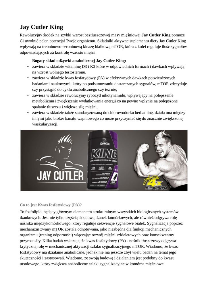 Jay Cutler King Rewolucyjny środek na szybki wzrost beztłuszczowej masy mięśniowej.Jay Cutler King pomoże Ci uwolnić pełen potencjał Twoje organizmu. Składniki aktywne suplementu diety Jay Cutler King wpływają na treoninowo-seroninową kinazę białkową mTOR, która z kolei reguluje ilość sygnałów odpowiadających za kontrolę wzrostu mięśni. • • • • Bogaty skład odżywki anabolicznej Jay Cutler King: zawiera w składzie witaminę D3 i K2 które w odpowiednich formach i dawkach wpływają na wzrost wolnego testosteronu, zawiera w składzie kwas fosfatydowy (PA) w efektywnych dawkach potwierdzonych badaniami naukowymi, który po podsumowaniu dostarczanych sygnałów, mTOR zdecyduje czy przystąpić do cyklu anabolicznego czy też nie, zawiera w składzie rewolucyjny rybozyd nikotynamidu, wpływający na polepszenie metabolizmu i zwiększenie wydatkowania energii co na pewno wpłynie na polepszone spalanie tłuszczu i większą siłę mięśni, zawiera w składzie także standaryzowaną do chlorowodorku berbaminę, działa ona między innymi jako bloker kanału wapniowego co może przyczyniać się do znacznie zwiększonej waskularyzacji. Co to jest Kwas fosfatydowy (PA)? To fosfolipid, będący głównym elementem strukturalnym wszystkich biologicznych systemów tkankowych. Jest nie tylko częścią składową tkanek komórkowych, ale również odgrywa rolę nośnika międzykomórkowego, który reguluje sekwencje sygnałowe białek. Sygnalizacja poprzez mechanizm zwany mTOR została odnotowana, jako niezbędna dla funkcji mechanicznych organizmu (trening odporności) włączając rozwój mięśni szkieletowych oraz konsekwentny przyrost siły. Kilka badań wskazuje, że kwas fosfatydowy (PA) - nośnik tłuszczowy odgrywa krytyczną rolę w mechanicznej aktywacji szlaku sygnalizacyjnego mTOR. Wiadomo, że kwas fosfatydowy ma działanie anaboliczne, jednak nie ma jeszcze zbyt wielu badań na temat jego skuteczności i zastosowań. Wiadomo, ze swoją budową i działaniem jest podobny do kwasu ursolowego, który zwiększa anaboliczne szlaki sygnalizacyjne w komórce mięśniowe Znaczenie kwasu fosfatydowego, znajdującego się w odżywce Jay Cutler King, dla suplementacji kulturystów. Jednym z najważniejszych celów wśród kulturystów jest aktywacja sygnalizatora mTOR. Kwas fosfatydowy zawarty w Cutler Nutrition King jest jednym z jego najsilniejszych aktywatorów, który m.in. aktywuje syntezę białek w komórkach mięśniowych. By móc normalnie działać, komórka musi podtrzymywać odpowiednie pH. Dotąd naukowcy nie wiedzieli, za pomocą jakich mechanizmów odbywa się monitorowanie kwasowości/zasadowości, teraz okazuje się, że odpowiada za to wbudowany w błonę komórkową kwas tłuszczowy - kwas fosfatydowy. Naukowcy wiedzieli, że w pewnych okolicznościach określone białka są w stanie wykrywać zmiany pH. Odkryli jednak, że w rzeczywistości to jeden z fosfolipidów, występujący we wszystkich komórkach kwas fosfatydowy, odpowiada za detekcję pH. Kwas fosfatydowy może być używany, jako suplement budujący tkankę mięśniową. Ma dość podobne działanie do kreatyny. Nowe badania potwierdzają, że substancja może zwiększać także siłę mięśni. Zapoznaj się z pełną ofertą profesjonalnych, amerykańskich odżywek dla kulturystów Jay Cutler. Producent najlepszej odżywki ułatwiającej budowanie masy mięśniowej oraz powodującej wyraźny wzrost siły King: Jay Cutler Zobacz naszą pełną ofertę suplementów diety zawierających substancje działające anabolicznie z grupy: anaboliczne boostery testosteronu dla osób, które są w trakcie budowania beztłuszczowej masy mięśniowej. Skład silnej odżywki na masę i siłę Jay Cutler King: Informacja żywieniowa: Vitamin D3 (as cholecalciferol) Vitamin K2 (as menaquinone-7) Glycoprotein Muscle Growth Blend (Proprietary): Mediator (as Phosphatidic acid, 750 mg), Dactylorhiza hatagirea (root), Fructus ligustri (whole), Berberis thunbergii (root) [Berbamine HCl], Niagen (as Nicotinamide riboside). w 3 kapsułkach 4,800 IU (1,200% DV) 80 mcg (100% DV) 2,1 g Inne składniki anabolicznego wsparcia Twoich mięśni Jay Cutler King: Gelatin, Microcrystalline Cellulose, Maltodextrin, Magnesium Stearate, Silica, Stearic Acid, Zingiber officinale (root), Capsicum annuum (fruit), cellulose (as ethyl cellulose), Oryza sativa wax, FD&C Blue No. 1, FD&C Red No. 40, FD&C Yellow No. 6, and Titanium Dioxide. Opis i charakterystyka odżywki o działaniu silnie anabolicznym Jay Cutler King: • 1 porcja = 1 kapsułka • Ilość porcji w opakowaniu: 90 • Zawartość opakowania: 90 kapsułek Sposób użycia Jay Cutler King odżywki stymulującej organizm do budowania beztłuszczowej masy mięśniowej: • Jedną porcję, jedną kapsułkę popić wodą, zażywać trzy razy dziennie. Sposób dawkowania: • Dni treningowe: 1 porcja rano po śniadaniu, 1 porcja po głównym posiłku, 1 porcja po kolacji • Dni nietreningowe: 1 porcja rano po śniadaniu, 1 porcja po głównym posiłku, 1 porcja po kolacji Produkt ten kupisz w atrakcyjnej cenie w sklepie internetowym Kulturystyks.sklep.pl: http://www.kulturystyka.sklep.pl/p/1140858252/Jay-Cutler-King-90-kap/