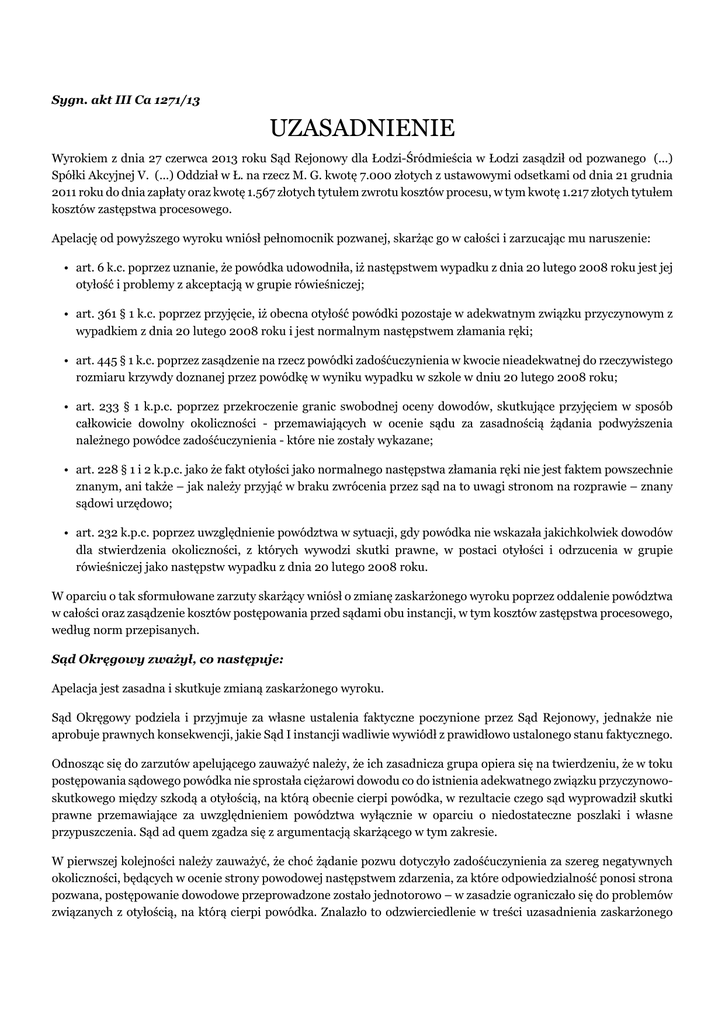 Sygn. akt III Ca 1271/13 UZASADNIENIE Wyrokiem z dnia 27 czerwca 2013 roku Sąd Rejonowy dla Łodzi-Śródmieścia w Łodzi zasądził od pozwanego (...) Spółki Akcyjnej V. (...) Oddział w Ł. na rzecz M. G. kwotę 7.000 złotych z ustawowymi odsetkami od dnia 21 grudnia 2011 roku do dnia zapłaty oraz kwotę 1.567 złotych tytułem zwrotu kosztów procesu, w tym kwotę 1.217 złotych tytułem kosztów zastępstwa procesowego. Apelację od powyższego wyroku wniósł pełnomocnik pozwanej, skarżąc go w całości i zarzucając mu naruszenie: • art. 6 k.c. poprzez uznanie, że powódka udowodniła, iż następstwem wypadku z dnia 20 lutego 2008 roku jest jej otyłość i problemy z akceptacją w grupie rówieśniczej; • art. 361 § 1 k.c. poprzez przyjęcie, iż obecna otyłość powódki pozostaje w adekwatnym związku przyczynowym z wypadkiem z dnia 20 lutego 2008 roku i jest normalnym następstwem złamania ręki; • art. 445 § 1 k.c. poprzez zasądzenie na rzecz powódki zadośćuczynienia w kwocie nieadekwatnej do rzeczywistego rozmiaru krzywdy doznanej przez powódkę w wyniku wypadku w szkole w dniu 20 lutego 2008 roku; • art. 233 § 1 k.p.c. poprzez przekroczenie granic swobodnej oceny dowodów, skutkujące przyjęciem w sposób całkowicie dowolny okoliczności - przemawiających w ocenie sądu za zasadnością żądania podwyższenia należnego powódce zadośćuczynienia - które nie zostały wykazane; • art. 228 § 1 i 2 k.p.c. jako że fakt otyłości jako normalnego następstwa złamania ręki nie jest faktem powszechnie znanym, ani także – jak należy przyjąć w braku zwrócenia przez sąd na to uwagi stronom na rozprawie – znany sądowi urzędowo; • art. 232 k.p.c. poprzez uwzględnienie powództwa w sytuacji, gdy powódka nie wskazała jakichkolwiek dowodów dla stwierdzenia okoliczności, z których wywodzi skutki prawne, w postaci otyłości i odrzucenia w grupie rówieśniczej jako następstw wypadku z dnia 20 lutego 2008 roku. W oparciu o tak sformułowane zarzuty skarżący wniósł o zmianę zaskarżonego wyroku poprzez oddalenie powództwa w całości oraz zasądzenie kosztów postępowania przed sądami obu instancji, w tym kosztów zastępstwa procesowego, według norm przepisanych. Sąd Okręgowy zważył, co następuje: Apelacja jest zasadna i skutkuje zmianą zaskarżonego wyroku. Sąd Okręgowy podziela i przyjmuje za własne ustalenia faktyczne poczynione przez Sąd Rejonowy, jednakże nie aprobuje prawnych konsekwencji, jakie Sąd I instancji wadliwie wywiódł z prawidłowo ustalonego stanu faktycznego. Odnosząc się do zarzutów apelującego zauważyć należy, że ich zasadnicza grupa opiera się na twierdzeniu, że w toku postępowania sądowego powódka nie sprostała ciężarowi dowodu co do istnienia adekwatnego związku przyczynowoskutkowego między szkodą a otyłością, na którą obecnie cierpi powódka, w rezultacie czego sąd wyprowadził skutki prawne przemawiające za uwzględnieniem powództwa wyłącznie w oparciu o niedostateczne poszlaki i własne przypuszczenia. Sąd ad quem zgadza się z argumentacją skarżącego w tym zakresie. W pierwszej kolejności należy zauważyć, że choć żądanie pozwu dotyczyło zadośćuczynienia za szereg negatywnych okoliczności, będących w ocenie strony powodowej następstwem zdarzenia, za które odpowiedzialność ponosi strona pozwana, postępowanie dowodowe przeprowadzone zostało jednotorowo – w zasadzie ograniczało się do problemów związanych z otyłością, na którą cierpi powódka. Znalazło to odzwierciedlenie w treści uzasadnienia zaskarżonego wyroku, które skupia się na omówieniu negatywnych następstw społecznych związanych z wyglądem powódki. Tymczasem w kontekście oceny zasadności przedmiotowego powództwa istotniejsze od pogłębionych rozważań dotyczących problematyki otyłości było przeprowadzenie weryfikacji zgromadzonego materiału dowodowego pod kątem przesłanek odpowiedzialności cywilnej strony pozwanej. O ile kwestie zaistnienia zdarzenia szkodzącego z dnia 20 lutego 2008 roku oraz otyłości powódki nie były między stronami sporne, o tyle należy zgodzić się ze skarżącym, że strona powodowa nie wykazała spełnienia wszystkich przesłanek odpowiedzialności pozwanego. Mianowicie nie udowodniła związku przyczynowo-skutkowego pomiędzy zdarzeniem szkodzącym a wystąpieniem u powódki otyłości, mimo że zgodnie z art. 6 k.c. spoczywał na niej ciężar udowodnienia tego faktu, ponieważ chciała z niego wywodzić skutki prawne. Strona powodowa swoją aktywność w zakresie postępowania dowodowego ograniczyła jedynie do wniosku o przesłuchanie przedstawicielki ustawowej w charakterze strony oraz o załączenie akt postępowania likwidacyjnego prowadzonego przez pozwaną spółkę w związku z zaistnieniem zdarzenia z dnia 20 lutego 2008 roku. Przesłuchanie przedstawicielki ustawowej w zakresie omawianej przesłanki odpowiedzialności za krzywdę dostarczyło sądowi wiedzy na temat twierdzeń strony, które dopiero mogłyby zostać udowodnione na dalszym etapie postępowania. Podkreślenia wymaga, że dowodzenie własnych twierdzeń nie jest obowiązkiem strony, a spoczywającym na niej ciężarem procesowym, co wynika wprost z treści art. 232 zd. 1 k.p.c., który stanowi, iż strony są obowiązane wskazywać dowody dla stwierdzenia faktów, z których wywodzą skutki prawne. Nie istnieje zatem żadna możliwość egzekwowania od strony aktywności w sferze dowodowej. Samo twierdzenie strony powodowej nie jest dowodem, a twierdzenie dotyczące istotnej dla sprawy okoliczności (vide art. 227 k.p.c.) powinno być udowodnione przez stronę, która to twierdzenie formułuje. W przeciwnym razie strona poniesie ujemne następstwa swojej pasywnej postawy – fakty nieudowodnione zostaną pominięte i nie wywołają skutków prawnych z nimi związanych. Wobec tego na uwzględnienie zasługuje podniesiony w apelacji zar