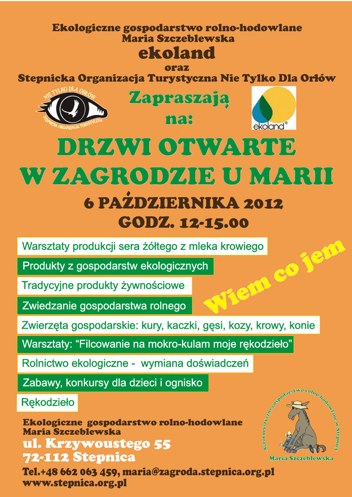 Ekologiczne gospodarstwo rolno-hodowlane Maria Szczeblewska ekoland oraz Stepnicka Organizacja Turystyczna Nie Tylko Dla Orlów TY L KO DLA ORLÓW Zapraszaja na: - N IE ST E PN ICK A CZNA STY ORGANIZACJA TURY - DRZWI OTWARTE W ZAGRODZIE U MARII 6 PAZDZIERNIKA 2012 GODZ. 12-15.00 Warsztaty produkcji sera ¿ó³tego z mleka krowiego Produkty z gospodarstw ekologicznych Tradycyjne produkty ¿ywnoœciowe Zwiedzanie gospodarstwa rolnego m e i W co m e j Zwierzêta gospodarskie: kury, kaczki, gêsi, kozy, krowy, konie Warsztaty: “Filcowanie na mokro-kulam moje rêkodzie³o” Rolnictwo ekologiczne - wymiana doœwiadczeñ Agroturystyczn eg ul. Krzywoustego 55 72-112 Stepnica Maria Szczeblewska Tel.+48 662 063 459, [email protected] www.stepnica.org.pl w Stepnicy Ekologiczne gospodarstwo rolno-hodowlane Maria Szczeblewska two roln o-h ars d o po e lan w do Rêkodzie³o os Zabawy, konkursy dla dzieci i ognisko