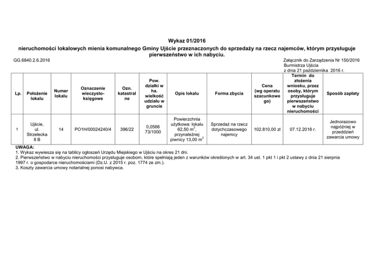 Wykaz 01/2016 nieruchomości lokalowych mienia komunalnego Gminy Ujście przeznaczonych do sprzedaży na rzecz najemców, którym przysługuje pierwszeństwo w ich nabyciu. GG.6840.2.6.2016 Lp. 1 Położenie lokalu Ujście, ul. Strzelecka 8B Numer lokalu 14 Oznaczenie wieczystoksięgowe PO1H/00024240/4 Ozn. katastral ne 396/22 Pow. działki w ha. wielkość udziału w gruncie Opis lokalu Forma zbycia 0,0566 73/1000 Powierzchnia użytkowa: lokalu 2 62,50 m , przynależnej 2 piwnicy 13,00 m Sprzedaż na rzecz dotychczasowego najemcy Załącznik do Zarządzenia Nr 150/2016 Burmistrza Ujścia z dnia 21 października 2016 r. Termin do złożenia Cena wniosku, przez (wg operatu osoby, którym Sposób zapłaty szacunkowe przysługuje go) pierwszeństwo w nabyciu nieruchomości 102.810,00 zł 07.12.2016 r. Jednorazowo najpóźniej w przeddzień zawarcia umowy UWAGA: 1. Wykaz wywiesza się na tablicy ogłoszeń Urzędu Miejskiego w Ujściu na okres 21 dni. 2. Pierwszeństwo w nabyciu nieruchomości przysługuje osobom, które spełniają jeden z warunków określonych w art. 34 ust. 1 pkt 1 i pkt 2 ustawy z dnia 21 sierpnia 1997 r. o gospodarce nieruchomościami (Dz.U. z 2015 r. poz. 1774 ze zm.). 3. Koszty zawarcia umowy notarialnej ponosi nabywca.
