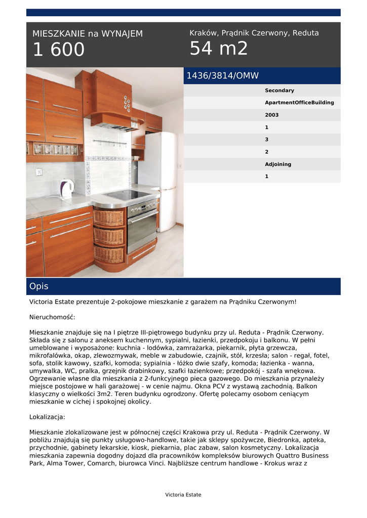 MIESZKANIE na WYNAJEM 1 600 Kraków, Prądnik Czerwony, Reduta 54 m2 1436/3814/OMW Secondary ApartmentOfficeBuilding 2003 1 3 2 Adjoining 1 Opis Victoria Estate prezentuje 2-pokojowe mieszkanie z garażem na Prądniku Czerwonym! Nieruchomość: Mieszkanie znajduje się na I piętrze III-piętrowego budynku przy ul. Reduta - Prądnik Czerwony. Składa się z salonu z aneksem kuchennym, sypialni, łazienki, przedpokoju i balkonu. W pełni umeblowane i wyposażone: kuchnia - lodówka, zamrażarka, piekarnik, płyta grzewcza, mikrofalówka, okap, zlewozmywak, meble w zabudowie, czajnik, stół, krzesła; salon - regał, fotel, sofa, stolik kawowy, szafki, komoda; sypialnia - łóżko dwie szafy, komoda; łazienka - wanna, umywalka, WC, pralka, grzejnik drabinkowy, szafki łazienkowe; przedpokój - szafa wnękowa. Ogrzewanie własne dla mieszkania z 2-funkcyjnego pieca gazowego. Do mieszkania przynależy miejsce postojowe w hali garażowej - w cenie najmu. Okna PCV z wystawą zachodnią. Balkon klasyczny o wielkości 3m2. Teren budynku ogrodzony. Ofertę polecamy osobom ceniącym mieszkanie w cichej i spokojnej okolicy. Lokalizacja: Mieszkanie zlokalizowane jest w północnej części Krakowa przy ul. Reduta - Prądnik Czerwony. W pobliżu znajdują się punkty usługowo-handlowe, takie jak sklepy spożywcze, Biedronka, apteka, przychodnie, gabinety lekarskie, kiosk, piekarnia, plac zabaw, salon kosmetyczny. Lokalizacja mieszkania zapewnia dogodny dojazd dla pracowników kompleksów biurowych Quattro Business Park, Alma Tower, Comarch, biurowca Vinci. Najbliższe centrum handlowe - Krokus wraz z Victoria Estate Multikinem i Parkiem Wodnym położone jest w odległości 600 m. Do Rynku Głównego - 6 km. Do najbliższego przystanku MPK "Marchołta" - 4 min. Komunikacja: Autobusy: 139, 182, 482, 601 Opłaty: 1600 zł najem + 338 zł opłata do wspólnoty + prąd + gaz Serdecznie polecam! Paulina Zajdel tel. +48 789 453 049 email: [email protected] Victoria Estate Powered by TCPDF (www.tcpdf.org)