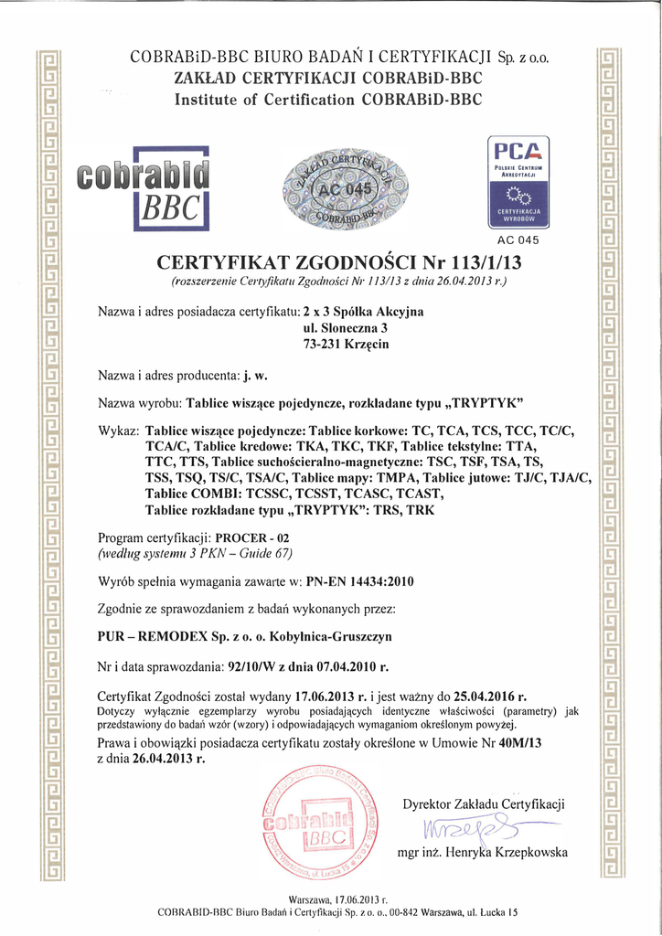 COBRABiD-BBC BIURO BADAŃ I CERTYFIKACJI Sp. z o.o. ZAKŁAD CERTYFIKACJI COBRABiD-BBC Institute of Certification COBRABiD-BBC PC� POLSICIE CENTRUM AKREDYTACJI AC 045 CERTYFIKAT ZGODNOŚCI Nr 113/1/13 (rozszerzenie Certyfikatu Zgodności Nr 113/13 z dnia 26.04.2013 r.) Nazwa i adres posiadacza cet1yfikatu: 2 x 3 Spółka Akcyjna ul. Sloneczna 3 73-231 Krzęcin Nazwa i adres producenta: j. w. Nazwa wyrobu: Tablice wiszące pojedyncze, rozkładane typu " TRYPTYK" Wykaz: Tablice wiszące pojedyncze: Tablice korkowe: TC, TCA, TCS, TCC, TC/C, TCA/C, Tablice kredowe: TKA, TKC, TKF, Tablice tekstylne: TTA, TTC, TTS, Tablice suchościeralno-magnetyczne: TSC, TSF, TSA, TS, TSS, TSQ, TS/C, TSA/C, Tablice mapy: TMP A, Tablice jutowe: TJ/C, TJA/C, Tablice COMBI: TCSSC, TCSST, TCASC, TCAST, Tablice rozkładane typu ,,TRYPTYK": TRS, TRK Program certyfikacji: PROCER- 02 (według systemu 3 PKN- Guide 67) Wyrób spełnia wymagania zawarte w: PN-EN 14434:2010 Zgodnie ze sprawozdaniem z badań wykonanych przez: PUR- REMODEX Sp. z o. o. Kobyłnica-Gruszczyn Nr i data sprawozdania: 92/10/W z dnia 07.04.2010 r. Cet1yfikat Zgodności został wydany 17.06.2013 r. i jest ważny do 25.04.2016 r. Dotyczy wyłącznie egzemplarzy wyrobu posiadających identyczne właściwości (parametry) jak przedstawiony do badar1 wzór (wzory) i odpowiadających wymaganiom określonym powyżej. Prawa i obowiązki posiadacza certyfikatu zostały określone w Umowie Nr 40M/13 z dnia 26.04.2013 r. ' ' Dyrektor Zakładu Certyfikacji �55 mgr inż. Henryka Krzepkawska Warszawa, 17.06.2013 COBRABID-BBC Biuro Badań i Certyfikacji Sp. z o. r. o., 00-842 Warszawa, ul. Łucka 15