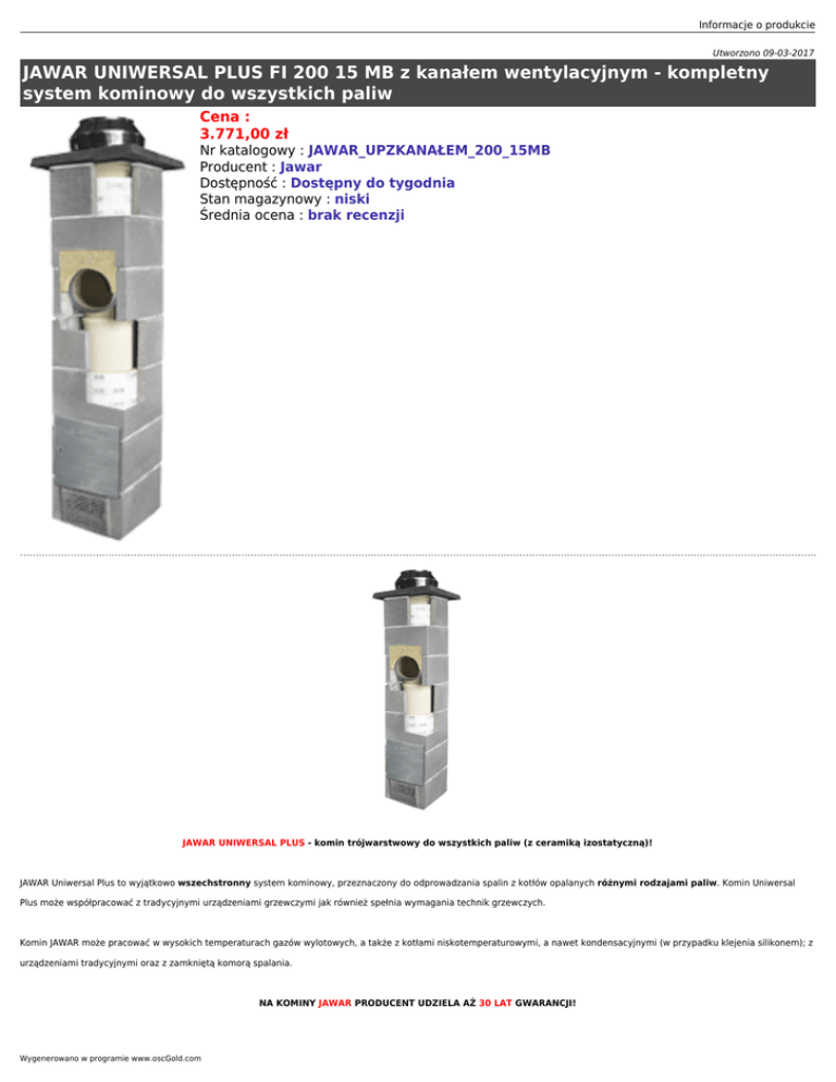 Informacje o produkcie Utworzono 09-03-2017 JAWAR UNIWERSAL PLUS FI 200 15 MB z kanałem wentylacyjnym - kompletny system kominowy do wszystkich paliw Cena : 3.771,00 zł Nr katalogowy : JAWAR_UPZKANAŁEM_200_15MB Producent : Jawar Dostępność : Dostępny do tygodnia Stan magazynowy : niski Średnia ocena : brak recenzji JAWAR UNIWERSAL PLUS - komin trójwarstwowy do wszystkich paliw (z ceramiką izostatyczną)! JAWAR Uniwersal Plus to wyjątkowo wszechstronny system kominowy, przeznaczony do odprowadzania spalin z kotłów opalanych różnymi rodzajami paliw. Komin Uniwersal Plus może współpracować z tradycyjnymi urządzeniami grzewczymi jak również spełnia wymagania technik grzewczych. Komin JAWAR może pracować w wysokich temperaturach gazów wylotowych, a także z kotłami niskotemperaturowymi, a nawet kondensacyjnymi (w przypadku klejenia silikonem); z urządzeniami tradycyjnymi oraz z zamkniętą komorą spalania. NA KOMINY JAWAR PRODUCENT UDZIELA AŻ 30 LAT GWARANCJI! Wygenerowano w programie www.oscGold.com Wieloletnie doświadczenie w technice kominowej pozwoliło nam wypracować rewolucyjne rozwiązanie jakim jest system kominowy JAWAR Uniwersal Plus. Pierwszy na rynku w pełni POLSKI system kominowy o najwyższych parametrach stworzony dla bezpieczeństwa, komfortu i wygody naszych klientów. Serce komina stanowi okrągła profilowana rura ceramiczna produkowana w oparciu o najnowsze osiągnięcia techniki prasowania izostatycznego. (na zdjęciu ceramika izostatyczna) Ceramika JAWAR charakteryzuje się wysoką odpornością na działanie agresywnego kondensatu, prawie zerową nasiąkliwością, wysoką szczelnością, mała pojemnością cieplną, odpornością na pożar sadzy i szoki termiczne. Obejrzyj film o ceramice izostatycznej firmy JAWAR: System kominowy Uniwersal Plus składa się z rur i kształtek ceramicznych, lekkiego pustaka keramzytobetonowego i izolacji wykonanej z wełny mineralnej grubszej od stosowanych obecnie na rynku do danej średnicy rury. Informacje o produkcie Wygenerowano w programie www.oscGold.com Opcjonalnie dokupić można płytę przykrywającą w cenie 135 zł (należy to uwzględnić przy dokonaniu przedpłaty)! Dane techniczne: Zapoznaj się z oficjalnym folderem producenta: kliknij tutaj Dodatkowe informacje na temat produktów firmy JAWAR znajdą Państwo na stronie internetowej: www.jawar.com.pl