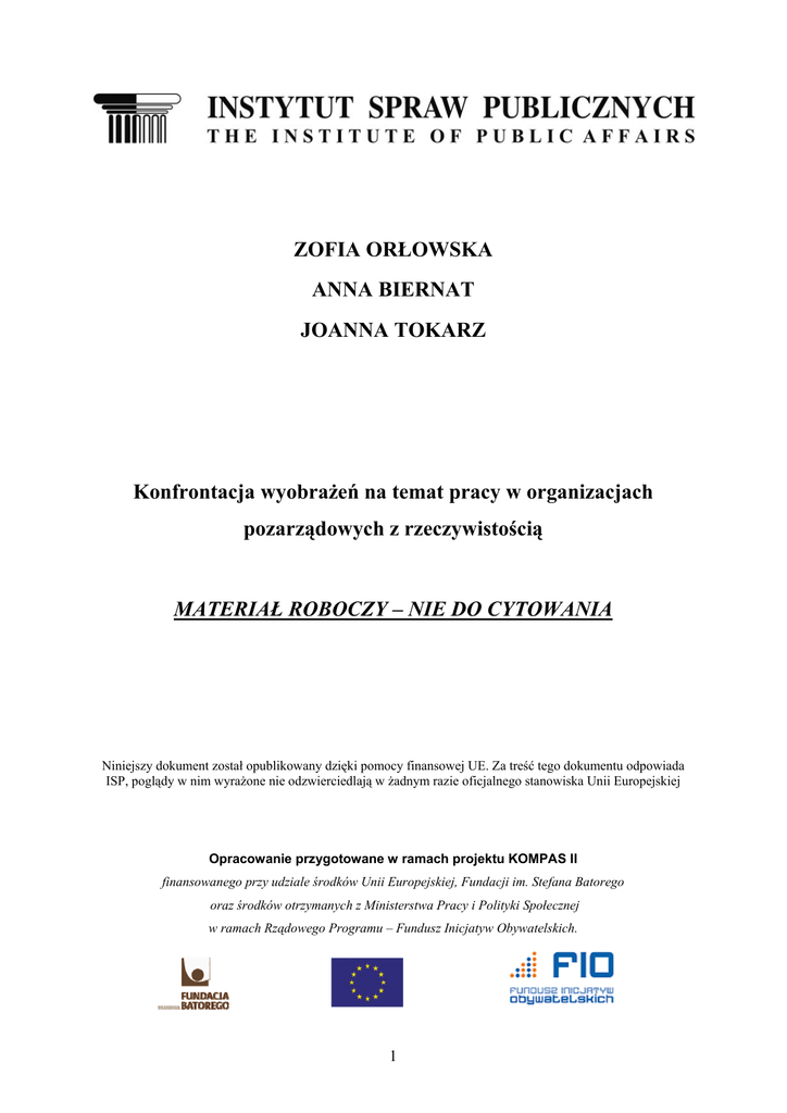 ZOFIA ORŁOWSKA ANNA BIERNAT JOANNA TOKARZ Konfrontacja wyobrażeń na temat pracy w organizacjach pozarządowych z rzeczywistością MATERIAŁ ROBOCZY – NIE DO CYTOWANIA Niniejszy dokument został opublikowany dzięki pomocy finansowej UE. Za treść tego dokumentu odpowiada ISP, poglądy w nim wyrażone nie odzwierciedlają w żadnym razie oficjalnego stanowiska Unii Europejskiej Opracowanie przygotowane w ramach projektu KOMPAS II finansowanego przy udziale środków Unii Europejskiej, Fundacji im. Stefana Batorego oraz środków otrzymanych z Ministerstwa Pracy i Polityki Społecznej w ramach Rządowego Programu – Fundusz Inicjatyw Obywatelskich. 1 . Wstęp Poniższy artykuł ma na celu porównanie oczekiwań i wiedzy związanych z ukończoną przez nas ścieżką specjalizacyjną w ramach studiów w Instytucie Stosowanych Nauk Społecznych „Polityka społeczna – specjalista do spraw organizacji pozarządowych” z doświadczeniami w naszej kilkuletniej pracy w różnych organizacjach pozarządowych. Punktem wyjścia do rozważań jest decyzja o wyborze specjalizacji o tej tematyce, krótki opis i ocena oferty edukacyjnej ścieżki – w jakim stopniu oraz jak wzbogaca i wspiera pracę w trzecim sektorze. Kolejnym punktem analizy jest konfrontacja wyobrażeń, wiedzy teoretycznej z pracą w organizacji. Celem tej części opracowania był krótki opis różnych aspektów pracy w ngo w oparciu także o dane z różnego rodzaju badań i analiz. Jest to na tyle zróżnicowane środowisko i obszar, że z pewnością trudno będzie nam omówić wszystkie jego elementy i przedstawić obiektywny obraz pracy w organizacji. Zależy nam na przedstawieniu tych aspektów – problemów czy też pozytywnych stron, z którymi spotykamy się na co dzień w naszej pracy oraz w kontaktach z innymi organizacjami. Ostatnim elementem naszych rozważań jest przedstawienie perspektywy środowiska i osób pracujących w organizacjach pozarządowych i wyobrażeń osób, które nie mają nic wspólnego z pracą w trzecim sektorze. Niestety w Polsce wiedza o organizacjach jest jeszcze bardzo mała, jak i obarczona wieloma stereotypami i brakiem wiedzy na temat ich działalności. Pracując w organizacjach, często spotykamy się z brakiem zrozumienia charakteru naszej pracy. Jest to naszym zdaniem bardzo ciekawy obszar i tak naprawdę mógłby stać się podstawą do szerszej analizy. W naszej prezentacji chciałybyśmy przedstawić zaledwie fragment obserwacji dokonanej na podstawie kilku wywiadów. 2 CZĘŚĆ I Kształcenie kadry trzeciego sektora Zawód socjologa to jest od wszystkiego i niczego, ale wiem, że twoje studia dawały różnorodność i to od studenta zależy jaką ścieżkę wybierze i w jakim kierunku podąży. Ty pracujesz w Akademii Rozwoju Filantropii. (studentka położnictwa, Akademii Medycznej , 21 lat, niezwiązana z trzecim sektorem) Potrzeba naukowej refleksji Wraz z rozwojem infrastruktury i profesjonalizacją sektora organizacji pozarządowych w Polsce zaistniała potrzeba szerszej refleksji zarówno naukowej dotyczącej struktury, kierunków rozwoju, jak i analizy porównawczej z sytuacją w innych krajach. Niezbędni są także specjaliści, którzy w tej tematyce będą się biegle poruszać, a dzięki przyjęciu perspektywy szerszej niż ich macierzysta organizacja będą umieli spojrzeć na sektor całościowo i interpretować jego zadania w kategorii interesu wspólnego. Wraz z otwieraniem się nowych możliwości rozwoju organizacji społecznych najprawdopodobniej kolejne wydziały socjologiczne sięgają i będą sięgać po tematykę związaną z trzecim sektorem. W chwili obecnej wiedzę z zakresu działania organizacji pozarządowych można zdobywać m.in. w Instytucie Stosowanych Nauk Społecznych na Uniwersytecie Warszawskim. Pierwsza część artykułu będzie prezentować refleksje, odczucia związane z naszymi doświadczeniami. Motywacja do wyboru ścieżki Wybrałam tę ścieżkę, bo po doświadczeniach wolontariatu wiązałam swoją przyszłość z organizacjami pozarządowymi. Wydawało mi się, że dzięki niej poszerzę moją wiedzę na temat działalności organizacji pozarządowych w Polsce i na świecie. (studentka V roku) W Instytucie Stosowanych Nauk Społecznych realizowana jest ścieżka specjalizacyjna „Polityka społeczna – specjalista ds. organizacji pozarządowych”. Zajęcia, w których mają możliwość uczestniczenia studenci między trzecim a piątym rokiem studiów to kompilacja teorii i praktyki. Studia na powyższej specjalizacji uzupełnione są także o praktyki w wybranej przez studenta organizacji pozarządowej (w wymiarze 60 h). Obowiązkowy staż ma na celu lepsze poznanie i zrozumienie funkcjonowania stowarzyszeń i fundacji w praktyce. Daje również możliwość zweryfikowania czy odpowiada nam praca w tym sektorze, w jakim 3 obszarze koncentrują się nasze zainteresowania. Ponadto jest to również szansa poznania bliżej ludzi już pracujących, nawiązania znajomości, kontaktów. Specjalizacja ta cieszy się dużą popularnością – średnio ze 100 studentów na roku, wybiera ją ok. 40 osób. Jest to jednym z lepszych wyników, mimo, iż panuje przekonanie, że wymaga ona dużego nakładu pracy, a wykładowcy są wymagający i stawiają przed studentami wiele zadań. Często jedną z motywacji do podjęcia ścieżki są wcześniejsze doświadczenia w organizacjach (wolontariat, sport itp.), działalność społeczna (np. w harcerstwie) oraz chęć, by wiedzę intuicyjną podbudować i poszerzyć. Tak było także w naszym wypadku. Zazwyczaj studenci ISNSu wybierają dwie lub więcej ścieżek specjalizacyjnych, co ma znaczenie z punktu widzenia ich przyszłej kariery – od tego często uzależniają wybór organizacji, w której odbędą praktyki i z którą, być może zwiążą swoją przyszłą karierę. Ścieżka organizacji pozarządowych dostarcza narzędzia, wiedzę na temat pracy w organizacji. Natomi
