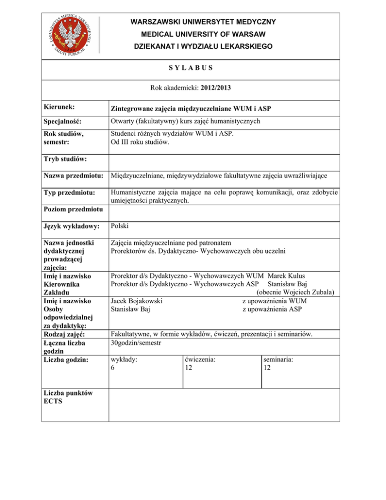 WARSZAWSKI UNIWERSYTET MEDYCZNY MEDICAL UNIVERSITY OF WARSAW DZIEKANAT I WYDZIAŁU LEKARSKIEGO SYLABUS Rok akademicki: 2012/2013 Kierunek: Zintegrowane zajęcia międzyuczelniane WUM i ASP Specjalność: Otwarty (fakultatywny) kurs zajęć humanistycznych Rok studiów, semestr: Studenci róŜnych wydziałów WUM i ASP. Od III roku studiów. Tryb studiów: Nazwa przedmiotu: Międzyuczelniane, międzywydziałowe fakultatywne zajęcia uwraŜliwiające Typ przedmiotu: Humanistyczne zajęcia mające na celu poprawę komunikacji, oraz zdobycie umiejętności praktycznych. Poziom przedmiotu Język wykładowy: Polski Nazwa jednostki dydaktycznej prowadzącej zajęcia: Imię i nazwisko Kierownika Zakładu Imię i nazwisko Osoby odpowiedzialnej za dydaktykę: Rodzaj zajęć: Łączna liczba godzin Liczba godzin: Zajęcia międzyuczelniane pod patronatem Prorektorów ds. Dydaktyczno- Wychowawczych obu uczelni Liczba punktów ECTS Prorektor d/s Dydaktyczno - Wychowawczych WUM Marek Kulus Prorektor d/s Dydaktyczno - Wychowawczych ASP Stanisław Baj (obecnie Wojciech Zubala) Jacek Bojakowski z upowaŜnienia WUM Stanisław Baj z upowaŜnienia ASP Fakultatywne, w formie wykładów, ćwiczeń, prezentacji i seminariów. 30godzin/semestr wykłady: 6 ćwiczenia: 12 seminaria: 12 2 Wykłady, udział w prezentacjach filmowych, wystawach, pokazach, zajęcia z Metody pacjentami z przewlekłymi uszkodzeniami centralnego układu nerwowego dydaktyczne (organizacja zajęć) (dziećmi i dorosłymi), dyskusje na temat problemów i metod. Połączenie zajęć praktycznych z teorią i dyskusją. Studenci III, IV, V, VI roku Wymagania wstępne Nawiązanie do humanistycznych tradycji medycyny. Poprawa relacji lekarz-pacjent, lekarz-rodzina pacjenta. Poprawa wizerunku medialnego lekarza. UwraŜliwienie lekarza na piękno(nie tylko fizyczne). Zdobycie umiejętności i uprawnień opieki nad przewlekle chorymi dla studentów (takŜe innych poza lekarskim i pielęgniarskim) wydziałów WUM. Werbalne i pozawerbalne metody komunikacji międzyludzkiej. Zastosowanie sztuki, jako metody pozawerbalnego porozumienia między ludźmi. Zastosowanie sztuki w rehabilitacji i leczeniu. Zdobycie umiejętności terapii sztuką dla studentów ASP. Efekty kształcenia - w zakresie wiedzy Pogłębienie wiedzy humanistycznej w zakresie historii sztuki, medycyny, filozofii, psychologii. student: Rehabilitacja osób z uszkodzeniem centralnego układu nerwowego. Terapia sztuką. Umiejętność wraŜliwego spojrzenia na problem innego człowieka. - w zakresie Podstawy terapii i rehabilitacji podczas aktywności twórczych. umiejętności Umiejętności komunikacyjne interpersonalne. student: Poznanie róŜnych metod komunikacji. - w zakresie UwraŜliwienie na potrzeby innego człowieka. kompetencji Poznanie własnych moŜliwości ekspresyjnych. personalnoPoprawa wizerunku lekarza i artysty. społecznych Podkreślenie społecznej roli medycyny i sztuki. Zaliczenie jako podsumowanie wiedzy i umiejętności praktycznych – Metody oceny w oparciu o własne propozycje studenta oraz aktywny udział w zajęciach. pracy studenta Forma dyskusji nad zaproponowanym tematem. (forma i warunki zaliczenia przedmiotu) Psychologia Literatura Sztuka i jej wpływ na twórcę i odbiorcę. obowiązkowa: Aktywność twórcza intelektualna i ruchowa. Cele kształcenia Literatura uzupełniająca: KsiąŜki: Edwards David B.: Art therapy. London: SAGE, 2004. ISBN 978-0-76194751-6. Malchiodi Cathy A.: The art therapy sourcebook. New York: McGraw-Hill, 2007. ISBN 0-07-146827-7. Konieczna Ewelina J.: Arteterapia w teorii i praktyce. Kraków: Oficyna Wydawnicza "Impuls", 2007. ISBN 978-83-7308-972-3. 3 Czasopisma: Arteterapia w medycynie i edukacji (red. Wiesław Karolak, Barbara Kaczorowska: Łódź: WyŜsza Szkoła Humanistyczno-Ekonomiczna, 2008. ISBN 978-83-7405-282-5. Stańko, Maja: Arteterapia jako metoda profesjonalnej pomocy chorym na nowotwory: "Współczesna Onkologia", 12 (3), s.148-152,2008. Beth Bond: Dose of cultural sensitivity helpful in health care setting Austin news. Oct. 6, 2010 . Hechinger Fred M.: About Education; Sensitivity Found Lacking in Doctors' Training. NYTimes.com. Space & Cosmos. April 19, 1983 Study finds doctor sensitivity most important to patients: Uncategorized Add comments Share Press Ganey. Mar. 06 Koło naukowe Regulamin: Prowadzący zajęcia: są dostępni i słuŜą studentom nauką, przykładem i radą, są zobowiązani do zorganizowania zajęć zgodnie z zasadami higieny i bezpieczeństwa. Studenci są zobowiązani : do punktualnego i czynnego uczestnictwa w zajęciach, przestrzegają zasad higieny i grzeczności, w szczególności wobec pacjentów. Prof.dr hab. Stanisław Baj Dr n.med.Jacek Bojakowski ................................................. podpis prowadzącego zajęcia