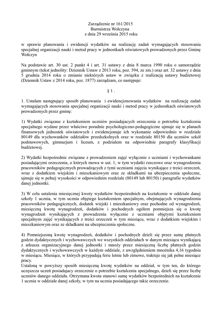 Zarządzenie nr 161/2015 Burmistrza Wołczyna z dnia 29 września 2015 roku w sprawie planowania i ewidencji wydatków na realizację zadań wymagających stosowania specjalnej organizacji nauki i metod pracy w jednostkach oświatowych prowadzonych przez Gminę Wołczyn Na podstawie art. 30 ust. 2 punkt 4 i art. 31 ustawy z dnia 8 marca 1990 roku o samorządzie gminnym (tekst jednolity: Dziennik Ustaw z 2013 roku, poz. 594, ze zm.) oraz art. 32 ustawy z dnia 5 grudnia 2014 roku o zmianie niektórych ustaw w związku z realizacją ustawy budżetowej (Dziennik Ustaw z 2014 roku, poz. 1877) zarządzam, co następuje: §1. 1. Ustalam następujący sposób planowania i ewidencjonowania wydatków na realizację zadań wymagających stosowania specjalnej organizacji nauki i metod pracy w jednostkach oświatowych prowadzonych przez gminę: 1) Wydatki związane z kształceniem uczniów posiadajacych orzeczenia o potrzebie ksztalcenia specjalnego wydane przez właściwe poradnie psychologiczno-pedagogiczne ujmuje się w planach finansowych jednostek oświatowych i ewidencjonuje ich wykonanie odpowiednio w rozdziale 80149 dla wychowanków oddziałów przedszkolnych oraz w rozdziale 80150 dla uczniów szkół podstawowych, gimnazjum i liceum, z podzialem na odpowiednie paragrafy klasyfikacji budżetowej. 2) Wydatki bezpośrednie związane z prowadzeniem zajęć wyłącznie z uczniami i wychowankami posiadającymi orzeczenia, o których mowa w ust. 1, w tym wydatki rzeczowe oraz wynagrodzenia pracowników pedagogicznych prowadzących z tymi uczniami zajęcia wynikające z treści orzeczeń, wraz z dodatkiem wiejskim i mieszkaniowym oraz ze składkami na ubezpieczenia społeczne, ujmuje się w pełnej wysokości w odpowiednim rozdziale (80149 lub 80150) i paragrafie wydatków danej jednostki. 3) W celu ustalenia miesięcznej kwoty wydatków bezpośrednich na kształcenie w oddziale danej szkoły 1 ucznia, w tym ucznia objętego kształceniem specjalnym, obejmujących wynagrodzenia pracowników pedagogicznych, dodatek wiejski i mieszkaniowy oraz pochodne od wynagrodzeń, miesięczną kwotę wynagrodzeń, dodatków i pochodnych ogółem pomniejsza się o kwotę wynagrodzeń wynikających z prowadzenia wyłącznie z uczniami objętymi kształceniem specjalnym zajęć wynikających z treści orzeczeń w tym miesiącu, wraz z dodatkiem wiejskim i mieszkaniowym oraz ze składkami na ubezpieczenia społeczne. 4) Pomniejszoną kwotę wynagrodzeń, dodatków i pochodnych dzieli się przez sumę płatnych godzin dydaktycznych i wychowawczych we wszystkich oddziałach w danym miesiącu wynikającą z arkusza organizacyjnego danej jednostki i mnoży przez miesięczną liczbę płatnych godzin dydaktycznych i wychowawczych w każdym oddziale, z uwzględnieniem mnożnika 4,16 tygodnia w miesiącu. Miesiące, w których przypadają ferie letnie lub zimowe, traktuje się jak pełne miesiące pracy. Ustaloną w powyższy sposób miesięczną kwotę wydatków na oddział, w tym ten, do którego uczęszcza uczeń posiadajacy orzeczenie o potrzebie ksztalcenia specjalnego, dzieli się przez liczbę uczniów danego oddziału. Otrzymana kwota stanowi sumę wydatków bezpośrednich na kształcenie 1 ucznia w oddziale danej szkoły, w tym na ucznia posiadającego takie orzeczenie. 5) W celu ustalenia miesięcznej kwoty wydatków pośrednich na kształcenie w oddziale danej szkoły 1 ucznia, w tym ucznia objętego kształceniem specjalnym, obejmujących wynagrodzenia, pochodne i odpisy na ZFŚS pracowników pedagogicznych i niepedagogicznych, oraz wydatki rzeczowe działalności podstawowej po ich pomniejszeniu o wydatki zakwalifikowane bezpośrednio do wydatków kształcenia specjalnego opisane w ust. 1 punkt 2, wymienione kwoty wydatków dzieli się przez liczbę uczniów. 6) W celu ustalenia miesięcznej kwoty wydatków na opiekę świetlicową na 1 korzystającego ze świetlicy miesięczną kwotę wydatków w rozdziale dzieli się przez liczbę korzystających. 7) W celu ustalenia średniej kwoty wydatków na 1 posiłek w stołówce miesięczną kwotę wydatków dzieli się przez liczbę posiłków przewidzianych do przygotowania w danym miesiącu. 2. Do ustalenia kwot wydatków, o ktorych mowa w ust. 1 punkt 3 – 5, na realizację zadań wymagających stosowania specjalnej organizacji nauki i metod pracy w jednostkach oświatowych na okres od 1 stycznia do 31 marca w 2015 roku i w latach następnych przyjmuje się liczbę uczniów posiadajacych orzeczenia o potrzebie ksztalcenia specjalnego wydane przez właściwe poradnie psychologiczno-pedagogiczne według danych z SIO na dzień 30 września roku poprzedzającego. 3. Do ustalenia kwot wydatków, o ktorych mowa w ust. 1 punkt 3 – 5, na realizację zadań wymagających stosowania specjalnej organizacji nauki i metod pracy w jednostkach oświatowych na okres od 1 kwietnia do 31 sierpnia w 2015 roku i w latach następnych przyjmuje się liczbę uczniów posiadajacych orzeczenia o potrzebie ksztalcenia specjalnego wydane przez właściwe poradnie psychologiczno-pedagogiczne według danych z SIO na dzień 31 marca danego roku. 4. Do ustalenia kwot wydatków, o ktorych mowa w ust. 1 punkt 3 – 5, na realizację zadań wymagających stosowania specjalnej organizacji nauki i metod pracy w jednostkach oświatowych na okres od 1 września do 31 grudnia w 2015 roku i i w latach następnych przyjmuje się liczbę uczniów posiadajacych orzeczenia o potrzebie ksztalcenia specjalnego wydane przez właściwe poradnie psychologiczno-pedagogiczne według danych z SIO na dzień 30 września danego roku. § 2. Zarządzenie wchodzi w życie z dniem podpisania z mocą obowiązującą od dnia 1 stycznia 2015 roku. Burmistrz mgr Jan Leszek Wiącek