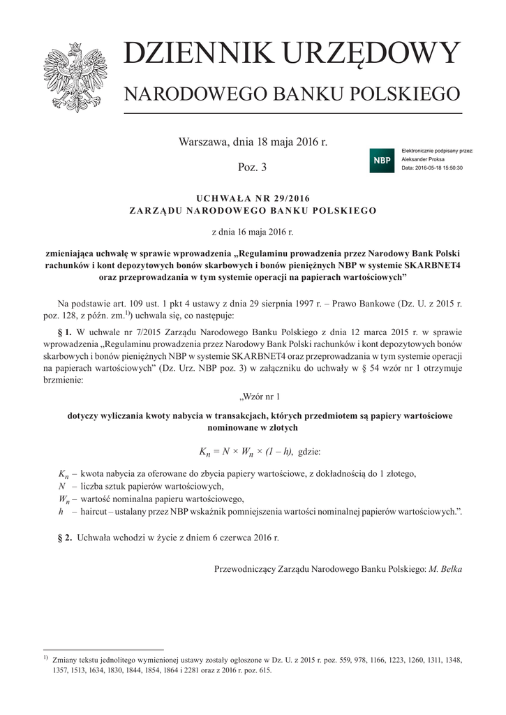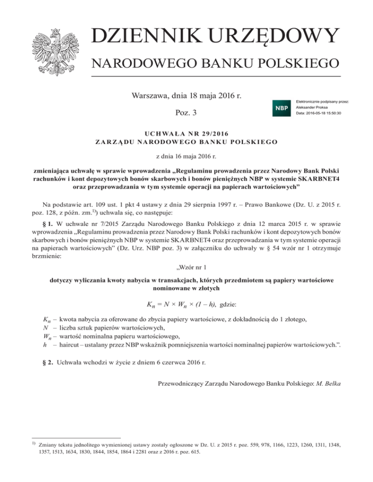 DZIENNIK URZĘDOWY NARODOWEGO BANKU POLSKIEGO Warszawa, dnia 18 maja 2016 r. Poz. 3 Elektronicznie podpisany przez: Aleksander Proksa Data: 2016-05-18 15:50:30 UC H WA Ł A N R 29/2 016 Z A R Z Ą DU NA ROD OW EG O BA N K U POLSK I EG O z dnia 16 maja 2016 r. zmieniająca uchwałę w sprawie wprowadzenia „Regulaminu prowadzenia przez Narodowy Bank Polski rachunków i kont depozytowych bonów skarbowych i bonów pieniężnych NBP w systemie SKARBNET4 oraz przeprowadzania w tym systemie operacji na papierach wartościowych” Na podstawie art. 109 ust. 1 pkt 4 ustawy z dnia 29 sierpnia 1997 r. – Prawo Bankowe (Dz. U. z 2015 r. poz. 128, z późn. zm.1)) uchwala się, co następuje: § 1. W uchwale nr 7/2015 Zarządu Narodowego Banku Polskiego z dnia 12 marca 2015 r. w sprawie wprowadzenia „Regulaminu prowadzenia przez Narodowy Bank Polski rachunków i kont depozytowych bonów skarbowych i bonów pieniężnych NBP w systemie SKARBNET4 oraz przeprowadzania w tym systemie operacji na papierach wartościowych” (Dz. Urz. NBP poz. 3) w załączniku do uchwały w § 54 wzór nr 1 otrzymuje brzmienie: „Wzór nr 1 dotyczy wyliczania kwoty nabycia w transakcjach, których przedmiotem są papiery wartościowe nominowane w złotych Kn = N × Wn × (1 – h), gdzie: Kn – kwota nabycia za oferowane do zbycia papiery wartościowe, z dokładnością do 1 złotego, N – liczba sztuk papierów wartościowych, Wn– wartość nominalna papieru wartościowego, h – haircut – ustalany przez NBP wskaźnik pomniejszenia wartości nominalnej papierów wartościowych.”. § 2. Uchwała wchodzi w życie z dniem 6 czerwca 2016 r. Przewodniczący Zarządu Narodowego Banku Polskiego: M. Belka 1) Zmiany tekstu jednolitego wymienionej ustawy zostały ogłoszone w Dz. U. z 2015 r. poz. 559, 978, 1166, 1223, 1260, 1311, 1348, 1357, 1513, 1634, 1830, 1844, 1854, 1864 i 2281 oraz z 2016 r. poz. 615.
