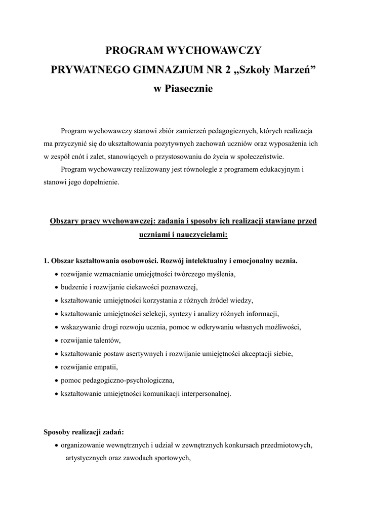 PROGRAM WYCHOWAWCZY PRYWATNEGO GIMNAZJUM NR 2 „Szkoły Marzeń” w Piasecznie Program wychowawczy stanowi zbiór zamierze ma rzyczyni si o e a o icznych szta towania ozytywnych zachowa w zes ó cnót i za et stanowi cych o rzystosowani tórych rea izac a czniów oraz wy osa enia ich o ycia w s o ecze stwie. Pro ram wychowawczy rea izowany est równo e e z ro ramem e acy nym i stanowi e o o e nienie. Obszary pracy wychowawczej: zadania i sposoby ich realizacji stawiane przed uczniami i nauczycielami: zar k z ał o a a o o o o Roz ój elek ual y emo jo al y u z a rozwi anie wzmacnianie mie tno ci twórcze o my enia, b zenie i rozwi anie cie awo ci oznawcze , szta towanie mie tno ci orzystania z ró nych ró e wie zy, szta towanie mie tno ci se e c i syntezy i ana izy ró nych in ormac i, ws azywanie ro i rozwo cznia omoc w o rywani w asnych mo iwo ci, rozwi anie ta entów szta towanie ostaw asertywnych i rozwi anie mie tno ci a ce tac i siebie, rozwijanie empatii, pomoc pedagogiczno-psychologiczna, szta towanie mie tno ci om ni ac i inter ersona ne . S o o y real za j za ań: or anizowanie wewn trznych i zia w zewn trznych on artystycznych oraz zawodach sportowych, rsach rze miotowych, or anizowanie roczysto ci sz o nych, a tywnianie czniów o rzez w rowa zenie narz zi samo szta cenia, prezentacja najciekawszych prac samodzielnych na forum sz o y prezentacja prac plastycznych, stosowanie nowych meto na czania a tywiz cych cznia na e c i, za oznawanie czniów z ró nymi ró ami wie zy i in ormac i, or anizowanie rzez na czycie i wio cych rze miotów zor anizowanie a czniów ze s ecy icznymi tr ons tac i no ciami w czeni za kompensacyjno-wyrównawczych realizacja Programu Profilaktycznego PG nr 2 bo ata o erta za na obowi z owych t . o a rze miotowe o a zainteresowa it . realizacja programu pracy z uczniem zdolnym. zar ar o uma y z y za o ań ro ołe z y w a anie rze onania o na rz no ci obra ws ó ne o, funkcjonowanie ucznia w grupie, inte rac a zes o asowe o szta towanie mie tno ci komunikacji interpersonalnej, azywanie wa no ci ona czasowe o stawy patriotycznej, szta towanie mie tno ci om ni ac i inter ersona ne , szta towanie mie tno ci o onywania oceny i inter retac i zachowa w asnych i innych w duchu tolerancji i poszanowania a rac i r ie o cz owie a kultywowanie tradycji narodowych, religijnych i rodzinnych, wy szta cenie oszanowania szta towanie mie tno ci o czytywania ró nych orm iterac ich a zy a historii i tra yc i w asne o naro t ry: obrazów te stów rze azów m time ia nych za oznawanie z orob iem t rowym naro i wiata, azywanie rze onania o otrzebie osia ania w asne o z ania oraz onieczno ci zachowania s werenno ci my enia w z o zie z o ó nie rzy tymi zasa ami ws ó ycia, omoc w rze ci o szta towanie ocz cia o omoc we w a ciwe ocenie zwi z ów mi zy osobami o mienne o wia cze osobistych o ocen z awis t rowych, owie zia no ci za o e mowane ecyz e, ci, szta towanie w a ciwych zachowa z rowotnych i hi ienicznych, romoc a z rowe o sty szta towanie mie tno ci samo zie ne o o onywania w a ciwych wyborów, ycia, chroni cych z rowie w asne i innych zi. S o o y real za j za ań: emo ratyczne wybory samorz ów asowych i sz o y, a tywizac a rac samorz ów, or anizowanie ws ó nych im rez asowych i sz o nych organizowanie i przeprowadzanie akcji charytatywnych realizacja Programu Profilaktycznego PG nr 2 organizowanie wycieczek szkolnych przeprowadzanie on rsów o charakterze regionalnym (plastyczne, humanistyczne), or anizowanie s ot a z artystami cie awymi rze stawicie ami ró nych zawo ów or anizowanie roczysto ci sz o nych zwi zanych ze wi tami naro owymi or anizowanie wy az ów o teatr m ze m a erii rea izac a ro ram „Zie ona Sz o a” kultywowanie obrz ów re i i nych (wigilia szkolna, spotkania wielkanocne) w czanie si w o ó no o s ie a c e charytatywne (n . WOŚP) zary ar o e ycznych i estetycznych o e mowanie o owie zia no ci za siebie i innych oraz za o onane wybory mora ne, wia omienie wa nych rob emów mora nych, ws azywanie znaczenia zasa mora nych szta towanie re e sy ne mora ne as e ty stos n a rozwo osobiste o cz owie a ostawy cz owie a e o nat ry owinno ci mora nych, cz owie a o wiata rzyro y, zwrócenie wa i na ta ie as e ty ycia a raca i e warto ci a cz owie a oraz etyka zawodowa, rozwi anie wa orów racowito ci rzete no ci wytrwa o ci, szta towanie mie tno ci stawiania i osi ania ce ów, wskazywanie zasad moralnych reli ii chrze ci a s ie oraz innych re i ii wiata, wychowanie w ate oriach by a nie ty o mie , wdra anie o wia ome o os sze stwa i samo yscy iny, s anianie czniów o czynienia obra szta towanie mie tno ci rozró niania obra i z a, omoc w e iminowani zachowa estr tywnych, azywanie i na, w ra anie czniów o estety i zachowa , ubioru, tros i o i no asy sz o y S o o y real za j za ań: azywanie wzorców osobowych zainteresowanie iterat r szt o nych o na a owania (spotkania, dyskusja), , filmem, w ra anie o rzestrze ania norm obowi z cych w s o ecze stwie (apele, godziny wychowawcze), o awanie rzy a ów obre o i z e o ost owania na o stawie tworów iterac ich i obserwac i wy arze z ycia co zienne o, organizowanie a c i charytatywnych (Sz o ny K b Wo ontari sza „I t m”) organizowanie roczysto ci a stwowych, szkolnych, religijnych, or anizowanie wy az ów o teatr m ze m a erii zia w s e ta ach teatra nych or anizac a za artystycznych ( astycznych m zycznych i mowych teatra nych).