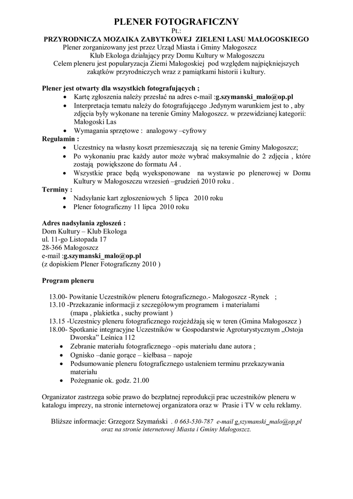PLENER FOTOGRAFICZNY Pt.: PRZYRODNICZA MOZAIKA ZABYTKOWEJ ZIELENI LASU MAŁOGOSKIEGO Plener zorganizowany jest przez Urząd Miasta i Gminy Małogoszcz Klub Ekologa działający przy Domu Kultury w Małogoszczu Celem pleneru jest popularyzacja Ziemi Małogoskiej pod względem najpiękniejszych zakątków przyrodniczych wraz z pamiątkami historii i kultury. Plener jest otwarty dla wszystkich fotografujących ; · Kartę zgłoszenia należy przesłać na adres e-mail :[email protected] · Interpretacja tematu należy do fotografującego .Jedynym warunkiem jest to , aby zdjęcia były wykonane na terenie Gminy Małogoszcz. w przewidzianej kategorii: Małogoski Las · Wymagania sprzętowe : analogowy –cyfrowy Regulamin : · Uczestnicy na własny koszt przemieszczają się na terenie Gminy Małogoszcz; · Po wykonaniu prac każdy autor może wybrać maksymalnie do 2 zdjęcia , które zostają powiększone do formatu A4 . · Wszystkie prace będą wyeksponowane na wystawie po plenerowej w Domu Kultury w Małogoszczu wrzesień –grudzień 2010 roku . Terminy : · Nadsyłanie kart zgłoszeniowych 5 lipca 2010 roku · Plener fotograficzny 11 lipca 2010 roku Adres nadsyłania zgłoszeń : Dom Kultury – Klub Ekologa ul. 11-go Listopada 17 28-366 Małogoszcz e-mail :[email protected] (z dopiskiem Plener Fotograficzny 2010 ) Program pleneru 13.00- Powitanie Uczestników pleneru fotograficznego.- Małogoszcz -Rynek ; 13.10 -Przekazanie informacji z szczegółowym programem i materiałami (mapa , plakietka , suchy prowiant ) 13.15 -Uczestnicy pleneru fotograficznego rozjeżdżają się w teren (Gmina Małogoszcz ) 18.00- Spotkanie integracyjne Uczestników w Gospodarstwie Agroturystycznym „Ostoja Dworska” Leśnica 112 · Zebranie materiału fotograficznego –opis materiału dane autora ; · Ognisko –danie gorące – kiełbasa – napoje · Podsumowanie pleneru fotograficznego ustaleniem terminu przekazywania materiału · Pożegnanie ok. godz. 21.00 Organizator zastrzega sobie prawo do bezpłatnej reprodukcji prac uczestników pleneru w katalogu imprezy, na stronie internetowej organizatora oraz w Prasie i TV w celu reklamy. Bliższe informacje: Grzegorz Szymański . 0 663-530-787 e-mail [email protected] oraz na stronie internetowej Miasta i Gminy Małogoszcz.