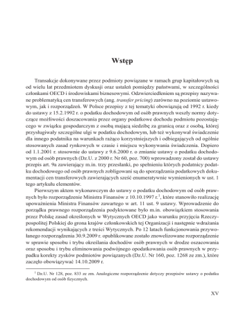 Wstęp Transakcje dokonywane przez podmioty powiązane w ramach grup kapitałowych są od wielu lat przedmiotem dyskusji oraz ustaleń pomiędzy państwami, w szczególności członkami OECD i środowiskami biznesowymi. Odzwierciedleniem są przepisy nazywane problematyką cen transferowych (ang. transfer pricing) zarówno na poziomie ustawowym, jak i rozporządzeń. W Polsce przepisy z tej tematyki obowiązują od 1992 r. kiedy do ustawy z 15.2.1992 r. o podatku dochodowym od osób prawnych weszły normy dotyczące możliwości doszacowania przez organy podatkowe dochodu podmiotu pozostającego w związku gospodarczym z osobą mającą siedzibę za granicą oraz z osobą, której przysługiwały szczególne ulgi w podatku dochodowym, lub też wykonywał świadczenie dla innego podatnika na warunkach rażąco korzystniejszych i odbiegających od ogólnie stosowanych zasad rynkowych w czasie i miejscu wykonywania świadczenia. Dopiero od 1.1.2001 r. stosownie do ustawy z 9.6.2000 r. o zmianie ustawy o podatku dochodowym od osób prawnych (Dz.U. z 2000 r. Nr 60, poz. 700) wprowadzony został do ustawy przepis art. 9a zawierający m.in. trzy przesłanki, po spełnieniu których podatnicy podatku dochodowego od osób prawnych zobligowani są do sporządzania podatkowych dokumentacji cen transferowych zawierających sześć enumeratywnie wymienionych w ust. 1 tego artykułu elementów. Pierwszym aktem wykonawczym do ustawy o podatku dochodowym od osób prawnych było rozporządzenie Ministra Finansów z 10.10.1997 r., które stanowiło realizację upoważnienia Ministra Finansów zawartego w art. 11 ust. 9 ustawy. Wprowadzenie do porządku prawnego rozporządzenia podyktowane było m.in. obowiązkiem stosowania przez Polskę zasad określonych w Wytycznych OECD jako warunku przyjęcia Rzeczypospolitej Polskiej do grona krajów członkowskich tej Organizacji i następnie wdrażania rekomendacji wynikających z treści Wytycznych. Po 12 latach funkcjonowania przywołanego rozporządzenia 30.9.2009 r. opublikowane zostało znowelizowane rozporządzenie w sprawie sposobu i trybu określania dochodów osób prawnych w drodze oszacowania oraz sposobu i trybu eliminowania podwójnego opodatkowania osób prawnych w przypadku korekty zysków podmiotów powiązanych (Dz.U. Nr 160, poz. 1268 ze zm.), które zaczęło obowiązywać 14.10.2009 r. Dz.U. Nr 128, poz. 833 ze zm. Analogiczne rozporządzenie dotyczy przepisów ustawy o podatku dochodowym od osób fizycznych. XV Wstęp Po niespełna czterech latach obowiązywania rozporządzenia z 2009 r. Ministerstwo Finansów rozpoczęło prace nad jego nowelizacją. Powodem zmian, jakie zostały opublikowane 17.6.2013 r. była rewizja Wytycznych OECD w sprawie cen transferowych dla przedsiębiorstw wielonarodowych oraz administracji podatkowych z czerwca 2010 r. oraz rekomendacje wynikające z prac Wspólnego Forum UE ds. Cen Transferowych prowadzonych w okresie od kwietnia 2009 r. do czerwca 2010 r.. Znowelizowane rozporządzenie Ministra Finansów obowiązujące od 18.7.2013 r. (Dz.U. z 2013 r. poz. 768) wprowadziło wiele istotnych zmian oraz nowych unormowań. Po pierwsze, zmieniono zasady wyboru metod ustalania cen transferowych. Uchylono bowiem pkt 3 § 12 SzacDochR, który odnosił się do sytuacji zastosowania metody porównywalnej ceny niekontrolowanej w pierwszej kolejności przed innymi metodami. Zmianę należy ocenić pozytywnie, gdyż pozwala podatnikom na użycie innej metody lub kilku innych metod do ustalania ceny transakcji, np. metod zysku transakcyjnego, których wybór jest łatwiejszy niż metody tradycyjne. Należy jednak zwrócić uwagę, że ustawodawca jednocześnie wprowadził do rozporządzenia nowe zapisy (pkt 2 i 2a), które nadają organom podatkowym i organom kontroli skarbowej uprawnienia do weryfikacji innych metod niż metoda porównywalnej ceny niekontrolowanej i tym samym możliwość skorygowania wartości kontrolowanej transakcji przy użyciu metody PCN. Jeśli bowiem organ kontrolny wskaże, że na rynku istnieją podmioty niezależne, które przeprowadzają porównywalne transakcje, wówczas będzie mógł oszacować dochód podmiotu przy zastosowaniu metody porównywalnej ceny niekontrolowanej. Ważną kwestią jest również niedoskonałość dyspozycji pkt 1 § 3 SzacDochR. Ustawodawca przekazuje bowiem organom kontrolnym uprawnienie do określenia w drodze oszacowania dochodu podmiotu powiązanego w odniesieniu do warunków stosowanych przez podmioty niezależne. Otóż, w przypadku gdy podmiot powiązany dokonuje w ramach swojej działalności jedynie transakcje z podmiotem/ami powiązanym i wykaże na transakcjach stratę, to nie może być taka strata przedmiotem weryfikacji stosownie do normy tego przepisu. Aby organ mógł dokonać weryfikacji straty, przepis powinien odnosić się do możliwości oszacowania przychodu a nie straty. Wadliwość przepisu pozwala tym samym podatnikom na odliczanie wysokich strat na transakcjach z podmiotami powiązanymi w kolejnych latach podatkowych, co skutkuje zmniejszeniem zobowiązania podatkowego w przypadku generowania w następnych latach dochodu. Następną zmianą wprowadzoną do rozporządzenia jest rozszerzenie zapisów rozdziału 2 dotyczącego analizy porównywalności transakcji. O ile przed nowelizacją rozporzą Komunikat Komisji do Parlamentu Europejskiego, Rady i Europejskiego Komitetu EkonomicznoSpołecznego w sprawie prac Wspólnego Forum UE do spraw Cen Transferowych w okresie od kwietnia 2009 r. do czerwca 2010 r. i związanych z nimi propozycji: 1. Wytycznych w sprawie usług o niskiej wartości dodanej świadczonych wewnątrz grup i 2. Potencjalnych podejść do spraw trójstronnych poza UE /*COM/2011/0026 końcowy*/. XVI Wstęp dzenia przepisy zakładały konieczność sporządzenia przez organy analizy porównywalności opartej na takich elementach jak: cechy przedmiotu transakcji, cechy przedmiotów transakcji, warunki transakcji, warunki ekonomiczne