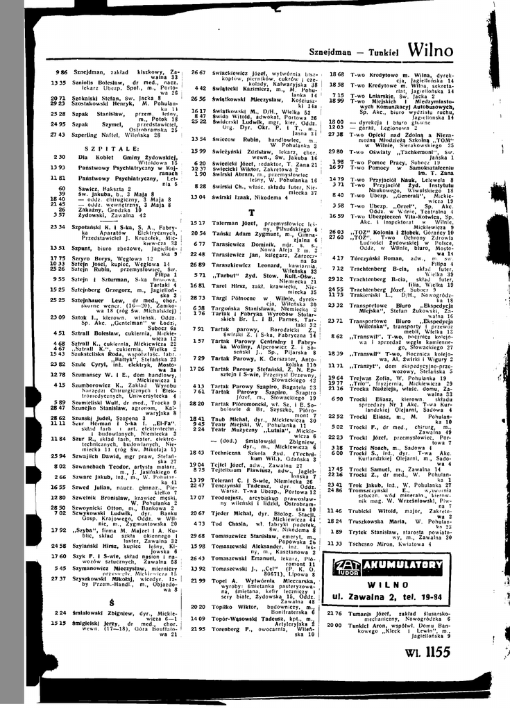 Sznejdman 9 86 13 3 5 20 7 1 29 23 25 28 2 4 95 27 43 Sznejdman, zakład kiszkowy, Za w a l n a SS Sznlolls B o l e s ł a w , dr m e d , nacz. lekarz Ubezp. S p o t , m . P o r t o wa 26 Szokalskl Stefan, Sw. Jacka 8 Szostakowskl H e n r y k , M . Pohulan ka 14 Szpak Stanisław, przem. leśny, m . Potok 18 Szpak Szymel, przedstawiciel. Ostrobramska 25 Szperling N a f t e l , W i l e ń s k a 28 S Z P I T A L E : 230 13 93 1181 60 39 18 40 2145 26 3 57 23 3 4 1351 17 75 10 33 25 26 9 55 15 25 25 25 23 09 451 468 467 15 43 23 8 2 1 2 78 415 5 89 28 47 28 62 1111 1184 25 9 4 8 02 266 16 55 12 80 28 50 702 17 9 2 2 4 58 17 60 5 45 2 7 37 2 24 1515 Dla Kobiet Omlny Ż y d o w s k i e j , W l t o l d o w a 15 P a ń s t w o w y Psychiatryczny w KoJranach P a ń s t w o w y Psychiatryczny, Let nia 6 Sawicz, Bakszta 2 Ś w . Jakuba, b , 3 Maja 8 — oddz. chirugiczny, 3 M a j a 8 — oddz. wewnętrzny, 3 Maja 8 Z a k a ź n y , Orodzka 10 ż y d o w s k i , Zawalna 42 Szpotanskl K. I S-ka, S. A . , F a b r y ka Aparatów Elektrycznych, Przedstawiciel J. Kruźołek, M i c kiewicza 33 Szpunt, biuro z b o ż o w e , Jagielloń ska 9 | Szryro B o r y s , W ę g l o w a 12 Sztolń Josel, kupiec, W ę g l o w a 14 Sztejn Rubin, przemysłowiec, Sw. Filipa 1 Sztejn 1 Szturman, S-ka firmowa, Tartaki 4 Sztcjnberg Grzegorz, m . J a g i e l l o ń ska 3 Sztejnhauer L e w , , dr m e d . , chor. skórne wener. ( 1 6 — 2 0 ) , Zamko wa 18 (róg Ś w . Michalskiej) Sztok I . , k i e r o w n . wlleńsk. Oddz. Sp. A k c . „ G e n t e l m a n " w L o d z i , Subocz 6a Sztrall B o l e s ł a w , cukiernia, Mickie wicza 12 Sztrall K., cukiernia, Mickiewicza 22 „Sztrall K.", cukiernia, Wielka 2 Szuksteliska Roda, współwłaśc. tabr. „ B a ł t y k " , Stefańska 23 Szulc C y r y l , inż. e l e k t r y k , Mostowa 3a Szumańscy W . i E „ dom h a n d l o w y , Mickiewicza 1 Szumborowicz K „ Zakład Wyrobu Narzędzi Chirurgicznych I Elek tromedycznych, Uniwersytecka 4 Szumicliski W u l f , dr m e d . Trocka 9 Szunejko Stanisław, agronom, Kal waryjska 8 Szunski Judei, Szopena 3 Szur Herman 1 S-ka f. „El-Fa". skład l a r b I a r t . elektrotechn. I budowlanych, Niemiecka 3 Szur R., skład l a r b , mater. elektro technicznych, budowlanych, Nie miecka 11 (róg Sw. Mikołaja 1) Szwajlich D a w i d , mgr p r a w , Stefań ska 27 Szwanebach T e o d o r , artysta malarz, -U- m . , J. Jasińskiego 6 Szwarc Jakub, I n ż , m , W . Pohulan ka 41 Szwed Julian, naucz, g l m n a z . Pie kiełko 7 Szwelnik Bronisław, krawiec męski, W . Pohulanka 2 Szwoynicki Otton, m . Bankowa 2 i SzwykowskI L u d w i k , dyr. Banku Gosp. K r a j o w e g o , Oddz. w W i l nie, m , Ż y g m u n t o w s k a 20 „ S z y b a " , firma M . Majzel I A . Kublic, skład szkła okiennego i luster, Zawalna 32 Szylańskl Hlrsz, kupiec leśny, K i jowska 6 Szyk F. I S-wle, skład nasion i na wozów sztucznych, Zawalna 68 Szymanowlcz Mieczysław, mierniczy przysięgły, Mickiewicza 15 Szyszkowski M i k o ł a j , wicedyr. I z by P r z e m . - H a n d l , m . Objazdo wa 8 śmiatowskl Z b i g n i e w , d y r . , Mickie wicza 6—1 śmigielski Jerzy, dr med, chor. wewn. (17—18), Góra Boufialowa 21 2667 4 42 26 5 6 1617 8 47 25 2 2 13 54 15 99 6 20 1 2 37 190 828 15 0 4 śwlackiewicz J ó z e f , wytwórnia bisz koptów, pierników, cukrów | cze kolady, Kalwaryjska 38 ś w l ą t e c k l Kazimierz, ra, M . P o h u lanka 14 Świątkowski Mieczysław, Kościusz ki l l a Świątkowski M , D / H , Wielka 63 ś w i d a W i t o l d , a d w o k a t . Portowa 26 Swiderski L u d w i k , mgr, k l e r . Oddz. O r g . D y r . O k r . P. i T , m., Jasna 34 świeco w Rubin, handlowiec, m, W . Pohulanka 3 świeźyński Z d z i s ł a w , lekarz, chor. w e w n . , Sw. Jakuba 16 Święcicki J ó z e f , redaktor, T . Zana 21 Święcicki W i k t o r , Zakretowa 2 śwlrski A b r a m , m , przemysłowiec leśny, W . Pohulanka 16 śwlrski C h . , wlaśc. składu f u t e r . Nie miecka 37 śwlrski Izaak, Nikodema 4 18 68 18 58 715 18 99 18 00 1 2 05 27 38 29 80 198 16 97 14 79 3 71 8 40 3 58 16 59 1517 Talerman Józef, 2054 T a ń s k i Adam przemysłowiec l e ś n y , Piłsudskiego 6 Z y g m u n t , m . Gimna zjalna 6 6 77 Tarasiewicz D o m i n i k , m j r . s. s. Nowa Aleja 3 m . 3 2 2 48 Tarasiewicz Jan, księgarz, Zarzecz na 5a 26 89 Taraszkiewicz Leonard, kawiarnia. Wileńska 33 5 7 1 „ T a r b u t " Ż y d . Stow. Kult.-Ośw., Niemiecka 21 16 8 1 T a r e l Hlrsz, z a k ł . k r a w i e c k i , Nie miecka 35 28 75 T a r g i Północne w Wilnie, dyrek cja, Wileńska 36 6 38 T a r g o ń s k a Stanisława, Niemiecka 2 1 7 6 T a r t a k i Fabryka W y r o b ó w Stolar skich B r . L. 1 B . Parnes, T a r taki 32 7 9 1 Tartak parowy, Borodzicki Z., śwlrski Z. 1 S-ka, Fabryczna 14 1 5 7 T a r t a k Parowy Centralny i F a b r y k a W o l i n y , Alperowicz Z. I Soseńskl J , Sp., Pijarska 8 7 29 T a r t a k P a r o w y , K. Gerszater, A n t o kolska 110 17 26 T a r t a k Parowy S t e f a ń s k i , Z. N . Ep sztejn 1 S-wle, Przemysł D r z e w n y , Słowackiego 42 4 1 3 T a r t a k P a r o w y Szapiro, Bagatela 23 - 7 6 1 Tartak Parowy Szapiro, Szapiro Józef, m . S ł o w a c k i e g o 19 28 20 T a r t a k Plóromonckl, wł. Sz. I E. So bolowie & B r . Szyszko, P i ó r o niont 7 18 4 1 T a u b Michał, d y r . , Mickiewicza 30 9 4 5 T e a t r M i e j s k i , W . Pohulanka 11 2 2 4 T e a t r Muzyczny „ L u t n i a " , M i c k i e wicza 6 — (dod.) śmiatowskl Zbigniew, d y r . , m , Mickiewicza 6 18 43 Techniczna Szkoła ż y d (Techni kum W1L), Gdańska 3 19 04 Tejtel J ó z e f , a d w , Zawalna 27 8 75 Tejtelbaum Flawiusz, a d w . Jagiel lońska 7 13 79 Telerant C. 1 S-wle, Niemiecka 26 22 47 Tenczyńskl Tadeusz, dyr. Oddz. Warsz. T - w a Ubezp., Portowa 12 17 07 Teodozjusz, arcybiskup p r a w o s ł a w ny wileński I l i d z k i , O s t r o b r a m ska 10 20 67 Tjeder Michał, d y r . B i o l o g . Stacji, Mickiewicza 44 4 73 T o d Chasla, wł. f a b r