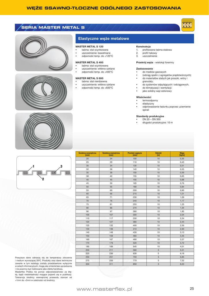 WĘŻE SSAWNO-TŁOCZNE OGÓLNEGO ZASTOSOWANIA SERIA MASTER METAL S Elastyczne węże metalowe MASTER METAL S 120 • taśma: stal ocynkowana • uszczelnienie: bawełniane • odporność temp. do +120OC Konstrukcja 1. profilowana taśma stalowa 2. profil hakowy 3. uszczelnienie MASTER METAL S 400 • taśma: stal ocynkowana • uszczelnienie: włókno szklane • odporność temp. do +400OC Przekrój węża - wielokąt foremny Zastosowanie • do mediów gazowych • (odciąg spalin z agregatów prądotwórczych); • do materiałów stałych jak proszki, wióry i granulaty; • do systemów odpylających i odciągowych, • do klimatyzacji i wentylacji; • jako solidny wąż osłonowy MASTER METAL S 600 • taśma: stal nierdzewna • uszczelnienie: włókno szklane • odporność temp. do +600OC Właściwości • termoodporny • elastyczny • odprowadzenie ładunku poprzez uziemienie spirali Standardy produkcyjne • DN 20 – DN 300 • długości produkcyjne: 10 m Powyższe dane odnoszą się do temperatury otoczenia i medium wynoszącej 200C. Produkty oraz dane techniczne zawarte w tym katalogu zostały przedstawione wyłącznie w celach informacyjnych, mogą ulec zmianie bez uprzedzenia i nie powinny być traktowane jako oferta handlowa. Masterflex Polska nie ponosi odpowiedzialności za błędy, bądź niedokładności mogące pojawić się w publikacji. Tolerancja średnicy wewnętrznej przewodu stanowi od +1mm do +3mm w zależności od średnicy. Fot. MASTERFLEX SE Średnica wewnętrzna [mm] Średnica zewnętrzna [mm] Promień zagięcia [mm] Odcinki [m] Waga [kg/m] 20 24 100 10 0,35 25 29 110 10 0,43 30 34 130 10 0,51 32 36 140 10 0,55 35 39 150 10 0,59 38 42 155 10 0,65 40 45 155 10 0,68 45 50 165 10 0,76 50 55 180 10 0,84 55 60 200 10 0,90 60 66 215 10 1,01 65 71 230 10 1,09 70 76 240 10 1,17 75 81 255 10 1,25 80 86 270 10 1,34 90 97 280 10 1,85 100 107 300 10 2,04 110 117 330 10 2,24 120 127 380 10 2,44 125 132 400 10 2,56 130 139 410 10 2,93 140 149 430 10 3,13 150 159 460 10 3,35 160 167 490 10 3,57 170 179 520 10 3,72 180 189 545 10 4,01 200 211 560 5 5,51 225 236 630 5 6,18 250 251 700 5 6,85 275 256 770 5 7,52 300 311 850 5 8,20 www.masterflex.pl 25