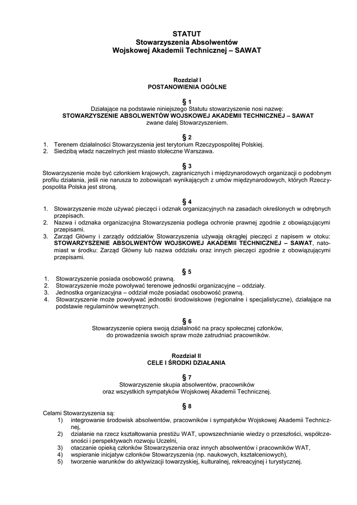 STATUT Stowarzyszenia Absolwentów Wojskowej Akademii Technicznej – SAWAT Rozdział I POSTANOWIENIA OGÓLNE §1 Działające na podstawie niniejszego Statutu stowarzyszenie nosi nazwę: STOWARZYSZENIE ABSOLWENTÓW WOJSKOWEJ AKADEMII TECHNICZNEJ – SAWAT zwane dalej Stowarzyszeniem. §2 1. Terenem działalności Stowarzyszenia jest terytorium Rzeczypospolitej Polskiej. 2. Siedzibą władz naczelnych jest miasto stołeczne Warszawa. §3 Stowarzyszenie może być członkiem krajowych, zagranicznych i międzynarodowych organizacji o podobnym profilu działania, jeśli nie narusza to zobowiązań wynikających z umów międzynarodowych, których Rzeczypospolita Polska jest stroną. §4 1. Stowarzyszenie może używać pieczęci i odznak organizacyjnych na zasadach określonych w odrębnych przepisach. 2. Nazwa i odznaka organizacyjna Stowarzyszenia podlega ochronie prawnej zgodnie z obowiązującymi przepisami. 3. Zarząd Główny i zarządy oddziałów Stowarzyszenia używają okrągłej pieczęci z napisem w otoku: STOWARZYSZENIE ABSOLWENTÓW WOJSKOWEJ AKADEMII TECHNICZNEJ – SAWAT, natomiast w środku: Zarząd Główny lub nazwa oddziału oraz innych pieczęci zgodnie z obowiązującymi przepisami. 1. 2. 3. 4. §5 Stowarzyszenie posiada osobowość prawną. Stowarzyszenie może powoływać terenowe jednostki organizacyjne – oddziały. Jednostka organizacyjna – oddział może posiadać osobowość prawną. Stowarzyszenie może powoływać jednostki środowiskowe (regionalne i specjalistyczne), działające na podstawie regulaminów wewnętrznych. §6 Stowarzyszenie opiera swoją działalność na pracy społecznej członków, do prowadzenia swoich spraw może zatrudniać pracowników. Rozdział II CELE I ŚRODKI DZIAŁANIA §7 Stowarzyszenie skupia absolwentów, pracowników oraz wszystkich sympatyków Wojskowej Akademii Technicznej. §8 Celami Stowarzyszenia są: 1) integrowanie środowisk absolwentów, pracowników i sympatyków Wojskowej Akademii Technicznej, 2) działanie na rzecz kształtowania prestiżu WAT, upowszechnianie wiedzy o przeszłości, współczesności i perspektywach rozwoju Uczelni, 3) otaczanie opieką członków Stowarzyszenia oraz innych absolwentów i pracowników WAT, 4) wspieranie inicjatyw członków Stowarzyszenia (np. naukowych, kształceniowych), 5) tworzenie warunków do aktywizacji towarzyskiej, kulturalnej, rekreacyjnej i turystycznej. §9 Stowarzyszenie realizuje swoje cele w szczególności przez: 1) umożliwianie absolwentom oraz pracownikom WAT zrzeszania się w jednostkach organizacyjnych Stowarzyszenia i korzystania z wszelkich form jego działalności, 2) inicjowanie, prowadzenie i popieranie działalności opiniotwórczej, naukowej i popularyzatorskiej, wynikającej z celów Stowarzyszenia, 3) prowadzenie szkół i szkolenia, 4) organizowanie uroczystości i obchodów rocznic związanych z działalnością WAT, 5) organizowanie i prowadzenie działalności wydawniczej, 6) dokumentowanie oraz popularyzowanie działalności wybitnych postaci związanych z WAT oraz dziejów i osiągnięć Uczelni, 7) nawiązywanie i utrzymywanie kontaktów i współpracy z organizacjami krajowymi, zagranicznymi i międzynarodowymi kultywującymi tradycje wojskowe nie będące w sprzeczności z polityką RP w tym zakresie, 8) prowadzenie działalności, w różnych formach organizacyjnych, umożliwiającej pozyskanie środków na realizację celów i zadań Stowarzyszenia, 9) rozwijanie różnorodnych form godziwego wypoczynku, rekreacji i turystyki. Rozdział III CZŁONKOWIE, ICH PRAWA I OBOWIĄZKI § 10 Członkowie Stowarzyszenia Absolwentów WAT dzielą się na: 1) członków zwyczajnych, 2) członków nadzwyczajnych, 3) członków sympatyków, 4) członków wspierających, 5) członków honorowych. § 11 Członkowie Stowarzyszenia zrzeszają się w oddziałach. § 12 Członkiem zwyczajnym może być każda osoba fizyczna, która spełnia łącznie następujące warunki: 1) jest obywatelem polskim lub cudzoziemcem, posiadającym pełną zdolność do czynności prawnych i nie pozbawionym praw publicznych, 2) jest absolwentem Wojskowej Akademii Technicznej tzn. uzyskała dyplom ukończenia studiów: wyższych, podyplomowych, doktoranckich bez względu na system studiowania, 3) nie została uprzednio wykluczona z szeregów Stowarzyszenia, 4) złożyła pisemną deklarację i została przyjęta w poczet członków przez zarząd oddziału, § 13 1. Członek zwyczajny ma prawo: 1) wybierać i być wybieranym do władz Stowarzyszenia, 2) zgłaszać wnioski dotyczące działalności Stowarzyszenia, 3) brać udział w działalności oraz korzystać z pomocy, obiektów i urządzeń Stowarzyszenia na zasadach określonych przez władze Stowarzyszenia, 4) nosić odznakę organizacyjną. 2. Członek zwyczajny jest obowiązany: 1) przestrzegać postanowień Statutu, regulaminów i uchwał władz Stowarzyszenia, 2) uczestniczyć w działalności Stowarzyszenia, 3) reprezentować godnie imię absolwenta WAT, § 14 Członkiem nadzwyczajnym może być każda osoba fizyczna, która spełnia łącznie następujące warunki: 1) jest obywatelem polskim lub cudzoziemcem, posiadającym pełną zdolność do czynności prawnych i nie pozbawionym praw publicznych, 2) jest, bądź była, przez co najmniej 5 (pięć) lat pracownikiem WAT, 3) nie została uprzednio wykluczona z szeregów Stowarzyszenia, 4) złożyła pisemną deklarację i została przyjęta w poczet członków przez zarząd oddziału, 5) wniosła opłatę wpisową i pierwszą składkę członkowską na konto Stowarzyszenia. 2 § 15 1. Członek nadzwyczajny ma prawo: 1) być wybieranym do władz Stowarzyszenia, 2) zgłaszać wnioski dotyczące działalności Stowarzyszenia, 3) brać udział w działalności oraz korzystać z pomocy, obiektów i urządzeń na zasadach określonych przez władze Stowarzyszenia, 4) nosić odznakę organizacyjną. 2. Członek nadzwyczajny jest obowiązany: 1) przestrzegać postanowień Stat
