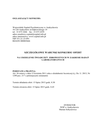 OGŁASZAJĄCY KONKURS: Wojewódzki Szpital Psychiatryczny w Andrychowie 34-120 Andrychów ul.Dąbrowskiego 19 tel: 33 875 2446 fax : 33 875 4559 adres emailowy:[email protected] adres internetowy: www:szpital.info.pl NIP 551-21-23-091 REGON 000805666 SZCZEGÓŁOWE WARUNKI KONKURSU OFERT NA UDZIELENIE ŚWIADCZEŃ ZDROWOTNYCH W ZAKRESIE BADAŃ LABORATORYJNYCH PODSTAWA PRAWNA: Art. 26 ustawy z dnia 15 kwietnia 2011 roku o działalności leczniczej (t.j. Dz. U. 2013, Nr 1290 poz. 217 z późniejszymi zmianami) Termin składania ofert: 15 lipiec 2015 godz. 8.30 Termin otwarcia ofert: 15 lipiec 2015 godz. 8.45 DYREKTOR WSP w Andrychowie Marian Sołtysiewicz -1I. Postanowienia ogólne: 1. Postępowanie niniejsze prowadzone jest na zasadach przewidzianych przez przepisy art. 26-27 ustawy o działalności leczniczej z dnia 15 kwietnia 2011 r.(Dz. U.2013 Nr 1290, poz. 217 z późniejszymi zmianami) 2. Świadczenia medyczne obejmują wykonywanie świadczeń zdrowotnych w zakresie badań laboratoryjnych zabezpieczających funkcje i zadania Wojewódzkiego Szpitala Psychiatrycznego w Andrychowie 3. Wszelkie pytania dotyczące Konkursu Ofert należy kierować na adres Zamawiającego: Wojewódzki Szpital Psychiatryczny w Andrychowie ul.Dąbrowskiego 19 tel: 33 875 2446 fax : 33 875 4559 4. Osoby uprawnione do kontaktowania się z oferentami i udzielania wyjaśnień dotyczących spraw merytorycznych są: mgr Bożena Bańkowska - Pracownia Diagnostyki Laboratoryjnej, tel. 33 875 2446 w.210 mgr Beata Rys tel 33 875 2446 w. 207 Przełożona Pielęgniarek 5. Oferent winien zapoznać się ze wszystkimi informacjami zawartymi w Szczegółowych Warunkach Konkursu Ofert w celu prawidłowego przygotowania i złożenia oferty 6. Oferent ponosi wszelkie koszty związane z przygotowaniem oferty. 7.Zapytania do Szczegółowych warunków konkursu ofert można składać nie póżniej niż 2 dni przed terminem wyznaczonym na składanie ofert. II. Określenie przedmiotu postępowania: 1. Wykonywanie badań laboratoryjnych dla Wojewódzkiego Szpitala Psychiatrycznego w Andrychowie 2. Na podstawie zawartej umowy wybrany Oferent będzie zobowiązany do świadczenia usług w zakresie wykonywania badań laboratoryjnych zgodnie z wymaganymi warunkami i w zakresie wskazanym w Załączniku Nr 1. Liczba planowanych do zrealizowania badań może się zmieniać w zależności od zapotrzebowania. Badania będą rozliczane według liczby udzielonych swiadczeń zdrowotnych. 3. Zleceniobiorca zobowiązuje się dostarczyć wraz z umową wykaz i cennik pozostałych badań,które posiada w swojej ofercie a z których Zleceniodawca będzie mógł skorzystać w pojedynczych przypadkach w razie takiej potrzeby 4. . Materiał do badań będzie dostarczał oraz odbierał wyniki Udzielający Zamówienie, jeżeli badania będą wykonywanem w odległosci do 15 km . Jeżeli laboratorium diagnostyczne, w którym badania będą wykonywane będzie mieć siedzibę w odległości powyżej 15 km Przyjmujący zamówienie zobowiązany będzie odbierać materiał do badań oraz doręczać wynik badania na własny koszt. 5. Oferent zapewni dostępność do badań laboratoryjnych przez 24 godz. 7 dni w tygodniu. 6. Badania laboratoryjne mogą być zlecane w trybie Cito lub standardowym. O trybie wykonania badania każdorazowo decyduje lekarz zlecający badania, tryb Cito będzie oznaczony na skierowaniu. -27. Termin realizacji zamówienia: od dnia podpisania umowy do dnia 31 lipca 2018 r III. Opis sposobu przygotowania oferty. 1. Oferta powinna spełniać warunki określone w niniejszych Szczegółowych Warunkach . Konkursu Ofert. 2. Ofertę należy przygotować na Formularzu Ofertowym stanowiącym Załącznik Nr 1. Ofertę wraz ze wszystkimi załącznikami należy złożyć w zaklejonej kopercie oznaczanej napisem: „Oferta na świadczenia w zakresie badań laboratoryjnych. Nie otwierać do 15 lipca 2015r. do godz. 8.45 3. Oferta powinna zawierać wypełnione następujące dokumenty: a) Formularz Oferty - Załącznik Nr 1 b) Oświadczenie Oferenta - Załącznik Nr 2, c) Zaakceptowany Projekt Umowy – Załącznik Nr 3 4. Oferta oraz wszystkie wymagane dokumenty muszą być podpisane i potwierdzone za zgodność z oryginałem przez osobę prawnie umocowaną do zaciągania zobowiązań, w przypadku osób prawnych winno to wynikać z dokumentu potwierdzającego wpis Oferenta do Krajowego Rejestru Sądowego lub pełnomocnictwa 5. Wszelkie zmiany lub poprawki w tekście oferty muszą być parafowane własnoręcznie przez Oferenta. 6. Ponadto do oferty należy załączyć: a) Zaświadczenie o prowadzeniu działalności gospodarczej lub odpisu KRS. b) Wpis Oferenta do rejestru podmiotów leczniczych. c) Aktualny wypis z rejestru zakładów opieki zdrowotnej. d) Oświadczenie o wpisie laboratorium do ewidencji prowadzonej przez Krajową Izbę Diagnostów Laboratoryjnych z podaniem numeru wpisu e) Polisa ubezpieczeniowa od odpowiedzialności cywilnej w zakresie wykonywanych świadczeń. f) Certyfikaty potwierdzające jakość wykonywanych usług: - certyfikaty kontroli jakości badań laboratoryjnych krajowe , międzynarodowe, - certyfikaty systemów zarządzania jakością jeśli takie posiada g) Procedury i zasady przygotowania pacjenta do badań, pobierania materiału do badań oraz transportu materiału do badań. h) Wzór druku zlecenia na badania laboratoryjne IV. Wymagania wstępne dla świadczeń zdrowotnych z zakresu badań laboratoryjnych: 1. Zakres badań specjalistycznych przewidzianych warunkami konkursu to badania laboratoryjne opisane w Załączniku Nr 1 2. Dostarczenie wraz z umową wykazu i cennika pozostałych badań,które Oferent posiada w swojej ofercie a z których Zleceniodawca będzie mógł skorzystać w pojedynczych przypadkach w razie takiej potrzeby 3. Badania muszą być wykonywane przez 24 godziny na dobę 7 dni w tygodniu 4. Oferent musi zagwarantować czas oczekiwania na wynik badania w zakresie: - badań w trybie standardowym zgodni