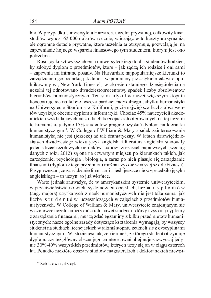 Adam POTKAY 184 bie. W przypadku Uniwersytetu Harvarda, uczelni prywatnej, całkowity koszt studiów wynosi 62 000 dolarów rocznie, wliczając w to koszty utrzymania, ale ogromne dotacje prywatne, które uczelnia ta otrzymuje, pozwalają jej na zapewnianie hojnego wsparcia finansowego tym studentom, którym jest ono potrzebne. Rosnący koszt wykształcenia uniwersyteckiego to dla studentów bodziec, by zdobyć dyplom z przedmiotów, które – jak sądzą ich rodzice i oni sami – zapewnią im intratne posady. Na Harvardzie najpopularniejsze kierunki to zarządzanie i gospodarka; jak donosi wspomniany już artykuł niedawno opublikowany w „New York Timesie”, w okresie ostatniego dziesięciolecia na uczelni tej odnotowano dwudziestoprocentowy spadek liczby absolwentów kierunków humanistycznych. Ten sam artykuł w nawet większym stopniu koncentruje się na fakcie jeszcze bardziej radykalnego schyłku humanistyki na Uniwersytecie Stanforda w Kalifornii, gdzie największa liczba absolwentów uzyskuje obecnie dyplom z informatyki. Chociaż 45% nauczycieli akademickich wykładających na studiach licencjackich oferowanych na tej uczelni to humaniści, jedynie 15% studentów pragnie uzyskać dyplom na kierunku humanistycznym11. W College of William & Mary spadek zainteresowania humanistyką nie jest (jeszcze) aż tak dramatyczny. W latach dziewięćdziesiątych dwudziestego wieku język angielski i literatura angielska stanowiły jeden z trzech czołowych kierunków studiów; w czasach najnowszych (według danych z roku 2012) są one na czwartym miejscu po kierunkach takich, jak zarządzanie, psychologia i biologia, a zaraz po nich plasuje się zarządzanie finansami (dyplom z tego przedmiotu można uzyskać w naszej szkole biznesu). Przypuszczam, że zarządzanie finansami – jeśli jeszcze nie wyprzedziło języka angielskiego – to uczyni to już wkrótce. Warto jednak zauważyć, że w amerykańskim systemie uniwersyteckim, w przeciwieństwie do wielu systemów europejskich, liczba d y p l o m ó w (ang. majors) uzyskanych z nauk humanistycznych nie jest taka sama, jak liczba s t u d e n t ó w uczestniczących w zajęciach z przedmiotów humanistycznych. W College of William & Mary, uniwersytecie znajdującym się w czołówce uczelni amerykańskich, nawet studenci, którzy uzyskują dyplomy z zarządzania finansami, muszą zdać egzaminy z kilku przedmiotów humanistycznych: nasze ogólne zasady dotyczące kształcenia wymagają, by wszyscy studenci na studiach licencjackich w jakimś stopniu zetknęli się z dyscyplinami humanistycznymi. W istocie jest tak, że kierunek, z którego student otrzymuje dyplom, czy też główny obszar jego zainteresowań obejmuje zazwyczaj jedynie 30%-40% wszystkich przedmiotów, których uczy się on w ciągu czterech lat. Ponadto niektóre obszary studiów magisterskich i doktoranckich niewpi11 Zob. L e w i n, dz. cyt. Humanistyka na uniwersytecie amerykańskim 185 sujące się w pole nauk humanistycznych wykazują jednak zdrowy respekt dla humanistyki i tak na przykład szkoły medyczne w Stanach Zjednoczonych wymagają, by kandydaci do nich odbyli kilka kursów z zakresu literatury, w nadziei, że w ten sposób nauczą się oni komunikować i słuchać oraz z wyobraźnią i współczuciem uczestniczyć w życiu innych ludzi. Co w takim razie z magisterskimi i doktoranckimi studiami z zakresu humanistyki? Przy obecnym rynku pracy, niekorzystnym dla nowych absolwentów, studia doktoranckie mogą wydawać się atrakcyjną opcją dla najlepszych studentów kierunków humanistycznych i pod pewnymi względami tak właśnie jest: student rozpoczynający studia doktoranckie w Stanach Zjednoczonych może oczekiwać, że pokryte zostanie jego czesne oraz że będzie otrzymywać od dwudziestu do dwudziestu pięciu tysięcy dolarów rocznego stypendium przez okres pięciu bądź sześciu lat. Swoim najbardziej zaangażowanym studentom mówię, że zanurzenie się w wielkiej sztuce i w dorobku myślicieli z przeszłości to wspaniały sposób na przeżycie młodości między dwudziestym a trzydziestym rokiem życia, jeśli zaś okaże się, że nie będą w stanie znaleźć pracy wykładowcy uniwersyteckiego, to istnieją również inne możliwości w szkolnictwie średnim czy w pracy wydawniczej, aktywność polityczna i tak dalej. Przyjęcia na studia doktoranckie podlegają coraz gruntowniejszej selekcji, a pełnoetatowe stanowiska z możliwością stałego zatrudnienia dla doktorantów są coraz częściej nieliczne. W okresie minionych dwudziestu pięciu lat programy studiów doktoranckich z zakresu nauk humanistycznych uległy drastycznemu skurczeniu. Jeśli chodzi o filologię angielską, to w ramach dużego programu, jaki oferowany jest na przykład na University of Virginia, w latach osiemdziesiątych ubiegłego stulecia przyjmowano siedemdziesięciu pięciu kandydatów rocznie, a obecnie jest to jedynie dwunastu studentów. Z różnych powodów w systemie uniwersyteckim niewiele jest miejsc pracy dla nowo wypromowanych doktorów. Dzieje się tak po pierwsze dlatego, że uniwersytety (w szczególności duże uniwersytety stanowe) ograniczają koszty operacyjne, zatrudniając na część etatu personel pomocniczy, przede wszystkim magistrów, nie zaś doktorów, którzy byliby uprawnieni do starania się o stałe zatrudnienie na pełnoetatowym stanowisku12. Drugi czynnik to tendencja utrzymująca się wśród profesorów zatrudnionych na stałym etacie, którzy nie mają wyznaczonego obowiązkowego wieku emerytalnego, by pracować po przekroczeniu siedemdziesiątego, a nawet osiemdziesiątego roku życia. Powiedziałbym, że tendencja ta jest niewskazana z punktu widzenia polityki państwa, a być może należy ją nawet uznać za niemoralną (jakkolwiek stwierdzenie, że pracownicy naukowi powinni przechodzić na emeryturę, jest na publicznym uniwersytecie 12 Por. M. B é r u b é, Abandon All Hope, „Pedagogy: Critical Approaches to Teaching L