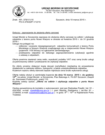 URZĄD MORSKI W SZCZECINIE 70-207 Szczecin, Plac Batorego 4 tel.: +48 91 424-16-54, 31-28-346, Znak: KPt -379/1/1/15 PO-II-379/ZZP-1/12/15 tel. / fax: 31-28-405 , e-mail: [email protected] Szczecin, dnia 10 marca 2015 r. Dotyczy: zaproszenie do złożenia oferty cenowej Urząd Morski w Szczecinie zaprasza do złożenia oferty cenowej na odbiór i utylizację odpadów z terenu portu Nowe Warpno w okresie od kwietnia 2015 r. do 31 grudnia 2016 r. Usługa ma polegać na: odbiorze i wywozie niesegregowanych odpadów komunalnych z terenu Portu Morskiego w Nowym Warpnie znajdującego się w miejscowości Nowe Warpno (pojemnik 1100 litrowy) na zgłoszenie zamawiającego; przekazaniu odpadów do dalszego zagospodarowania (utylizacji) zgodnie z ustawą o odpadach; Oferta powinna zawierać cenę netto, wysokość podatku VAT oraz cenę brutto usługi za jednorazowy odbiór i przekazanie do utylizacji odpadów. Do oferty prosimy dołączyć kopię decyzji (certyfikatu) niezbędną do prowadzenia działalności w zakresie odbioru, transportu, a także unieszkodliwiania odpadów. Kryterium wyboru oferty stanowić będzie najniższa cena brutto wykonania usługi. Ofertę należy złożyć w zamkniętej kopercie do dnia 16 marca 2015 r. do godziny 1200 na adres: Urząd Morski w Szczecinie, Plac Batorego 4, 70-207 Szczecin, Zespół ds. Zamówień Publicznych, pokój 110. Kopertę należy opisać „Oferta na odbiór i utylizację odpadów z portu Nowe Warpno”. Osobą upoważnioną do kontaktu z wykonawcami jest pan Radosław Pawlik ( tel. 91 – 4241654, e-mail: [email protected] ) i pani Mariola Ziarkiewicz ( tel./fax 91 – 3128405; e-mail: [email protected] ) w godz. 800 – 1500 w Kapitanacie Portu Trzebież.