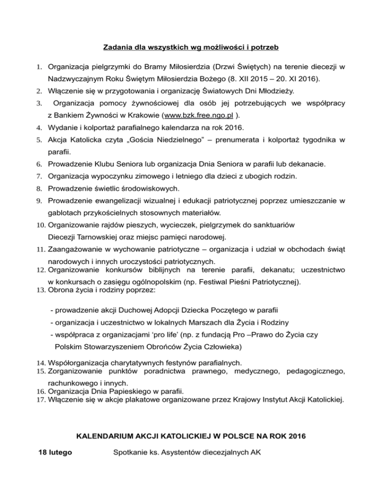 Zadania dla wszystkich wg możliwości i potrzeb 1. Organizacja pielgrzymki do Bramy Miłosierdzia (Drzwi Świętych) na terenie diecezji w Nadzwyczajnym Roku Świętym Miłosierdzia Bożego (8. XII 2015 – 20. XI 2016). 2. Włączenie się w przygotowania i organizację Światowych Dni Młodzieży. 3. Organizacja pomocy żywnościowej dla osób jej potrzebujących we współpracy z Bankiem Żywności w Krakowie (www.bzk.free.ngo.pl ). 4. Wydanie i kolportaż parafialnego kalendarza na rok 2016. 5. Akcja Katolicka czyta „Gościa Niedzielnego” – prenumerata i kolportaż tygodnika w parafii. 6. Prowadzenie Klubu Seniora lub organizacja Dnia Seniora w parafii lub dekanacie. 7. Organizacja wypoczynku zimowego i letniego dla dzieci z ubogich rodzin. 8. Prowadzenie świetlic środowiskowych. 9. Prowadzenie ewangelizacji wizualnej i edukacji patriotycznej poprzez umieszczanie w gablotach przykościelnych stosownych materiałów. 10. Organizowanie rajdów pieszych, wycieczek, pielgrzymek do sanktuariów Diecezji Tarnowskiej oraz miejsc pamięci narodowej. 11. Zaangażowanie w wychowanie patriotyczne – organizacja i udział w obchodach świąt narodowych i innych uroczystości patriotycznych. 12. Organizowanie konkursów biblijnych na terenie parafii, dekanatu; uczestnictwo w konkursach o zasięgu ogólnopolskim (np. Festiwal Pieśni Patriotycznej). 13. Obrona życia i rodziny poprzez: - prowadzenie akcji Duchowej Adopcji Dziecka Poczętego w parafii - organizacja i uczestnictwo w lokalnych Marszach dla Życia i Rodziny - współpraca z organizacjami ‘pro life’ (np. z fundacją Pro –Prawo do Życia czy Polskim Stowarzyszeniem Obrońców Życia Człowieka) 14. Współorganizacja charytatywnych festynów parafialnych. 15. Zorganizowanie punktów poradnictwa prawnego, medycznego, pedagogicznego, rachunkowego i innych. 16. Organizacja Dnia Papieskiego w parafii. 17. Włączenie się w akcje plakatowe organizowane przez Krajowy Instytut Akcji Katolickiej. KALENDARIUM AKCJI KATOLICKIEJ W POLSCE NA ROK 2016 18 lutego Spotkanie ks. Asystentów diecezjalnych AK 8-10 kwietnia 14-16 kwietnia 18 czerwca 20-31 lipca 13-14 września 9 października listopad 4-6 listopada 20 listopada 26 listopada Posiedzenie Rady KIAK – Warszawa Główne uroczystości 1050 rocznicy chrztu Polski (Gniezno, Poznań) Ogólnopolska pielgrzymka Akcji Katolickiej na Jasną Górę Światowe Dni Młodzieży Sztafeta im. Ks. Jerzego Popiełuszki ku czci męczenników stanu wojennego Dzień Papieski VII Ogólnopolski Festiwal Pieśni Patriotycznej - Kraków Rekolekcje i posiedzenie Rady KIAK - Warszawa Uroczystość Chrystusa Króla – Święto Akcji Katolickiej Konferencja związana z 1050 rocznicą Chrztu Polski - Warszawa