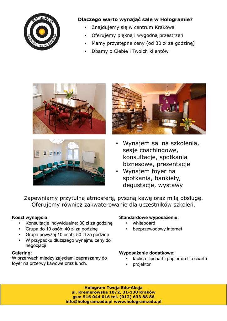Dlaczego warto wynająć sale w Hologramie? • Znajdujemy się w centrum Krakowa • Oferujemy piękną i wygodną przestrzeń • Mamy przystępne ceny (od 30 zł za godzinę) • Dbamy o Ciebie i Twoich klientów • Wynajem sal na szkolenia, sesje coachingowe, konsultacje, spotkania biznesowe, prezentacje • Wynajem foyer na spotkania, bankiety, degustacje, wystawy Zapewniamy przytulną atmosferę, pyszną kawę oraz miłą obsługę. Oferujemy również zakwaterowanie dla uczestników szkoleń. Koszt wynajęcia: • Konsultacje indywidualne: 30 zł za godzinę • Grupa do 10 osób: 40 zł za godzinę • Grupa powyżej 10 osób: 50 zł za godzinę • W przypadku dłuższego wynajmu ceny do negocjacji Standardowe wyposażenie: • whiteboard • bezprzewodowy internet Catering: W przerwach między zajęciami zapraszamy do foyer na przerwy kawowe oraz lunch. Wyposażenie dodatkowe: • tablica flipchart i papier do flip chartu • projektor Hologram Twoja Edu-Akcja ul. Kremerowska 10/2, 31-130 Kraków gsm 516 044 016 tel. (012) 633 88 86 [email protected] www.hologram.edu.pl Dlaczego warto wynająć sale w Hologramie? • Znajdujemy się w centrum Krakowa • Oferujemy piękną i wygodną przestrzeń • Mamy przystępne ceny (od 30 zł za godzinę) • Dbamy o Ciebie i Twoich klientów Sale: Sala Inspiracji – max. 12 osób Sala Inwencji – max. 17 osób Sala Kameralna – max. 3 osoby Holotecca: pyszna kawa, inspirujące książki, darmowy internet Hologram Twoja Edu-Akcja ul. Kremerowska 10/2, 31-130 Kraków gsm 516 044 016 tel. (012) 633 88 86 [email protected] www.hologram.edu.pl