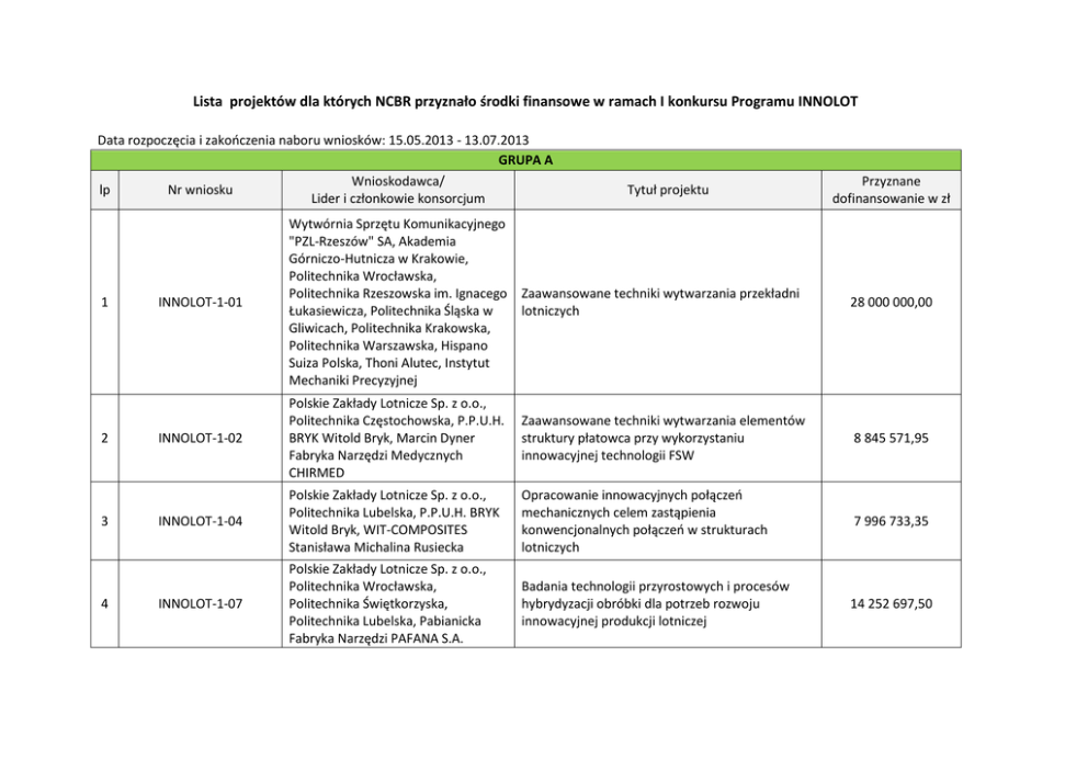 Lista projektów dla których NCBR przyznało środki finansowe w ramach I konkursu Programu INNOLOT Data rozpoczęcia i zakończenia naboru wniosków: 15.05.2013 - 13.07.2013 GRUPA A Wnioskodawca/ lp Nr wniosku Lider i członkowie konsorcjum 1 2 3 4 Tytuł projektu Przyznane dofinansowanie w zł INNOLOT-1-01 Wytwórnia Sprzętu Komunikacyjnego "PZL-Rzeszów" SA, Akademia Górniczo-Hutnicza w Krakowie, Politechnika Wrocławska, Politechnika Rzeszowska im. Ignacego Łukasiewicza, Politechnika Śląska w Gliwicach, Politechnika Krakowska, Politechnika Warszawska, Hispano Suiza Polska, Thoni Alutec, Instytut Mechaniki Precyzyjnej Zaawansowane techniki wytwarzania przekładni lotniczych 28 000 000,00 INNOLOT-1-02 Polskie Zakłady Lotnicze Sp. z o.o., Politechnika Częstochowska, P.P.U.H. BRYK Witold Bryk, Marcin Dyner Fabryka Narzędzi Medycznych CHIRMED Zaawansowane techniki wytwarzania elementów struktury płatowca przy wykorzystaniu innowacyjnej technologii FSW 8 845 571,95 INNOLOT-1-04 Polskie Zakłady Lotnicze Sp. z o.o., Politechnika Lubelska, P.P.U.H. BRYK Witold Bryk, WIT-COMPOSITES Stanisława Michalina Rusiecka Opracowanie innowacyjnych połączeń mechanicznych celem zastąpienia konwencjonalnych połączeń w strukturach lotniczych 7 996 733,35 INNOLOT-1-07 Polskie Zakłady Lotnicze Sp. z o.o., Politechnika Wrocławska, Politechnika Świętkorzyska, Politechnika Lubelska, Pabianicka Fabryka Narzędzi PAFANA S.A. Badania technologii przyrostowych i procesów hybrydyzacji obróbki dla potrzeb rozwoju innowacyjnej produkcji lotniczej 14 252 697,50 5 INNOLOT-1-08 6 INNOLOT-1-09 7 INNOLOT-1-10 Wytwórnia Sprzętu Komunikacyjnego "PZL-Rzeszów" SA, Politechnika Warszawska, Politechnika Rzeszowska im. Ignacego Łukasiewicza, Instytut Energetyki, INFOSTER Sp. z o.o., POLWAX SA, Politechnika Śląska Wytwórnia Sprzętu Komunikacyjnego "PZL-Rzeszów" SA, Akademia Górniczo-Hutnicza w Krakowie, Politechnika Rzeszowska im. Ignacego Łukasiewicza, Instytut Spawalnictwa, Zachodniopomorski Uniwersytet Technologiczny w Szczecinie, Politechnika Opolska, Politechnika Krakowska, Politechnika Warszawska, P.P.U.H. BRYK Witold Bryk, Przedsiębiorstwo ProjektowoWdrożeniowe KOLTECH Sp. z o.o., IPL SOLUTIONS Sp. z o.o., IBS Poland Sp. z o.o. Wytwórnia Sprzętu Komunikacyjnego "PZL-Rzeszów" SA, Akademia Górniczo-Hutnicza w Krakowie, Instytut Lotnictwa, Instytut Podstawowych Problemów Techniki, Politechnika Rzeszowska im. Ignacego Łukasiewicza, Politechnika Opolska, Politechnika Krakowska, Politechnika Lubelska, Ultratech Sp. z o.o., Waldrex Sp. z o.o. Zaawansowane technologie odlewnicze 11 500 000,00 Zaawansowane techniki wytwarzania kadłuba silników lotniczych 15 300 000,00 Zaawansowane techniki wytwarzania zespołu turbiny napędowej 23 000 000,00 8 INNOLOT-1-11 9 INNOLOT-1-15 10 INNOLOT-1-17 Avio Polska Sp. z o.o., Politechnika Śląska, Politechnika Warszawska, Instytut Maszyn Przepływowych im. Roberta Szewalskiego PAN, "Laboratorium Badań Napędów Lotniczych", "Polonia Aero" Sp. z o.o." Wytwórnia Sprzętu Komunikacyjnego „PZL-Świdnik” Spółka Akcyjna, Instytut Lotnictwa Wytwórnia Sprzętu Komunikacyjnego "PZL-Kalisz" SA, Politechnika Lubelska, Instytut Energetyki Zaawansowany zespół turbiny niskiego ciśnienia o podwyższonej sprawności 26 250 000,00 Adaptacyjne podwozie nowego wiropłatu 14 027 998,78 Urządzenie zasilające i kontrolujące aparaturę pokładową i naziemną 15 000 000,00 GRUPA B lp Nr wniosku 1 INNOLOT-1-12 2 INNOLOT-1-13 Wnioskodawca/ Lider i członkowie konsorcjum P.P.U.H. BRYK Witold Bryk, Politechnika Rzeszowska im. Ignacego Łukasiewicza, Wytwórnia Sprzętu Komunikacyjnego "PZL-Rzeszów" SA, Ultratech Sp. z o.o. Eurotech Sp. z o.o., Waldrex Sp. z o.o., Instytut Energetyki, Politechnika Rzeszowska im. Ignacego Łukasiewicza Tytuł projektu Przyznane dofinansowanie Technologie wytwarzania narzędzi do obróbki skrawaniem wyrobów o złożonej geometrii z trudnoobrabialnych materiałów 2 420 000,00 zł Technologie hybrydowego zespołu napędowego lekkich lub bezzałogowych statków powietrznych 7 440 000,00 zł