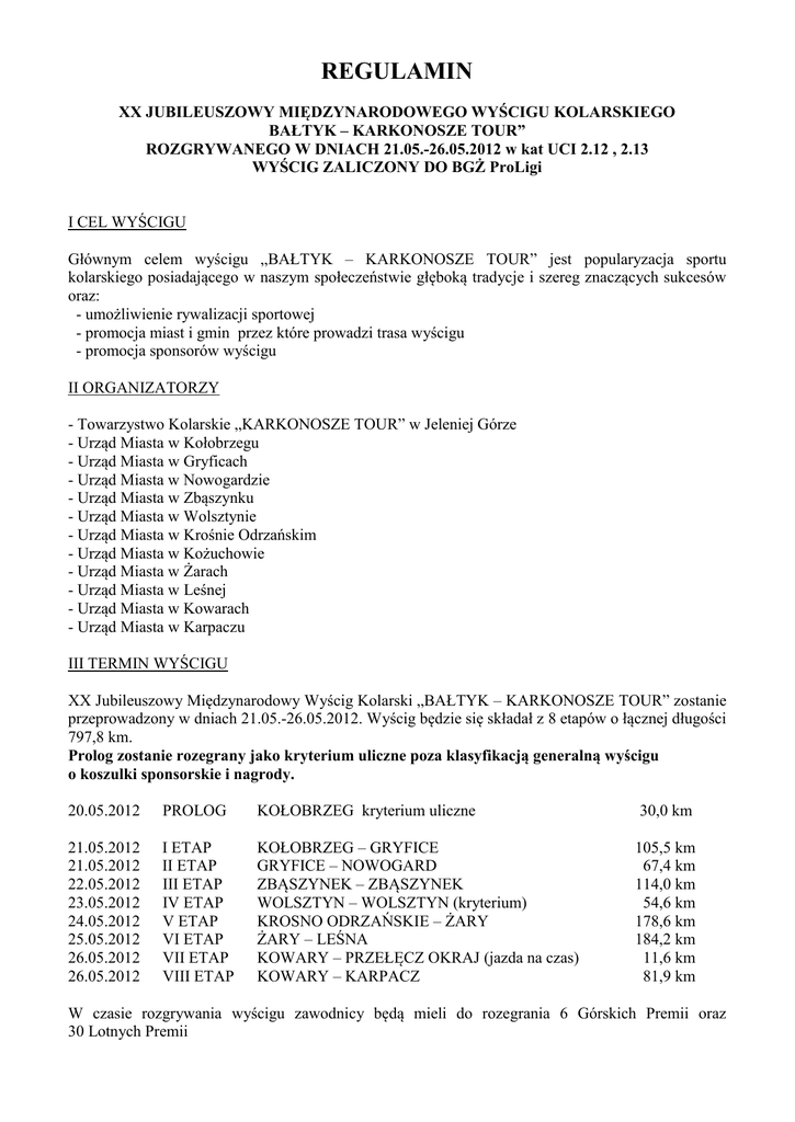 REGULAMIN XX JUBILEUSZOWY MIĘDZYNARODOWEGO WYŚCIGU KOLARSKIEGO BAŁTYK – KARKONOSZE TOUR” ROZGRYWANEGO W DNIACH 21.05.-26.05.2012 w kat UCI 2.12 , 2.13 WYŚCIG ZALICZONY DO BGŻ ProLigi I CEL WYŚCIGU Głównym celem wyścigu „BAŁTYK – KARKONOSZE TOUR” jest popularyzacja sportu kolarskiego posiadającego w naszym społeczeństwie głęboką tradycje i szereg znaczących sukcesów oraz: - umożliwienie rywalizacji sportowej - promocja miast i gmin przez które prowadzi trasa wyścigu - promocja sponsorów wyścigu II ORGANIZATORZY - Towarzystwo Kolarskie „KARKONOSZE TOUR” w Jeleniej Górze - Urząd Miasta w Kołobrzegu - Urząd Miasta w Gryficach - Urząd Miasta w Nowogardzie - Urząd Miasta w Zbąszynku - Urząd Miasta w Wolsztynie - Urząd Miasta w Krośnie Odrzańskim - Urząd Miasta w Kożuchowie - Urząd Miasta w Żarach - Urząd Miasta w Leśnej - Urząd Miasta w Kowarach - Urząd Miasta w Karpaczu III TERMIN WYŚCIGU XX Jubileuszowy Międzynarodowy Wyścig Kolarski „BAŁTYK – KARKONOSZE TOUR” zostanie przeprowadzony w dniach 21.05.-26.05.2012. Wyścig będzie się składał z 8 etapów o łącznej długości 797,8 km. Prolog zostanie rozegrany jako kryterium uliczne poza klasyfikacją generalną wyścigu o koszulki sponsorskie i nagrody. 20.05.2012 PROLOG KOŁOBRZEG kryterium uliczne 21.05.2012 21.05.2012 22.05.2012 23.05.2012 24.05.2012 25.05.2012 26.05.2012 26.05.2012 I ETAP II ETAP III ETAP IV ETAP V ETAP VI ETAP VII ETAP VIII ETAP KOŁOBRZEG – GRYFICE GRYFICE – NOWOGARD ZBĄSZYNEK – ZBĄSZYNEK WOLSZTYN – WOLSZTYN (kryterium) KROSNO ODRZAŃSKIE – ŻARY ŻARY – LEŚNA KOWARY – PRZEŁĘCZ OKRAJ (jazda na czas) KOWARY – KARPACZ 30,0 km 105,5 km 67,4 km 114,0 km 54,6 km 178,6 km 184,2 km 11,6 km 81,9 km W czasie rozgrywania wyścigu zawodnicy będą mieli do rozegrania 6 Górskich Premii oraz 30 Lotnych Premii IV RODZAJ WYŚCIGU Wyścig jest otwartym dla kolarzy Kategorii Elita Mężczyźni i poniżej 23 roku życia. Wyścig rozegrany zostanie zgodnie z kalendarzem PZKol i jest zarejestrowany jako wyścig Klasa 2.12 , 2.13 V BIURO WYŚCIGU Biuro wyścigu będzie otwarte w dniu 20 maja 2012 r. od godz. 13 30 do godz. 16 50 w Hotelu „Milenium” w Kołobrzegu ul Łopuskiego 38 Podczas otwarcia biura reprezentanci drużyn proszeni są o potwierdzenie udziału swoich zawodników i odebranie numerów startowych. Odprawa Dyrektorów Sportowych drużyn w obecności komisji sędziowskiej odbędzie się w dniu 20 maja o godzinie 17 00 w Hotelu „Milenium” w Kołobrzegu ul Łopuskiego 38 VI UCZESTNICTWO W wyścigu startować mogą zawodnicy kategorii Elita i Orlik reprezentujący drużyny: - UCI Profesjonalny Kontynentalny Zespół z kraju Organizatora, - UCI Kontynentalny Zespół, - Zespół Reprezentacji Narodowej, - Regionalny lub Klubowy Zespół. W wyścigu uczestniczyć mogą zespoły do 6 kolarzy oraz zawodnicy dodatkowo zgłoszeni indywidualnie. (minimalna liczba zawodników na starcie w drużynie – 4) VII ZGŁOSZENIA Zgłoszenia zawodników na drukach PZKol, osób towarzyszących i pojazdów technicznych należy przesłać na adres organizatora Towarzystwo Kolarskie „KARKONOSZE TOUR” w Jeleniej Górze ul Groszowa 18/6 tel. 0696 872 833 fax (075) 75 22 666, e-mail: [email protected] do dnia 20 kwietnia 2012. VIII PRZEPISY SPORTOWE 1. XX Jubileuszowy Międzynarodowy Wyścig Kolarski „BAŁTYK – KARKONOSZE TOUR” będzie przeprowadzony wg przepisów PZKol oraz niniejszego Regulaminu. We wszystkich sprawach nie ujętych tymi przepisami będzie decydował SĘDZIA GŁÓWNY w porozumieniu z ORGANIZATOREM. 2. W czasie trwania wyścigu prowadzone będą następujące klasyfikacje: a. indywidualna b. górska c. sprinterska d. drużynowa Liderzy poszczególnych klasyfikacji zobowiązani są jechać w koszulkach otrzymanych od organizatora. Jeżeli jeden zawodnik będzie liderem w więcej niż klasyfikacji wyżej wymienionej wtedy koszulkę lidera klasyfikacji wymienionej otrzyma zawodnik następny w tej klasyfikacji, który jest zobowiązany jechać w koszulce wyróżniającej. Jeżeli zawodnik będzie liderem w więcej niż w jednej z wyżej wymienionych klasyfikacji wtedy w koszulce lidera tej klasyfikacji zobowiązany jest jechać zawodnik następny w tej klasyfikacji. KLASYFIKACJA INDYWIDUALNA (KOSZULKA ŻÓŁTA) – LIDER WYŚCIGU O kolejności zawodników w klasyfikacji indywidualnej każdego etapu decyduje krótszy czas przejazdu trasy etapu, a w przypadku uzyskania przez zawodników równych czasów, kolejność przyjazdu na metę. Za czas zawodnika uważa się czas zarejestrowany przez sędziów w punkcie pomiaru czasu tego etapu, powiększone o ewentualne kary nałożone na zawodnika za przewinienia w czasie tego etapu. W przypadku uzyskania równych czasów ukarany na danym etapie zawodnik będzie sklasyfikowany na gorszym miejscu. Zwycięzcą wyścigu zostanie ten zawodnik, którego czas przejazdu całego wyścigu łącznie z karami i bonifikatami będzie najkrótszy. W przypadku równości czasów w generalnej indywidualnej klasyfikacji czasowej, ułamki sekund zarejestrowane na etapie VII - indywidualnej jeździe na czas zostają ponownie dodane do całkowitego czasu i czasy tak otrzymane decydują o kolejności. Jeżeli czasy tak obliczone także są jednakowe, o kolejności decyduje suma miejsc zajętych na dotychczasowych etapach. Jeśli i ta jest równa, decyduje miejsce zajęte na ostatnim etapie. KLASYFIKACJA SPRINTERSKA Na każdej lotnej premii zawodnicy otrzymują 3,2,1 pkt. Zwycięzcą klasyfikacji sprinterskiej zostanie ten zawodnik, który zgromadzi największą ilość punktów na lotnych premiach i ukończy wyścig. W przypadku równej ilości punktów o kolejności zawodników po etapie lub wyścigu decydować będzie: - liczba zwycięstw na poszczególnych lotnych premiach - wyższe miejsce w klasyfikacji generalnej. KLASYFIKACJA GÓRSKA Na każdej górskiej premii zawodnicy otrzymują 6,4,3,2,1 pkt.. Zwycięzc