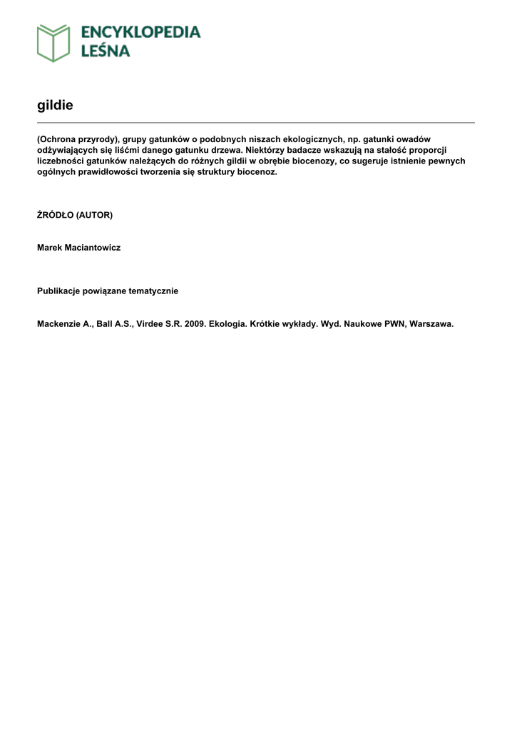 gildie (Ochrona przyrody), grupy gatunków o podobnych niszach ekologicznych, np. gatunki owadów odżywiających się liśćmi danego gatunku drzewa. Niektórzy badacze wskazują na stałość proporcji liczebności gatunków należących do różnych gildii w obrębie biocenozy, co sugeruje istnienie pewnych ogólnych prawidłowości tworzenia się struktury biocenoz. ŹRÓDŁO (AUTOR) Marek Maciantowicz Publikacje powiązane tematycznie Mackenzie A., Ball A.S., Virdee S.R. 2009. Ekologia. Krótkie wykłady. Wyd. Naukowe PWN, Warszawa.