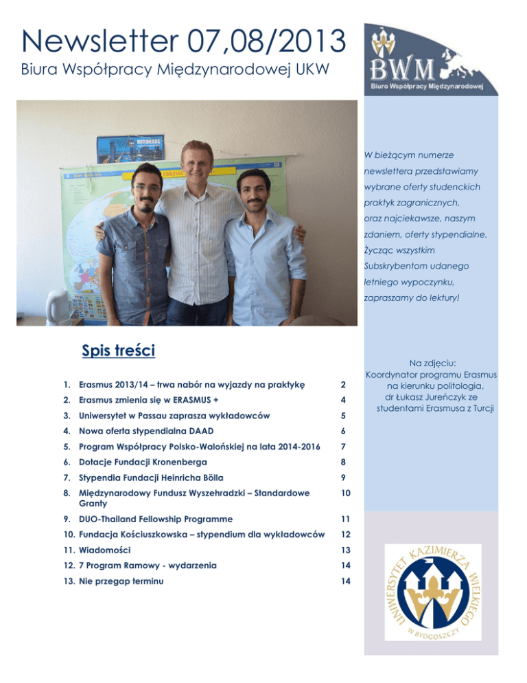 Newsletter 07,08/2013 Biura Współpracy Międzynarodowej UKW W bieżącym numerze newslettera przedstawiamy wybrane oferty studenckich praktyk zagranicznych, oraz najciekawsze, naszym zdaniem, oferty stypendialne. Życząc wszystkim Subskrybentom udanego letniego wypoczynku, zapraszamy do lektury! Spis treści 1. Erasmus 2013/14 – trwa nabór na wyjazdy na praktykę 2 2. Erasmus zmienia się w ERASMUS + 4 3. Uniwersytet w Passau zaprasza wykładowców 5 4. Nowa oferta stypendialna DAAD 6 5. Program Współpracy Polsko-Walońskiej na lata 2014-2016 7 6. Dotacje Fundacji Kronenberga 8 7. Stypendia Fundacji Heinricha Bölla 9 8. Międzynarodowy Fundusz Wyszehradzki – Standardowe Granty 10 9. DUO-Thailand Fellowship Programme 11 10. Fundacja Kościuszkowska – stypendium dla wykładowców 12 11. Wiadomości 13 12. 7 Program Ramowy - wydarzenia 14 13. Nie przegap terminu 14 Na zdjęciu: Koordynator programu Erasmus na kierunku politologia, dr Łukasz Jureńczyk ze studentami Erasmusa z Turcji Nabór na wyjazdy w programie Erasmus w roku akademickim 2013/14 - PRAKTYKA Nadal trwa nabór na wyjazdy na praktykę realizowaną w ramach programu Erasmus w roku akademickim 2013/2014. Student zainteresowany udziałem w rekrutacji na praktykę zobowiązany jest znaleźć zagraniczną instytucję przyjmującą i nawiązać z nią kontakt oraz złożyć w BIURZE WSPÓŁPRACY MIĘDZYNARODOWEJ następujące dokumenty: formularz zgłoszeniowy (dostępny w zakładce Dla studentów) Formularz na wyjazdy na studia dostępny jest w wersji online. Formularz zgłoszeniowy do programu Erasmus należy wypełnić na stronie internetowej erasmus.ukw.edu.pl, wydrukować, podpisać, a następnie uzyskać podpis koordynatora instytutowego (lista koordynatorów znajduje się na stronie biura w zakładce Kontakt). zaświadczenie o średniej z toku studiów (wystawia dziekanat) potwierdzenie znajomości języka (certyfikat, zaświadczenie ze szkoły językowej, lektoratu, itp.) zaświadczenie o dodatkowych osiągnięciach (działalność na rzecz uczelni, udział w programach/projektach międzynarodowych) NIE CZEKAJ, ZGŁOŚ SIĘ JUŻ DZIŚ! Strona 2 erasmus.ukw.edu.pl Newsletter BWM ● Numer 07,08/2013, ● www.bwm.ukw.edu.pl●[email protected] (052) 34 19 108 Studentom zainteresowanym wyjazdem na praktykę polecamy m.in. następujące oferty praktyk: OFERTA PRAKTYKI NA UNIWERSYTECIE W KADYKSIE Szczegóły: praktyka obejmuje pomoc przy organizacji i prowadzeniu kursów językowych, asystowanie wykładowcom przy tworzeniu i wprowadzaniu metod nauczania dwujęzycznego; Kto może ubiegać się o staż: studenci ostatniego roku studiów humanistycznych oraz pedagogicznych (filologie, lingwistyka, psychologia, pedagogika) o biegłej znajomości języka angielskiego, niemieckiego lub francuskiego(poziom C1), mile widziana podstawowa znajomość języka hiszpańskiego oraz doświadczenie pedagogiczne; Termin: praktykę 3-miesięczną (lub dłuższą) należy zrealizować w terminie: 09. 2013- 07.2014 Więcej informacji: Biuro Współpracy Międzynarodowej UKW. STAŻ NA UNIWERSYTECIE CEU CARDENAL DE HERRERA W HISZPANII Szczegóły: 6-miesięczny staż w Biurze Współpracy Międzynarodowej; Kto może ubiegać się o staż: studenci wszystkich kierunków – wymagana średnia znajomość języka hiszpańskiego oraz dobra znajomość języka angielskiego i umiejętność obsługi komputera; Termin: bez ograniczeń; Kontakt: [email protected]; Więcej informacji: uchceu.es; Biuro Współpracy Międzynarodowej UKW. PRAKTYKI W EUROPEJSKIM CENTRUM JĘZYKÓW NOWOŻYTNYCH Szczegóły: praktykanci będą wykonywać zadania w 4 następujących specjalizacjach: internetowej, organizacyjnej, dokumentacyjnej i finansowej; Kto może ubiegać się o staż: studenci II stopnia, z dobrą znajomością języków obcych oraz obsługi komputera; Finansowanie: 686 EUR plus zwrot kosztów podróży (plus stypendium z programu Erasmus) Termin: 30 września; Kontakt: [email protected] Więcej informacji: Europejskie Centrum Języków Nowożytnych w Grazu, ecml.at, eurodesk.pl Strona 3 Newsletter BWM ● Numer 07,08/2013, ● www.bwm.ukw.edu.pl●[email protected] (052) 34 19 108 Erasmus zmienia się w Erasmus + 26 czerwca prezydencja irlandzka poinformowała oficjalnie o nazwie dla nowego programu edukacyjnego na lata 2014-2020. Ostatecznie wybrano nazwę: Erasmus +. Nowy program ma połączyć wszystkie inicjatywy, które dotychczas działały niezależnie, takie jak wszystkie programy sektorowe LLP, Erasmus Mundus, Tempus, "Młodzież w działaniu" oraz - po raz pierwszy program mający na celu rozwijanie inicjatyw związanych ze sportem. Wszystkie te komponenty staną się akcjami nowego programu. Erasmus+ ma składać się z trzech głównych części: edukacji i szkoleń (77,5 proc. budżetu + 3,5 proc. na poręczenia kredytów), inicjatyw młodzieżowych (10 proc. budżetu) oraz inicjatyw sportowych (1,8 proc. budżety). Jak zapowiadają politycy, z nowego programu mają skorzystać nawet 4 miliony Europejczyków, co stanowi liczbę dwa razy Niektóre ze zmian w nowym programie ERASMUS +: - możliwość podpisywania umów między kilkoma uczelniami, - elektroniczny obieg dokumentów, - ograniczenie minimalnego czasu pobytu na praktyce studenckiej do 2 miesięcy - minimalny czas pobytu na wyjeździe pracownika: 2 dni większą od liczby beneficjentów programów w latach 2007-2013. Strona 4 Newsletter BWM ● Numer 07,08/2013, ● www.bwm.ukw.edu.pl●[email protected] (052) 34 19 108 Uniwersytet w Passau zaprasza wykładowców Wydział Humanistyczno-Artystyczny Uniwersytetu w Passau zaprasza wykładowców z całego świata do przyjazdu w ramach programu "International Visiting Scholars Programme". Program ma na celu wzmocnienie współpracy międzynarodowej i wzrost czynnika mobilności akademickiej zarówno uczelni przyjmującej, jak i uczelni wysyłających. W ramach programu goście wizytujący niemiecki uniwersytet zostaną zaznajomien