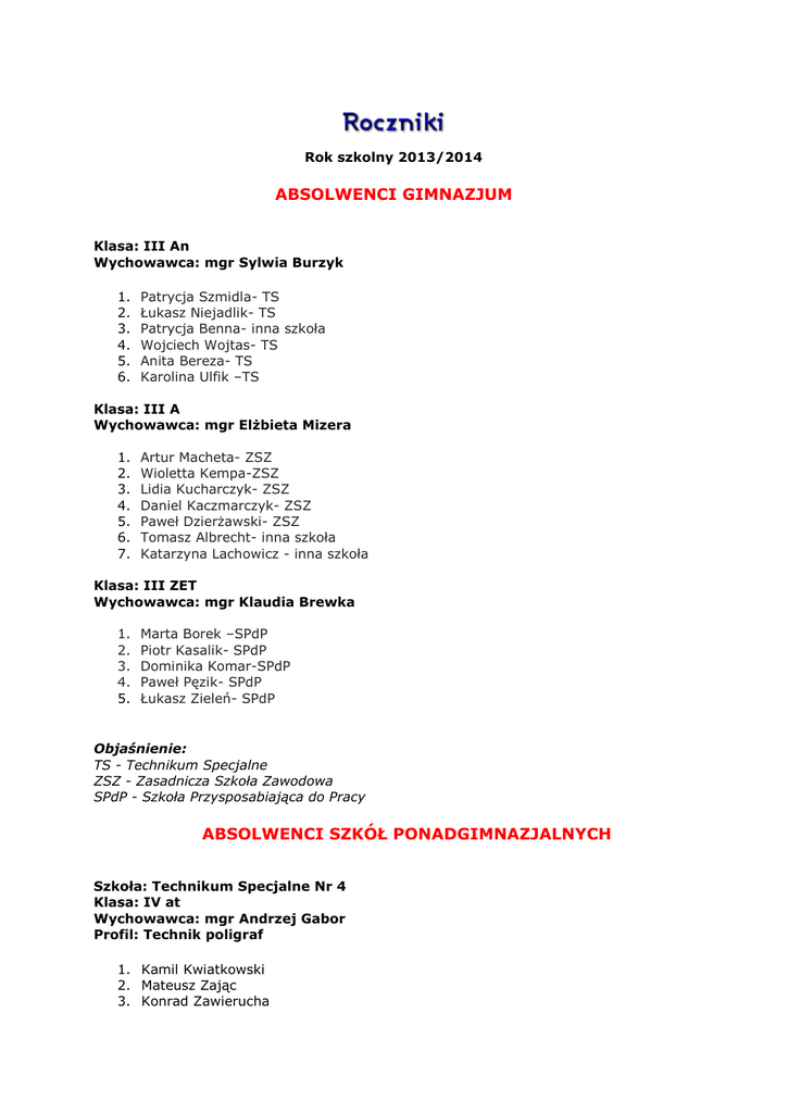 Rok szkolny 2013/2014 ABSOLWENCI GIMNAZJUM Klasa: III An Wychowawca: mgr Sylwia Burzyk 1. 2. 3. 4. 5. 6. Patrycja Szmidla- TS Łukasz Niejadlik- TS Patrycja Benna- inna szkoła Wojciech Wojtas- TS Anita Bereza- TS Karolina Ulfik –TS Klasa: III A Wychowawca: mgr Elżbieta Mizera 1. 2. 3. 4. 5. 6. 7. Artur Macheta- ZSZ Wioletta Kempa-ZSZ Lidia Kucharczyk- ZSZ Daniel Kaczmarczyk- ZSZ Paweł Dzierżawski- ZSZ Tomasz Albrecht- inna szkoła Katarzyna Lachowicz - inna szkoła Klasa: III ZET Wychowawca: mgr Klaudia Brewka 1. 2. 3. 4. 5. Marta Borek –SPdP Piotr Kasalik- SPdP Dominika Komar-SPdP Paweł Pęzik- SPdP Łukasz Zieleń- SPdP Objaśnienie: TS - Technikum Specjalne ZSZ - Zasadnicza Szkoła Zawodowa SPdP - Szkoła Przysposabiająca do Pracy ABSOLWENCI SZKÓŁ PONADGIMNAZJALNYCH Szkoła: Technikum Specjalne Nr 4 Klasa: IV at Wychowawca: mgr Andrzej Gabor Profil: Technik poligraf 1. Kamil Kwiatkowski 2. Mateusz Zając 3. Konrad Zawierucha Szkoła: Technikum Uzupełniające Specjalne Klasa: III ku Wychowawca: mgr Ewa Dąbek Profil: kucharz 1. 2. 3. 4. 5. 6. Patrycja Harazim Paweł Lewandowski Mateusz Reska Paweł Sowa Anna Wręczycka Dorota Tchorek Szkoła: Zasadnicza Szkoła Zawodowa Klasa: III ku1 Wychowawca: mgr Mariola Michna Profil: kucharz 1. 2. 3. 4. 5. Adrian Janeczek Maciej Krysiak Kajetan Mieczkowski Mateusz Stępień Robert Wysocki Szkoła: Technikum Uzupełniające Specjalne Klasa: III f Wychowawca: mgr Elżbieta Melnarowicz Profil: Technik technologii odzieży 1. Anna Chmielarz 2. Natalia Mierzwa 3. Wioletta Salisz Szkoła: Zasadnicza Szkoła Zawodowa Klasa: III cs Wychowawca: mgr Iwona Michorzewska Profil: wielozawodowa 1. 2. 3. 4. 5. Sebastian Bramowski Kamila Janoszka Angelika Mąkos Paweł Saflik Martyna Retig