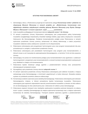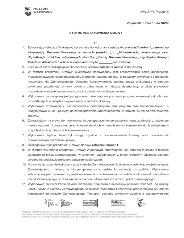 MW/ZP/5/PN/2016 Załącznik numer 13 do SIWZ ISTOTNE POSTANOWIENIA UMOWY §1 1. Zamawiający zleca, a Wykonawca przyjmuje do wykonania usługę Konserwacji sreber i platerów na ekspozycję Muzeum Warszawy w ramach projektu pn. „Modernizacja, konserwacja oraz digitalizacja obiektów zabytkowych siedziby głównej Muzeum Warszawy przy Rynku Starego Miasta w Warszawie” w trzech częściach- część ________zamówienia. 2. Lista muzealiów podlegających konserwacji stanowi załącznik numer 1 do Umowy. 3. W ramach przedmiotu Umowy Wykonawca zobowiązany jest przeprowadzić pełną konserwację muzealiów uwzględniając indywidualny charakter każdego obiektu, jego walory artystyczne i znaczenie historyczne dla Zamawiającego. Działania konserwatorskie podjęte przez Wykonawcę w ramach wykonania przedmiotu Umowy powinny zahamować ich dalszą deteriorację, a także przywrócić muzealiom właściwe walory estetyczne i pozwolić na ich eksponowanie. 4. Wykonawca zobowiązany jest przygotować harmonogram prac oraz program konserwatorski dla prac prowadzonych w związku z wykonaniem przedmiotu Umowy. 5. Wykonawca zobowiązany jest przedstawić harmonogram oraz program prac konserwatorskich, o których mowa w ust.3 powyżej do zaakceptowania Zamawiającemu, w terminie 14 dni od dnia zawarcia Umowy. 6. Zamawiający ma prawo do monitorowania postępu prac konserwatorskich oraz zgodności z ustalonym harmonogramem i programem prac konserwatorskich w ramach komisji konserwatorskich zwoływanych przy obiektach w miejscu ich konserwowania. 7. Wykonawca będzie świadczył usługę zgodnie z postanowieniami Umowy oraz powszechnie obowiązującymi przepisami prawa. 8. Szczegółowy opis przedmiotu Umowy stanowi załącznik numer 1. 9. W ramach wykonania przedmiotu Umowy Wykonawca zobowiązany jest odebrać muzealia z miejsca wskazanego przez Zamawiającego, w terminach uzgodnionych w trybie roboczym. Muzealia zostaną wydane na podstawie protokołu zdawczo-odbiorczego. 10. Konserwacja zostanie wykonana poza siedzibą Zamawiającego. Wykonawca zobowiązany jest wskazać Zamawiającemu miejsce, w którym prowadzona będzie konserwacja muzealiów. Wykonawca zobowiązany jest zapewnić odpowiednie warunki przechowwania muzealiów w okresie od dnia odbioru ich od Zamaiwjącego do dnia zakończenia prac i dokonania ich odbioru przez Zamaiwjącego. 11. Wykonawca zapewni transport oraz niezbędne opakowania muzealiów podczas transportu na własny koszt i ryzyko z siedziby Zamawiającego do miejsca wykonania konserwacji oraz z miejsca wykonania konserwacji do siedziby Zamawiającego. Transport zostanie wykonany zgodnie z postanowieniami Projekt pn. „Modernizacja, konserwacja oraz digitalizacja obiektów zabytkowych siedziby głównej Muzeum Warszawy przy Rynku Starego Miasta w Warszawie”, realizowany w ramach Programu „Konserwacja i rewitalizacja dziedzictwa kulturowego”. Wsparcie udzielone z funduszy norweskich i funduszy EOG, pochodzących z Islandii, Liechtensteinu i Norwegii, oraz środków krajowych MW/ZP/5/PN/2016 rozporządzeniem Ministra Kultury i Dziedzictwa Narodowego z dnia 2 września 2014 roku w sprawie zabezpieczania zbiorów muzeum przed pożarem, kradzieżą i innym niebezpieczeństwem grożącym ich zniszczeniem lub utratą (Dz.U. z 2014 r. poz. 1240). 12. Dokumentacja konserwatorska zostanie wykonana i przekazana Zamawiającemu w dwóch egzemplarzach w wersji papierowej i w wersji elektronicznej na zewnętrznym nośniku danych. 13. Wykonawca oświadcza, iż przedmiot umowy zostanie wykonany przez osoby posiadające właściwości, wskazane w specyfikacji istotnych warunków zamówienia. Wykonawca wskazuje, iż przedmiot Umowy wykonają następujące osoby: a. __________ b. ___________ c. __________ 14. Zmiana osób wskazanych powyżej wymaga pisemnej zgody Zamawiającego. §2 1. Wykonawca zobowiązany jest wykonać przedmiot Umowy w terminie do 30 marca 2016 roku. 2. Wykonawca przystąpi niezwłocznie do wykonania przedmiotu Umowy po odbiorze muzealiów od Zamawiającego. 3. W przypadku nieprzystąpienia do realizacji prac w terminie ustalonym przez Strony, Zamawiający jednokrotnie wezwie Wykonawcę z zachowaniem wskazanych w Umowie form komunikacji, do niezwłocznego przystąpienia do wykonania tych prac. 4. Wykonawca oświadcza, że dysponuje odpowiednim potencjałem techniczno-organizacyjnym, wiedzą i doświadczeniem pozwalającym na należyte wykonanie prac konserwatorskich. 5. Wykonawca zobowiązuje się zrealizować przedmiot Umowy, z najwyższą starannością, efektywnością oraz zgodnie z najlepszą praktyką i wiedzą zawodową. 6. Zakres prac konserwatorskich zrealizowany zostanie przez Wykonawcę w ścisłym współdziałaniu z pracownikami odpowiednich komórek organizacyjnych Zamawiającego, przy zachowaniu zasady dzielenia się z nimi posiadaną wiedzą i doświadczeniem. 7. Wykonawca ma obowiązek udzielania Zamawiającemu na każde żądanie wyjaśnień związanych z wykonaniem prac konserwatorskich. 8. Wykonawca najpóźniej w dniu zawarcia Umowy przedłoży Zamawiającemu kopię polisy ubezpieczeniowej od odpowiedzialności cywilnej na kwotę ____________ złotych. Polisa stanowi załącznik numer 2 do Umowy. Projekt pn. „Modernizacja, konserwacja oraz digitalizacja obiektów zabytkowych siedziby głównej Muzeum Warszawy przy Rynku Starego Miasta w Warszawie”, realizowany w ramach Programu „Konserwacja i rewitalizacja dziedzictwa kulturowego”. Wsparcie udzielone z funduszy norweskich i funduszy EOG, pochodzących z Islandii, Liechtensteinu i Norwegii, oraz środków krajowych MW/ZP/5/PN/2016 §3 1. Ze strony Zamawiającego osobą odpowiedzialną za realizację umowy jest: 2. _________________, tel. _____________, e-mail. _________________ 3. Ze strony Wykonawcy osobą odpowiedzialną za realizację Umowy jest: 4. _________________, tel. _____________, e-mail. _________________. 5. Strony dopuszczają możliwość kontaktu za pośrednictwem pocz