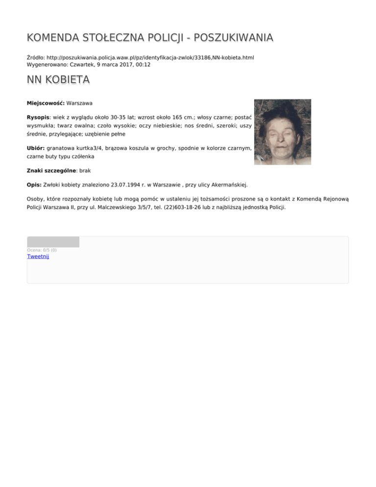 KOMENDA STOŁECZNA POLICJI - POSZUKIWANIA Źródło: http://poszukiwania.policja.waw.pl/pz/identyfikacja-zwlok/33186,NN-kobieta.html Wygenerowano: Czwartek, 9 marca 2017, 00:12 NN KOBIETA Miejscowość: Warszawa Rysopis: wiek z wyglądu około 30-35 lat; wzrost około 165 cm.; włosy czarne; postać wysmukła; twarz owalna; czoło wysokie; oczy niebieskie; nos średni, szeroki; uszy średnie, przylegające; uzębienie pełne Ubiór: granatowa kurtka3/4, brązowa koszula w grochy, spodnie w kolorze czarnym, czarne buty typu czółenka Znaki szczególne: brak Opis: Zwłoki kobiety znaleziono 23.07.1994 r. w Warszawie , przy ulicy Akermańskiej. Osoby, które rozpoznały kobietę lub mogą pomóc w ustaleniu jej tożsamości proszone są o kontakt z Komendą Rejonową Policji Warszawa II, przy ul. Malczewskiego 3/5/7, tel. (22)603-18-26 lub z najbliższą jednostką Policji. Ocena: 0/5 (0) Tweetnij