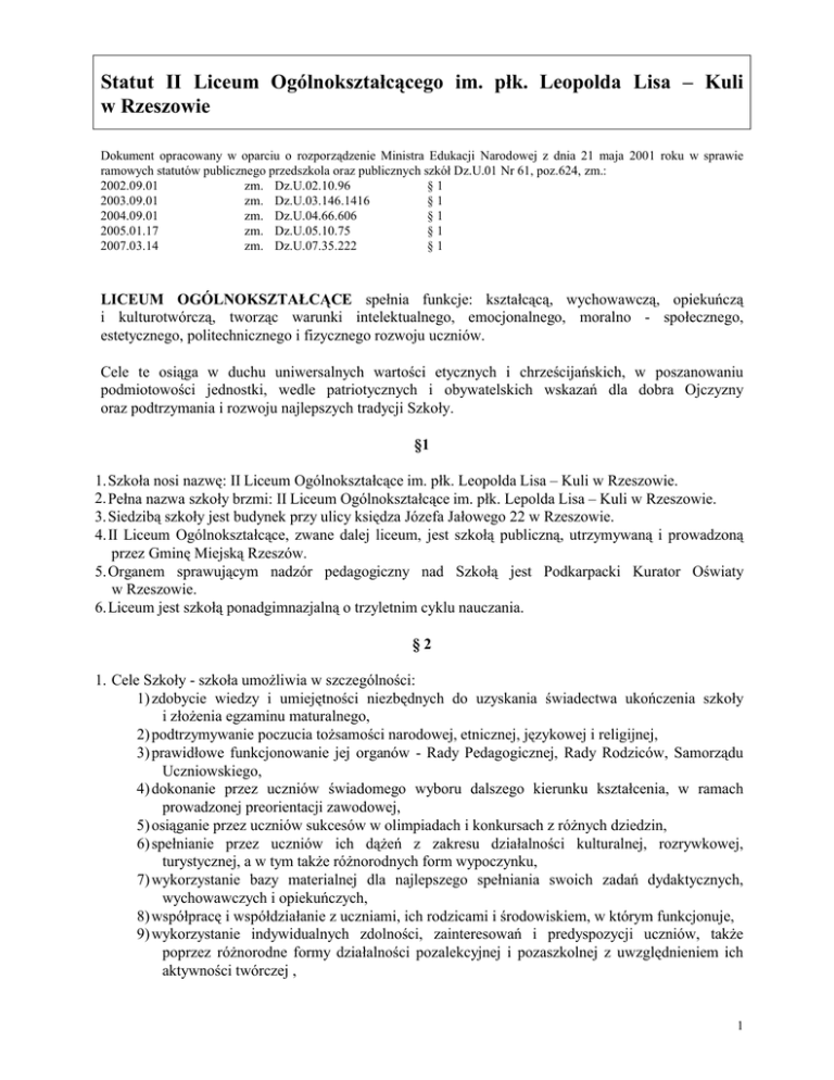Statut II Liceum Ogólnokształcącego im. płk. Leopolda Lisa – Kuli w Rzeszowie Dokument opracowany w oparciu o rozporządzenie Ministra Edukacji Narodowej z dnia 21 maja 2001 roku w sprawie ramowych statutów publicznego przedszkola oraz publicznych szkół Dz.U.01 Nr 61, poz.624, zm.: 2002.09.01 zm. Dz.U.02.10.96 §1 2003.09.01 zm. Dz.U.03.146.1416 §1 2004.09.01 zm. Dz.U.04.66.606 §1 2005.01.17 zm. Dz.U.05.10.75 §1 2007.03.14 zm. Dz.U.07.35.222 §1 LICEUM OGÓLNOKSZTAŁCĄCE spełnia funkcje: kształcącą, wychowawczą, opiekuńczą i kulturotwórczą, tworząc warunki intelektualnego, emocjonalnego, moralno - społecznego, estetycznego, politechnicznego i fizycznego rozwoju uczniów. Cele te osiąga w duchu uniwersalnych wartości etycznych i chrześcijańskich, w poszanowaniu podmiotowości jednostki, wedle patriotycznych i obywatelskich wskazań dla dobra Ojczyzny oraz podtrzymania i rozwoju najlepszych tradycji Szkoły. §1 1.Szkoła nosi nazwę: II Liceum Ogólnokształcące im. płk. Leopolda Lisa – Kuli w Rzeszowie. 2.Pełna nazwa szkoły brzmi: II Liceum Ogólnokształcące im. płk. Lepolda Lisa – Kuli w Rzeszowie. 3.Siedzibą szkoły jest budynek przy ulicy księdza Józefa Jałowego 22 w Rzeszowie. 4.II Liceum Ogólnokształcące, zwane dalej liceum, jest szkołą publiczną, utrzymywaną i prowadzoną przez Gminę Miejską Rzeszów. 5.Organem sprawującym nadzór pedagogiczny nad Szkołą jest Podkarpacki Kurator Oświaty w Rzeszowie. 6.Liceum jest szkołą ponadgimnazjalną o trzyletnim cyklu nauczania. §2 1. Cele Szkoły - szkoła umożliwia w szczególności: 1) zdobycie wiedzy i umiejętności niezbędnych do uzyskania świadectwa ukończenia szkoły i złożenia egzaminu maturalnego, 2) podtrzymywanie poczucia tożsamości narodowej, etnicznej, językowej i religijnej, 3) prawidłowe funkcjonowanie jej organów - Rady Pedagogicznej, Rady Rodziców, Samorządu Uczniowskiego, 4) dokonanie przez uczniów świadomego wyboru dalszego kierunku kształcenia, w ramach prowadzonej preorientacji zawodowej, 5) osiąganie przez uczniów sukcesów w olimpiadach i konkursach z różnych dziedzin, 6) spełnianie przez uczniów ich dążeń z zakresu działalności kulturalnej, rozrywkowej, turystycznej, a w tym także różnorodnych form wypoczynku, 7) wykorzystanie bazy materialnej dla najlepszego spełniania swoich zadań dydaktycznych, wychowawczych i opiekuńczych, 8) współpracę i współdziałanie z uczniami, ich rodzicami i środowiskiem, w którym funkcjonuje, 9) wykorzystanie indywidualnych zdolności, zainteresowań i predyspozycji uczniów, także poprzez różnorodne formy działalności pozalekcyjnej i pozaszkolnej z uwzględnieniem ich aktywności twórczej , 1 10) opiekę nad uczniami przez organizację zajęć korekcyjno – wyrównawczych, a także poprzez umożliwienie uczniom szczególnie uzdolnionym realizowania indywidualnych programów nauczania, w tym także poprzez ukończenie szkoły w skróconym czasie, 11) sprawowanie opieki nad uczniami przebywającymi w szkole podczas zajęć obowiązkowych i nadobowiązkowych, pozalekcyjnych oraz w trakcie wycieczek szkolnych, zgodnie z obowiązującymi przepisami prawa, 12) udzielanie uczniom pomocy psychologicznej, pedagogicznej i materialnej zgodnie z obowiązującym prawem, 13) udzielanie pomocy uczniom niepełnosprawnym. 2. Zadania Szkoły i sposób ich realizacji: 1) w zakresie swojej podstawowej funkcji dydaktycznej szkoła: a) zapewnia kadrę pedagogiczną o pożądanych kwalifikacjach i zgodnie z potrzebami, b) wzbogaca i unowocześnia bazę naukowo - dydaktyczną, c) realizuje programy nauczania z poszczególnych przedmiotów z uwzględnieniem najnowszych metod nauczania, d) wdraża Wewnątrzszkolny System Oceniania opracowany przez zespół zadaniowy ds. organizacyjno – statutowych, e) dopuszcza możliwość wpływu rodziców na treści nauczania poprzez opiniowanie programu i harmonogramu poprawy efektywności kształcenia, nauczycieli na indywidualizację przekazywanej wiedzy, z zastrzeżeniem jakości i efektywności przekazywanych zagadnień, f) wzbogaca formy dydaktyczne umożliwiając uczniom podnoszenie poziomu wiedzy i umiejętności, g) zapewnia uczniom przezwyciężanie trudności w nauce (realizuje program pracy z uczniem mającym trudności w nauce), h) informuje uczniów o zakresach programowych poszczególnych przedmiotów, o wymaganiach na kolejne oceny szkolne, trybie i kryteriach egzaminów, i) umożliwia uczniom wybór przedmiotów ujętych w podstawie programowej w zakresie rozszerzonym i sposobu nauki zgodnie z wymogami rynku pracy, 2) w zakresie popierania uczniów rozwijających swą wiedzę i umiejętności Szkoła: a) zapewnia możliwość rozwoju naukowego przez indywidualizację procesu nauczania, b) wykorzystuje zwiększony zasób wiedzy uczniów i ich indywidualnych zdolności w czasie zajęć szkolnych, c) stwarza warunki do udziału w olimpiadach przedmiotowych, konkursach i zawodach, d) promuje i nagradza sukcesy uczniów na forum szkoły, wobec rodziców oraz środowiska społecznego, e) zapewnia różnorodne sprawdziany wiedzy i umiejętności uczniów, w tym także poprzez propagowanie rywalizacji i współdziałania między klasami, f) publikuje samodzielne opracowania i twórczość uczniów w szkolnych wydawnictwach, 3) w zakresie realizacji obowiązku stosowania indywidualnych form nauczania wobec uczniów szczególnie uzdolnionych szkoła: a) dokonuje selekcji uczniów wyjątkowo uzdolnionych ogólnie i kierunkowo, kontroluje i odpowiada za ich rozwój, b) opracowuje dla nich indywidualne programy nauki, indywidualny tok nauki i system opieki pedagogicznej, c) realizuje szkolny program pracy z uczniem zdolnym, 4) sprzyjając zaspokajaniu i rozwijaniu różnorodnych zainteresowań, uzdolnień i oczekiwań uczniów Szkoła: a) organizuje w miarę posiadanych środków finansowych różnorodne formy zajęć pozalekcyjnych i pozaszkolnych zgodnie z oczekiwani