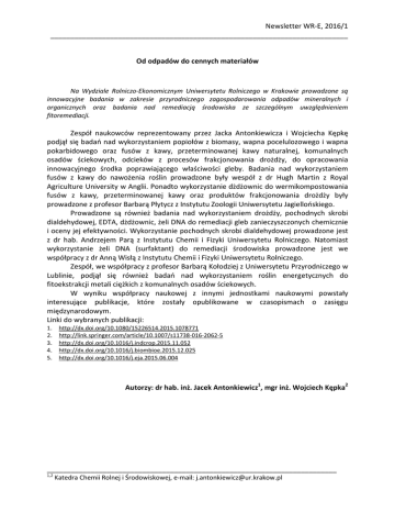 Newsletter WR-E, 2016/1 ___________________________________________________________________________ Od odpadów do cennych materiałów Na Wydziale Rolniczo-Ekonomicznym Uniwersytetu Rolniczego w Krakowie prowadzone są innowacyjne badania w zakresie przyrodniczego zagospodarowania odpadów mineralnych i organicznych oraz badania nad remediacją środowiska ze szczególnym uwzględnieniem fitoremediacji. Zespół naukowców reprezentowany przez Jacka Antonkiewicza i Wojciecha Kępkę podjął się badań nad wykorzystaniem popiołów z biomasy, wapna pocelulozowego i wapna pokarbidowego oraz fusów z kawy, przeterminowanej kawy naturalnej, komunalnych osadów ściekowych, odcieków z procesów frakcjonowania drożdży, do opracowania innowacyjnego środka poprawiającego właściwości gleby. Badania nad wykorzystaniem fusów z kawy do nawożenia roślin prowadzone były wespół z dr Hugh Martin z Royal Agriculture University w Anglii. Ponadto wykorzystanie dżdżownic do wermikompostowania fusów z kawy, przeterminowanej kawy oraz produktów frakcjonowania drożdży były prowadzone z profesor Barbarą Płytycz z Instytutu Zoologii Uniwersytetu Jagiellońskiego. Prowadzone są również badania nad wykorzystaniem drożdży, pochodnych skrobi dialdehydowej, EDTA, dżdżownic, żeli DNA do remediacji gleb zanieczyszczonych chemicznie i oceny jej efektywności. Wykorzystanie pochodnych skrobi dialdehydowej prowadzone jest z dr hab. Andrzejem Parą z Instytutu Chemii i Fizyki Uniwersytetu Rolniczego. Natomiast wykorzystanie żeli DNA (surfaktant) do remediacji środowiska prowadzone jest we współpracy z dr Anną Wisłą z Instytutu Chemii i Fizyki Uniwersytetu Rolniczego. Zespół, we współpracy z profesor Barbarą Kołodziej z Uniwersytetu Przyrodniczego w Lublinie, podjął się również badań nad wykorzystaniem roślin energetycznych do fitoekstrakcji metali ciężkich z komunalnych osadów ściekowych. W wyniku współpracy naukowej z innymi jednostkami naukowymi powstały interesujące publikacje, które zostały opublikowane w czasopismach o zasięgu międzynarodowym. Linki do wybranych publikacji: 1. 2. 3. 4. 5. http://dx.doi.org/10.1080/15226514.2015.1078771 http://link.springer.com/article/10.1007/s11738-016-2062-5 http://dx.doi.org/10.1016/j.indcrop.2015.11.052 http://dx.doi.org/10.1016/j.biombioe.2015.12.025 http://dx.doi.org/10.1016/j.eja.2015.06.004 Autorzy: dr hab. inż. Jacek Antonkiewicz1, mgr inż. Wojciech Kępka2 _________________________________________________________________________ 1,2 Katedra Chemii Rolnej i Środowiskowej, e-mail: [email protected]