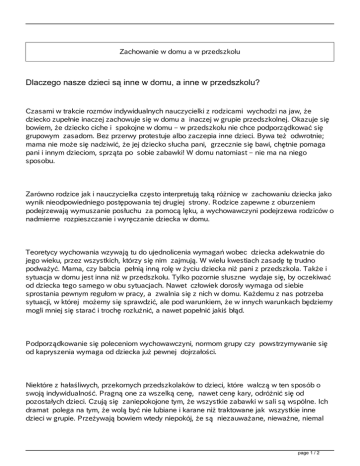 Zachowanie w domu a w przedszkolu Dlaczego nasze dzieci s inne w domu, a inne w przedszkolu? Czasami w trakcie rozmów indywidualnych nauczycielki z rodzicami wychodzi na jaw, e dziecko zupełnie inaczej zachowuje si w domu a inaczej w grupie przedszkolnej. Okazuje si bowiem, e dziecko ciche i spokojne w domu ‒ w przedszkolu nie chce podporz dkowa si grupowym zasadom. Bez przerwy protestuje albo zaczepia inne dzieci. Bywa te odwrotnie; mama nie mo e si nadziwi , e jej dziecko słucha pani, grzecznie si bawi, ch tnie pomaga pani i innym dzieciom, sprz ta po sobie zabawki! W domu natomiast ‒ nie ma na niego sposobu. Zarówno rodzice jak i nauczycielka cz sto interpretuj tak ró nic w zachowaniu dziecka jako wynik nieodpowiedniego post powania tej drugiej strony. Rodzice zapewne z oburzeniem podejrzewaj wymuszanie posłuchu za pomoc l ku, a wychowawczyni podejrzewa rodziców o nadmierne rozpieszczanie i wyr czanie dziecka w domu. Teoretycy wychowania wzywaj tu do ujednolicenia wymaga wobec dziecka adekwatnie do jego wieku, przez wszystkich, którzy si nim zajmuj . W wielu kwestiach zasad t trudno podwa y . Mama, czy babcia pełni inn rol w yciu dziecka ni pani z przedszkola. Tak e i sytuacja w domu jest inna ni w przedszkolu. Tylko pozornie słuszne wydaje si , by oczekiwa od dziecka tego samego w obu sytuacjach. Nawet człowiek dorosły wymaga od siebie sprostania pewnym regułom w pracy, a zwalnia si z nich w domu. Ka demu z nas potrzeba sytuacji, w której mo emy si sprawdzi , ale pod warunkiem, e w innych warunkach b dziemy mogli mniej si stara i troch rozlu ni , a nawet popełni jaki bł d. Podporz dkowanie si poleceniom wychowawczyni, normom grupy czy powstrzymywanie si od kapryszenia wymaga od dziecka ju pewnej dojrzało ci. Niektóre z hała liwych, przekornych przedszkolaków to dzieci, które walcz w ten sposób o swoj indywidualno . Pragn one za wszelk cen , nawet cen kary, odró ni si od pozostałych dzieci. Czuj si zaniepokojone tym, e wszystkie zabawki w sali s wspólne. Ich dramat polega na tym, e wol by nie lubiane i karane ni traktowane jak wszystkie inne dzieci w grupie. Prze ywaj bowiem wtedy niepokój, e s niezauwa ane, niewa ne, niemal page 1 / 2 nie istniej . Wydaje im si , e w grupie zatraca si ich indywidualno , odr bno . Takiemu dziecku mo na pomóc, pozwalaj c mo liwie najcz ciej decydowa po swojemu. Na przykład pozwólmy mu samodzielnie wybra ubranko do przedszkola, sok na półce w sklepie, ksi k , której chciałoby posłucha na dobranoc. Du rol mo e tu odegra wł cznie dzieci do „prac kulinarnych lub plastycznych. Jest to okazja, aby dziecko wykazało swój temperament, pomysłowo . Nabiera te pewno ci, e nie wszystko zale y od dorosłych. Po jakim czasie dziecko poczuje si pewniej i zacznie szuka naturalnej przyjemno ci w przynale eniu do grupy innych dzieci. Chłopiec b dzie chciał z innymi kolegami budowa z klocków, a dziewczynka wspólnie z innymi b dzie bawiła si w dom. Bywa te odwrotnie, e dziecko w domu wobec rodze stwa agresywnie walczy o swoj indywidualno , natomiast w przedszkolu jest spokojne, wyciszone, opanowane ‒ wr cz grzeczne. Cz dzieci, zupełnie jak doro li w pracy, znajduje w przedszkolu jak domowych napi . odskoczni od Jest wi c du o powodów, dla których zachowanie dziecka w domu mo e by ró ne ni w przedszkolu. Je eli ró nica w zachowaniu jest ra ca mo e by to sygnał czego niepokoj cego. Dziecko wysyła nam informacj , e w którym z tych miejsc jest mu zbyt trudno. Takim trudnym miejscem mo e te by dom. Pami tajmy jednak o tym, aby da dziecku mo liwo odreagowania, odpoczynku. W domu niech odpocznie od przedszkola i odwrotnie. Oczywi cie je li dziecko takiego odreagowania wymaga. Przecie my doro li te wymagamy odpoczynku po pracy w zaciszu domowym, a praca pozwala nam zapomnie o domowych kłopotach. Podobnie jest z dzie mi. Je li nie popadamy w skrajno , maj c w domu nieco inne wymagania ni w przedszkolu, uczymy dziecko elastyczno ci i adekwatnego odró niania wymogów sytuacji. page 2 / 2