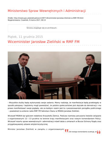 Ministerstwo Spraw Wewnętrznych i Administracji Źródło: http://mswia.gov.pl/pl/aktualnosci/13977,Wiceminister-Jaroslaw-Zielinski-w-RMF-FM.html Wygenerowano: Czwartek, 9 marca 2017, 00:13 Strona znajduje się w archiwum. Piątek, 11 grudnia 2015 Wiceminister Jarosław Zieliński w RMF FM - Wszystkie służby będą wykonywały swoje zadania. Mamy nadzieję, że manifestacje będą przebiegały w sposób pokojowy i będziemy mogli powiedzieć, że polskie społeczeństwo jest dojrzałe do demokracji i ma prawo manifestować swoje poglądy, ale za każdym razem jest to z poszanowaniem porządku publicznego – powiedział na antenie radia RMF FM Sekretarz Stanu w MSWiA Jarosław Zieliński. Wiceszef MSWiA był gościem redaktora Krzysztofa Ziemca. Podczas rozmowy poruszono kwestie związane z organizowanymi 12 i 13 grudnia na terenie kraju manifestacjami oraz nowym komendantem Policji. Wiceszef resortu spraw wewnętrznych i administracji mówił także o zmianach w Biurze Ochrony Rządu oraz przygotowywanej ustawie antyterrorystycznej. Minister Jarosław Zieliński w związku z organizowanymi Od nowego komendanta oczekuję, że manifestacjami podkreślił, że zadaniem Policji będzie zagwarantowanie bezpieczeństwa zarówno uczestnikom jak i osobom postronnym. Wiceszef MSWiA zapewnił, że Policja będzie jednakowo traktowała wszystkie demonostracje, a służby będa w sposób prawidłowy wykonywały swoje zadania. Wczoraj powołany został nowy Komendant Główny Policji insp. Zbigniew Maj. Wiceminister Jarosław Zieliński mówił także o będzie w sposób prawidłowy dowodził tą wielką formacją jaką jest Policja. Liczę na to, że obywatele będą z tej służby zadowoleni. Oczekuję profesjonalizmu, ale także takiego działania żeby podtrzymać i jeszcze zwiększyć społeczną akceptację do działań Policji Jarosław Zieliński oczekiwaniach w stosunku do pracy nowego szefa Policji. - Od nowego komendanta oczekuję, że będzie w sposób prawidłowy dowodził tą wielką formacją jaką jest Policja. Liczę na to, że obywatele będą z tej służby zadowoleni. Oczekuję profesjonalizmu, ale także takiego działania żeby podtrzymać i jeszcze zwiększyć społeczną akceptację do działań Policji – podkreślił wiceszef MSWiA. W dalszej części rozmowy poruszono temat zmian w Biurze Ochrony Rządu. Sekretarz Stanu w MSWiA przyznał, że dziś BOR jest służbą zdekompletowaną kadrowo. - Brakuje między 20%, a 25% składu osobowego funkcjonariuszy. BOR trzeba umocnić, zreformować albo gruntownie zmienić, ale na wnioski jest jeszcze za wcześnie – powiedział wiceminister Jarosław Zieliński. Wiceszef MSWiA mówił także o przygotowywanej ustawie antyterrorystycznej. Podkreślił, że w ciągu tygodnia do resortu mają być przekazane zidentyfikowane pola problemów, które wymagają rozwiązania w tej ustawie. Na ich podstawie zostaną opracowane założenia do ustawy, a następnie jej projekt. Cała rozmowa Na zdjęciu: wiceminister Jarosław Zieliński / fot. RMF FM #1 Na zdjęciu: wiceminister Jarosław Zieliński / fot. RMF FM #2 Na zdjęciu: wiceminister Jarosław Zieliński i red. Krzysztof Ziemiec / fot. RMF FM #3